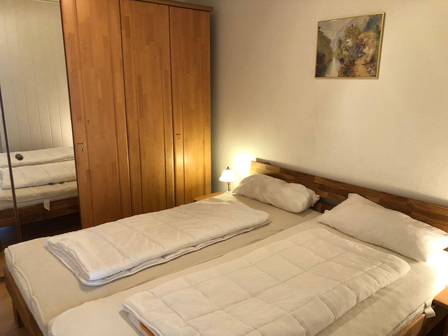 Vom kombinierten, gefliesten Wohn/- Esszimmer mit anschließender Einbauküchenzeile geht es in eines der beiden separaten Schlafzimmer. In diesem innenliegenden, mit Laminat versehenem Schlafzimmer steht Ihnen ein Doppelbett sowie ein großer Kleiderschrank mit Ganzkörperspiegel zur Verfügung.