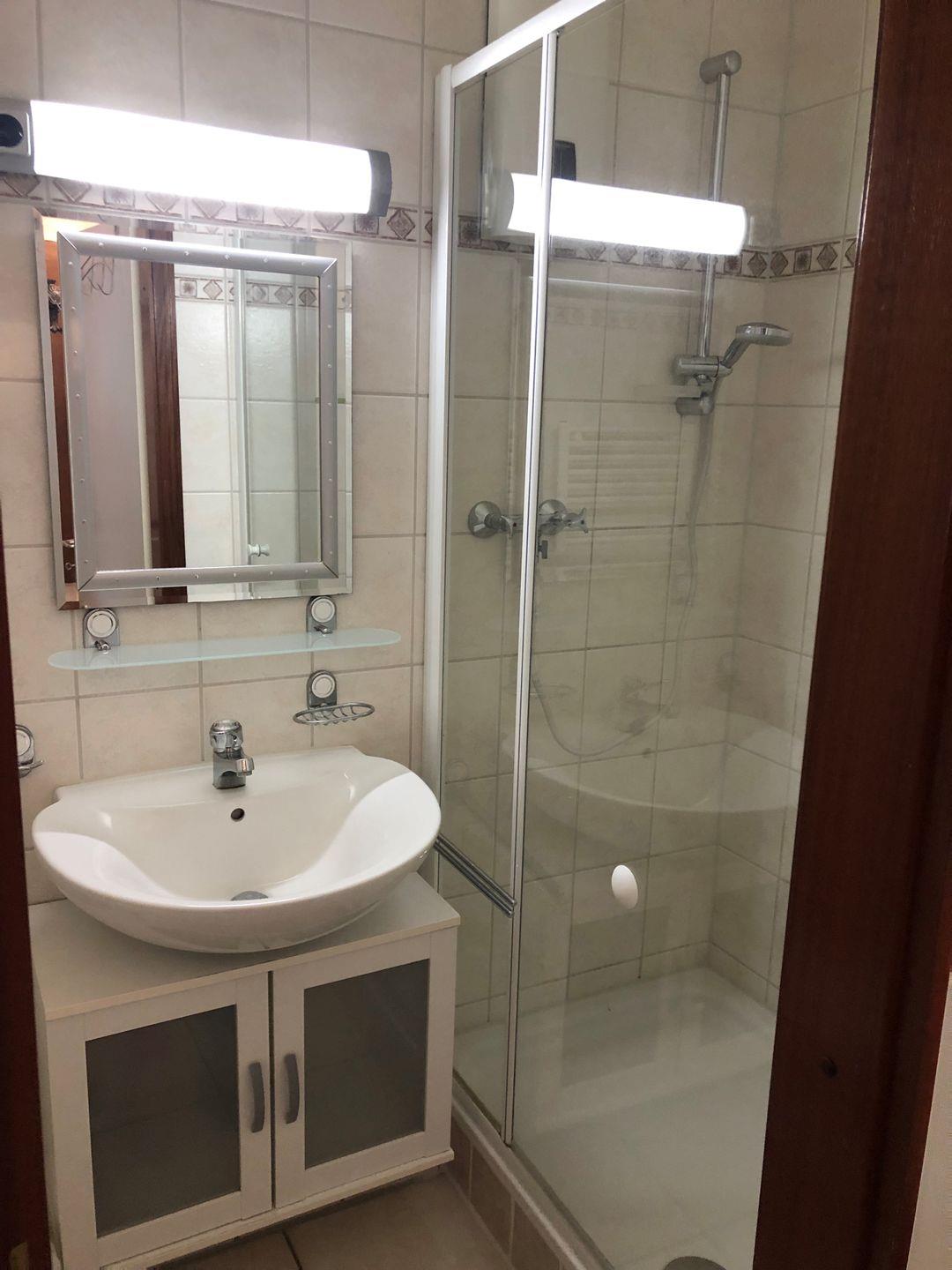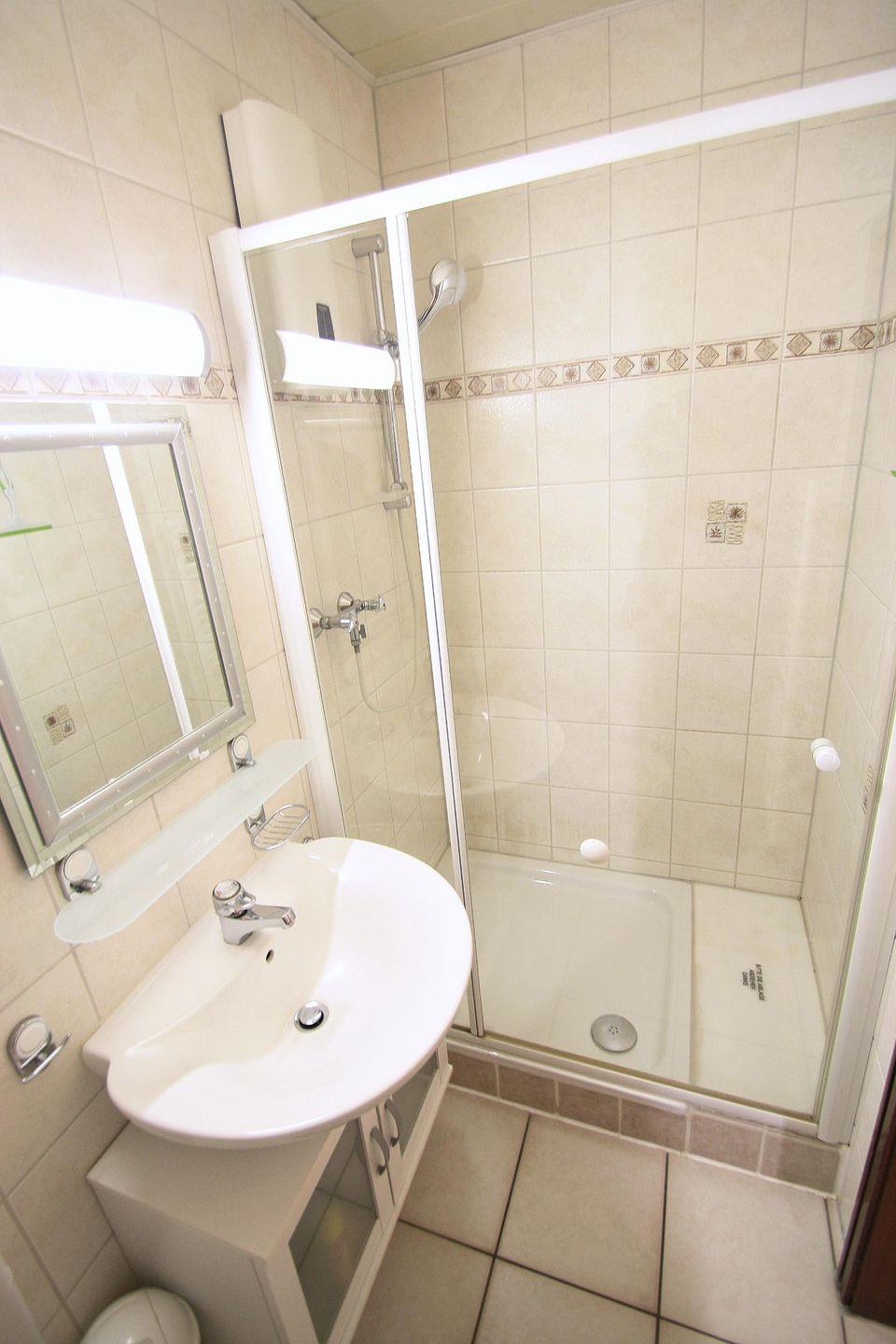 Im innenliegenden Duschbad finden Sie einen Handtuchheizkörper, eine große Duschwanne mit Glaswand und einen beleuchteten Spiegelschrank mit Steckdose.