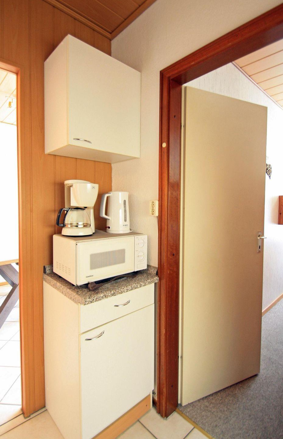 Die Küche ist mit 4-Platten-Herd, Kühlschrank und Microwelle ausgestattet.