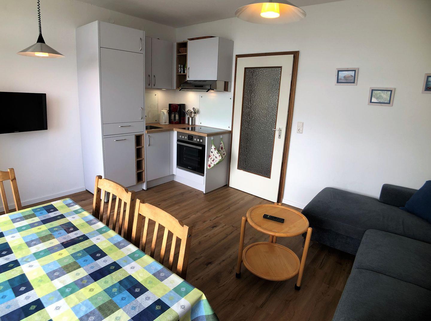 Die neue, kleine Eckeinbauküche im Wohn-/Essbereich ist mit allem Notwendigem ausgestattet um gemeinsame Mahlzeiten zuzubereiten und zu genießen. 4-Feld-Ceranherd, Backofen, Geschirrspüler sowie Kühlschrank mit integriertem Gefrierfach stehen Ihnen zur Verfügung. Der Esstisch am Fenster bietet 4 Personen Platz.