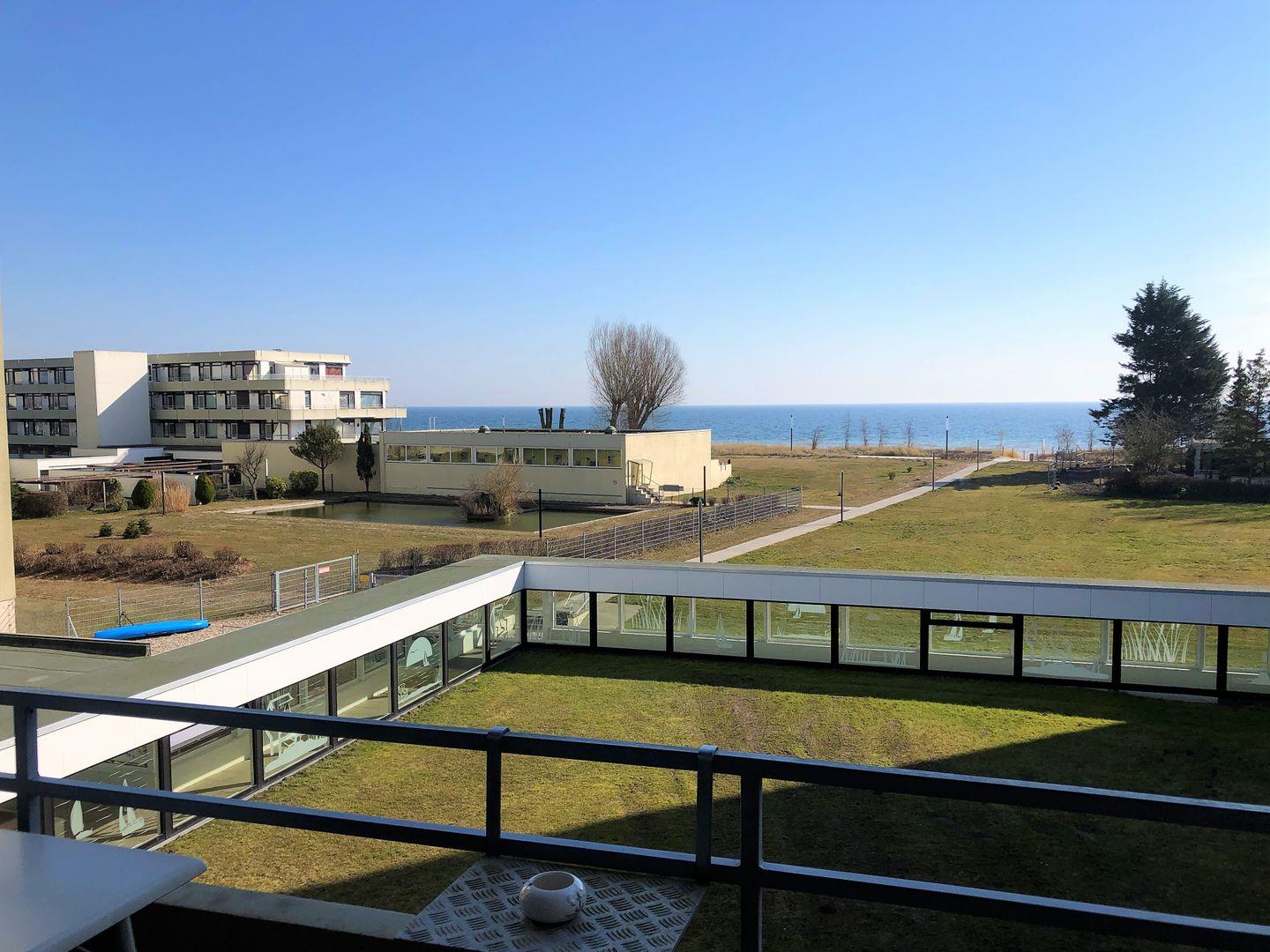 Der Blick aus dem Wohnzimmer führt über den möblierten Balkon direkt zum Meer.