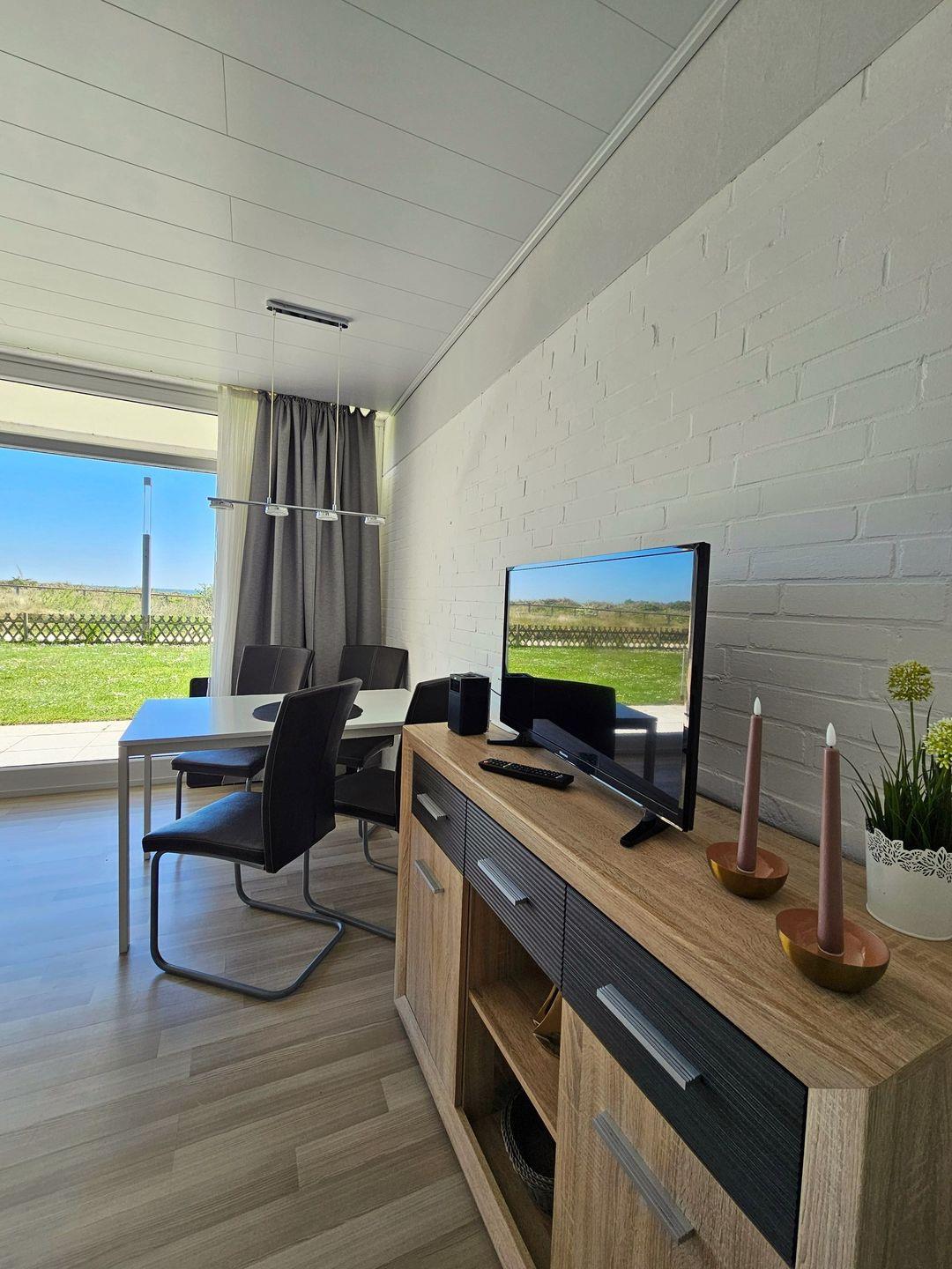 Vom Wohnzimmer mit Küchenzeile, Essplatz für bis zu 4 Personen, großer Sofaecke und TV genießen Sie den Meerblick durch die große Fensterfront und gelangen von hier auf die möblierte Terrasse. Von vormittags bis zum frühen Abend können Sie hier Sonne tanken und beim Blick auf die Promenade, Dünen und Meer entspannen.