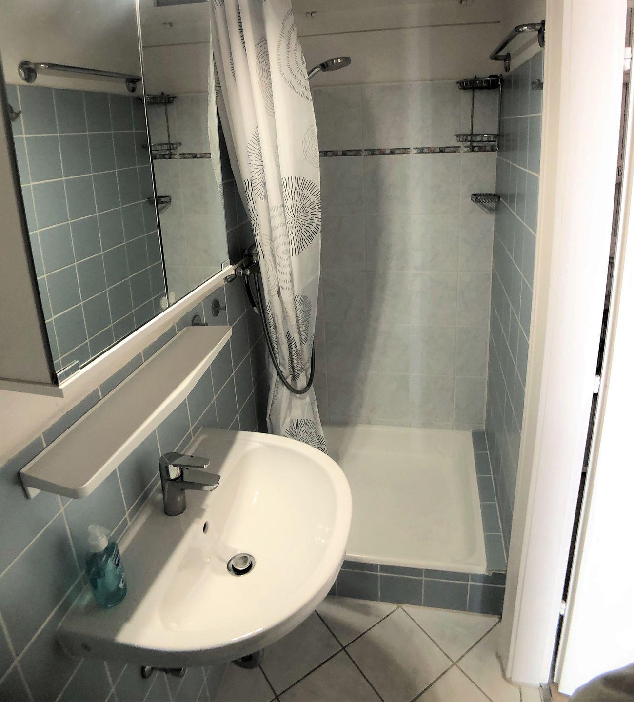 Sie betreten das gemütliche Apartment über einen kleinen Flur von dem ein separates Schlafzimmer mit zwei Einzelbetten (80 cm*190 cm) und das Duschbad abgehen. Dieses ist mit Duschvorhang, Fön und Spiegelschrank mit Steckdose ausgestattet.