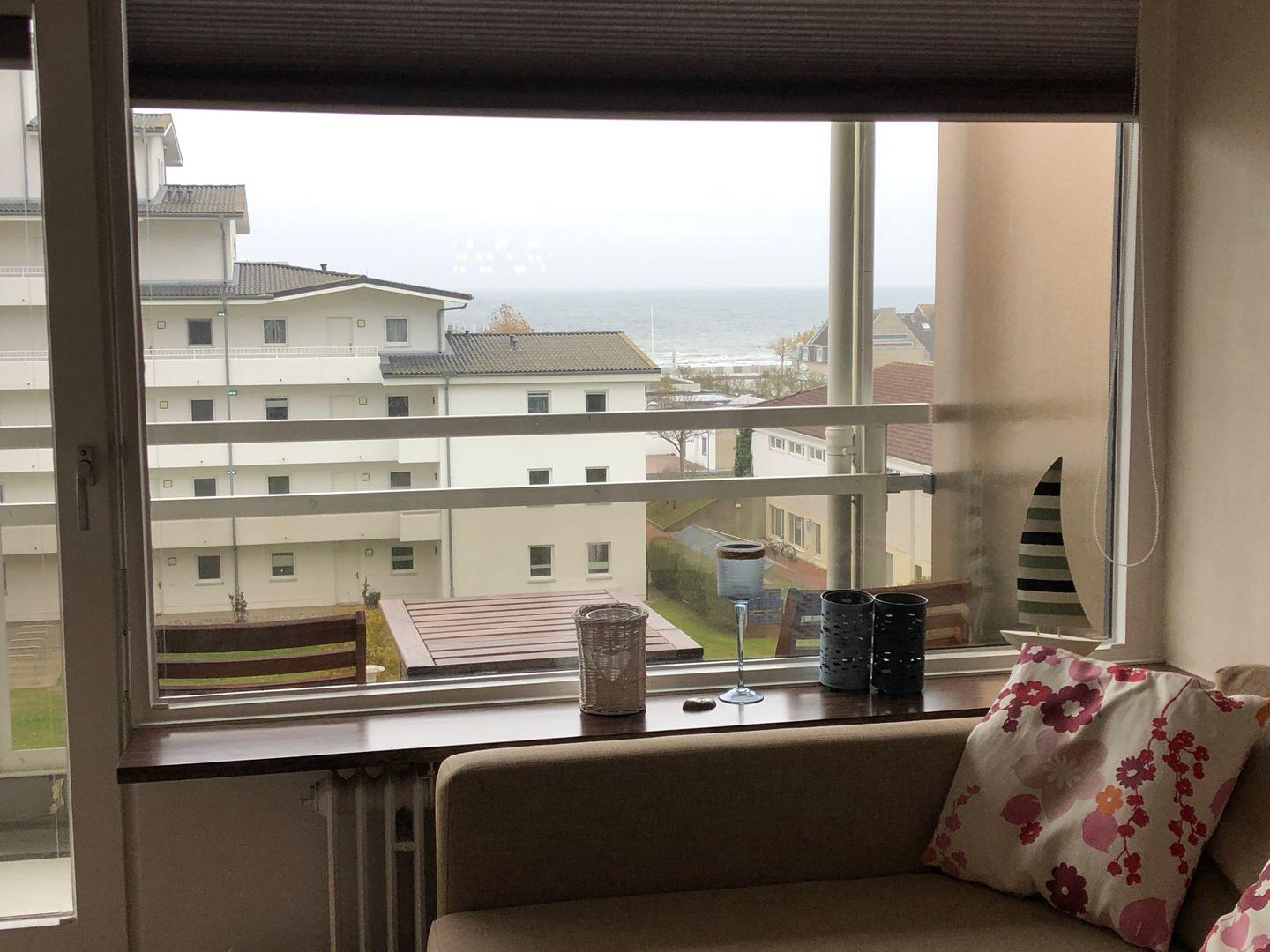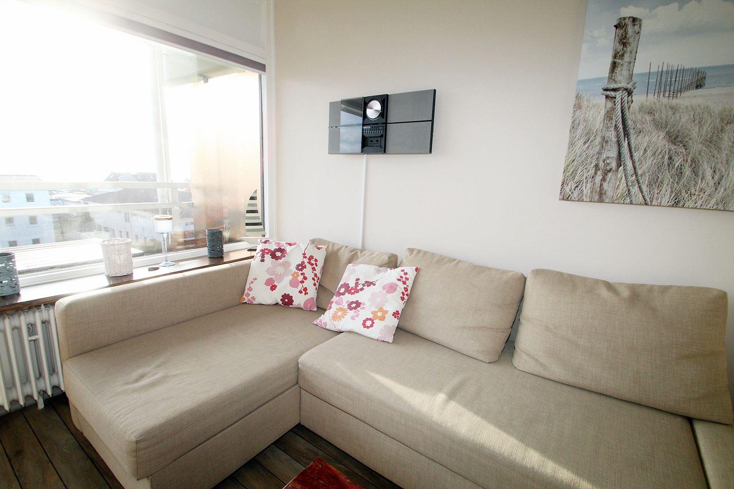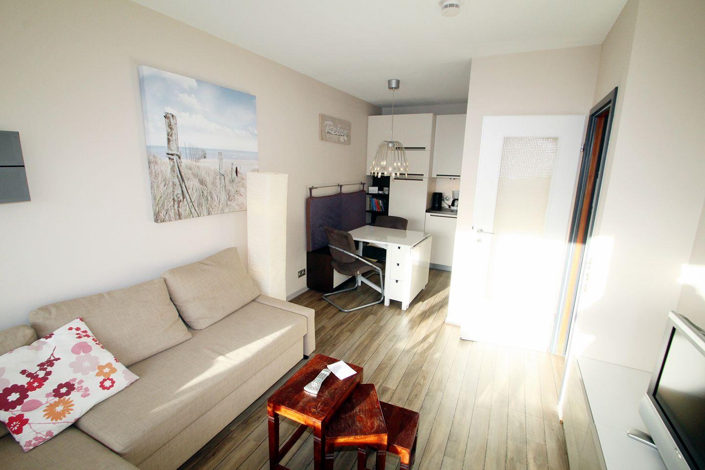 Im Wohnbereich mit Blick auf die Ostsee wartet eine hochwertige L-Couch die über Nacht zu einer bequemen Liegefläche für 2 Personen ausgezogen werden kann.