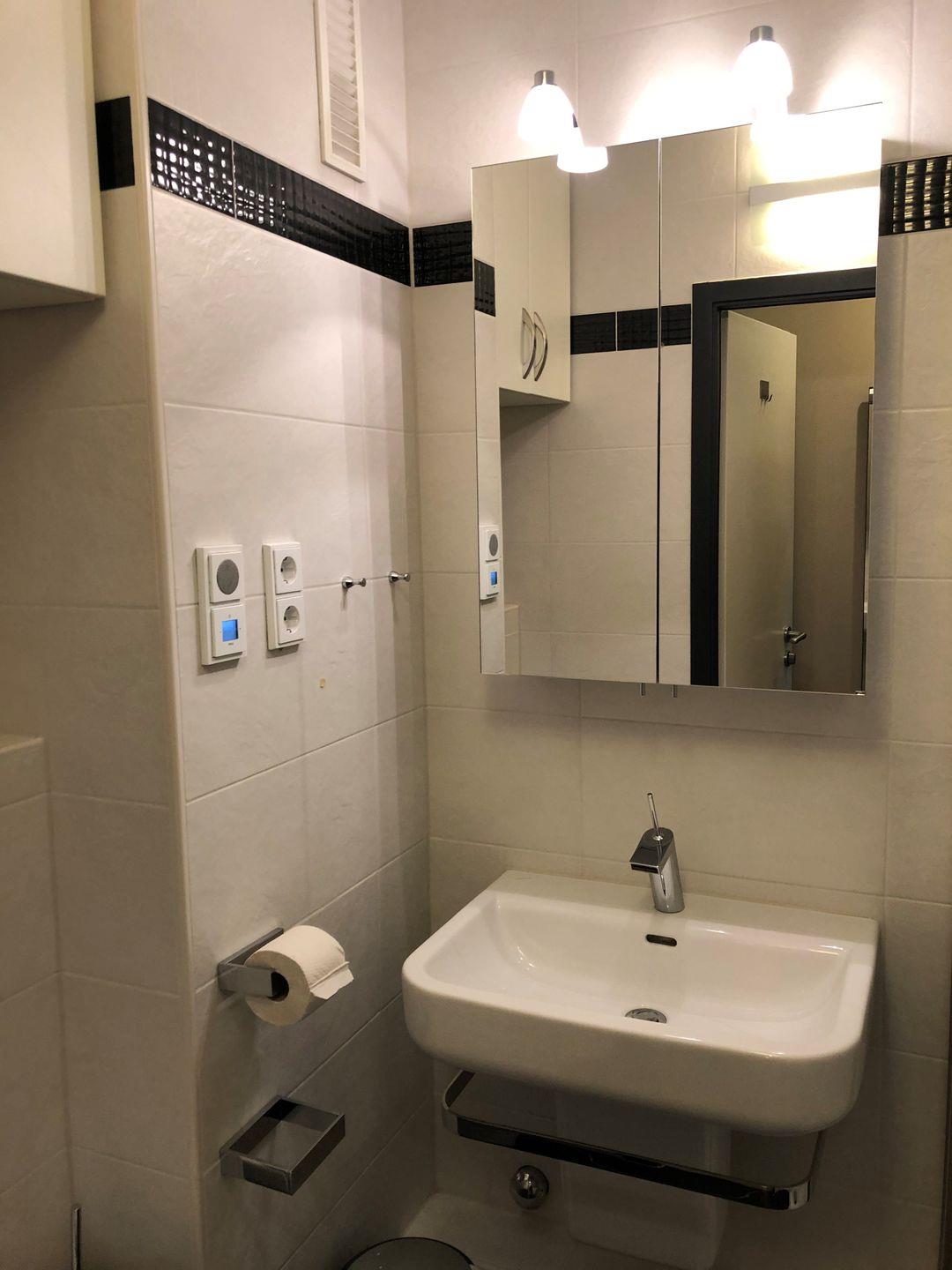 Im kleinen, hochwertig sanierten Badezimmer finden Sie neben dem beleuchteten Spiegelschrank noch zwei weitere Schränke in denen sich auch während einem längeren Aufenthalt jede Menge Stauraum findet. Das innenliegende Bad ist mit einer Glas-Duschkabine ausgestattet. Ein praktische Unterputzradio im Bad bringt mit einem Tastendruck Schwung in Ihren Morgen.