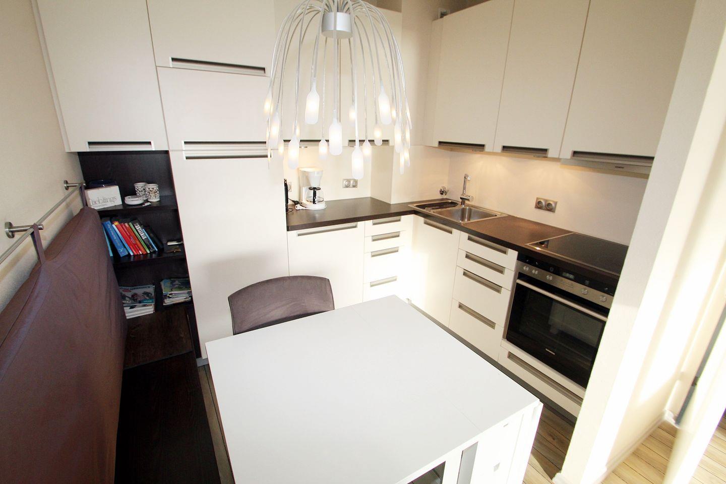 In dem hochwertigen Küchenbereich - mit vollausgestatteter Einbauküche mit Geschirrspüler, Microwelle, Backofen und 4-Feld-Ceranherd - lässt es sich wie Zuhause kochen. An dem ausklappbaren Esstisch verbringen Sie gemütliche Abende bei leckeren Getränken und guten Gesprächen.
