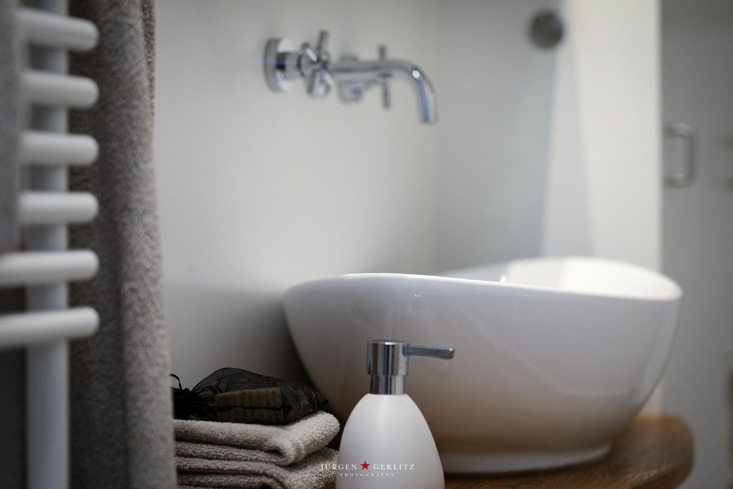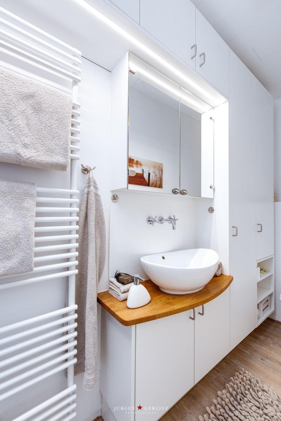 Nebenan finden Sie das sanierte und modern ausgestattete Duschbad mit Handtuchheizkörper, Einbauschränken, Dusche mit flachem Einstieg und Duschvorhang und beleuchtetem Spiegelschrank.