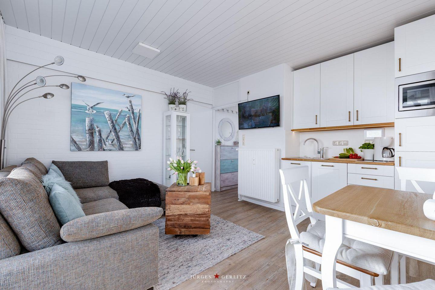 Die im Wohnbereich integrierte Küchenzeile bietet Ihnen mit Ceranherd, Geschirrspülmaschine, Kühlschrank mit Gefrierfach und Microwelle sowie umfassender Kochgeschirrausstattung alle notwendige Hardware um leckere Mahlzeiten zuzubereiten und zu genießen.
