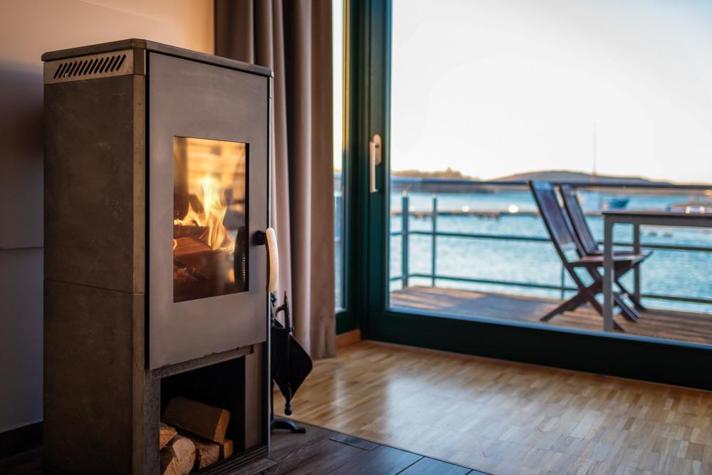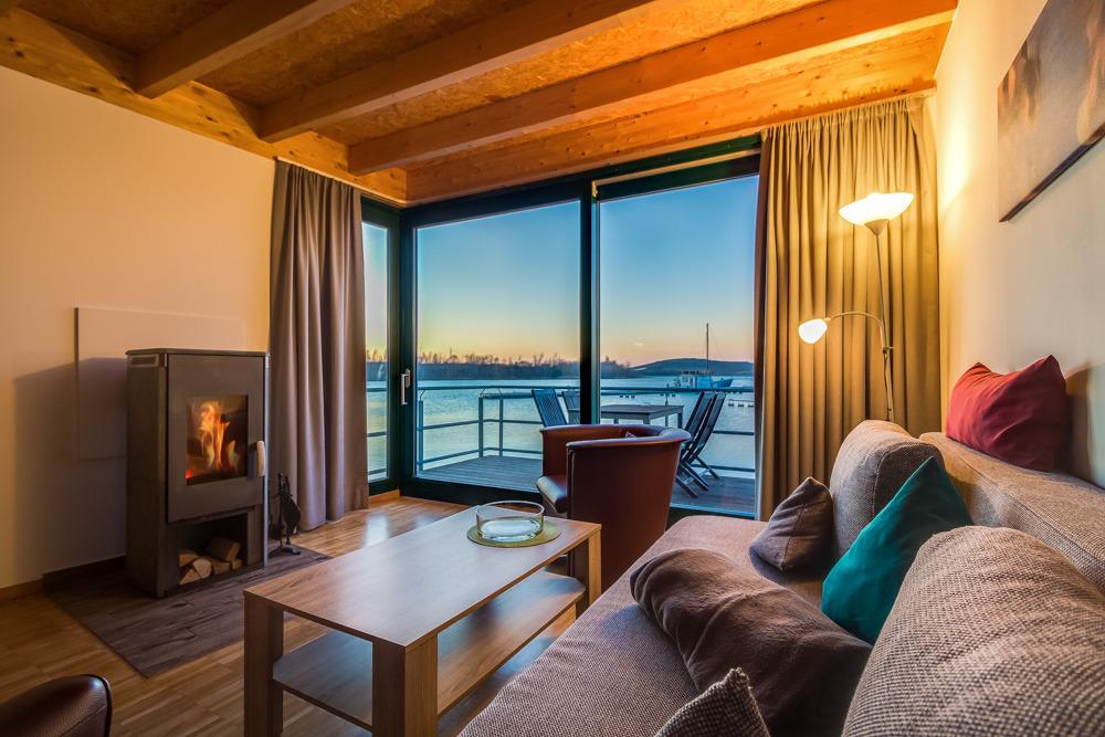 Hafenhaus: Die partiell über dem Wasser stehenden 14 Hafenhäuser im Maisonette-Stil garantieren einen beeindruckenden Blick auf Hafen und Seenlandschaft. Neben Komfort und Funktionalität wird auf über 73 qm vor allem Wohlfühlatmosphäre großgeschrieben. Die großen Panoramafenster ermöglichen den direkten Terrassenzugang und sorgen vor allem in den Abendstunden für eine wärmende Lichtstimmung.