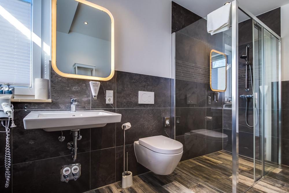 - Badezimmer mit WC und ebenerdiger Dusche sowie Fön