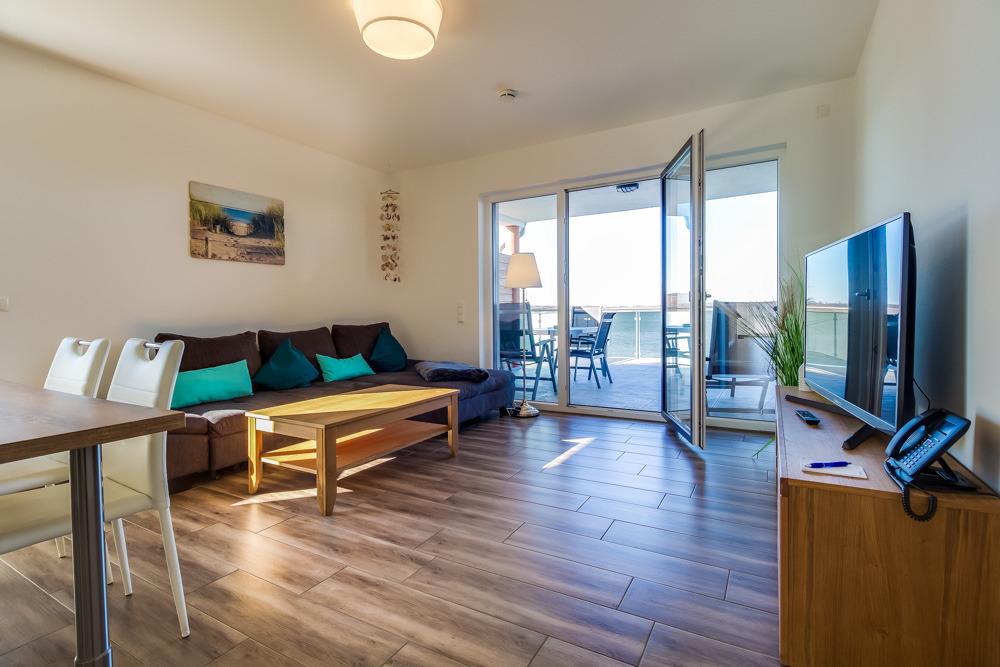 Die großzügigen Ferien-Appartements sind jeweils mit einem Schlafzimmer (mit einem Doppelbett 160 x 200 cm), einem Badezimmer mit Dusche/WC und einem offen großzügigen Wohn-/Essbereich ausgestattet. Die komplett eingerichtete Einbauküche sowie die bequeme Wohnlandschaft und der angrenzende Balkon mit Hafenblick runden das Wohlfühlangebot ab.