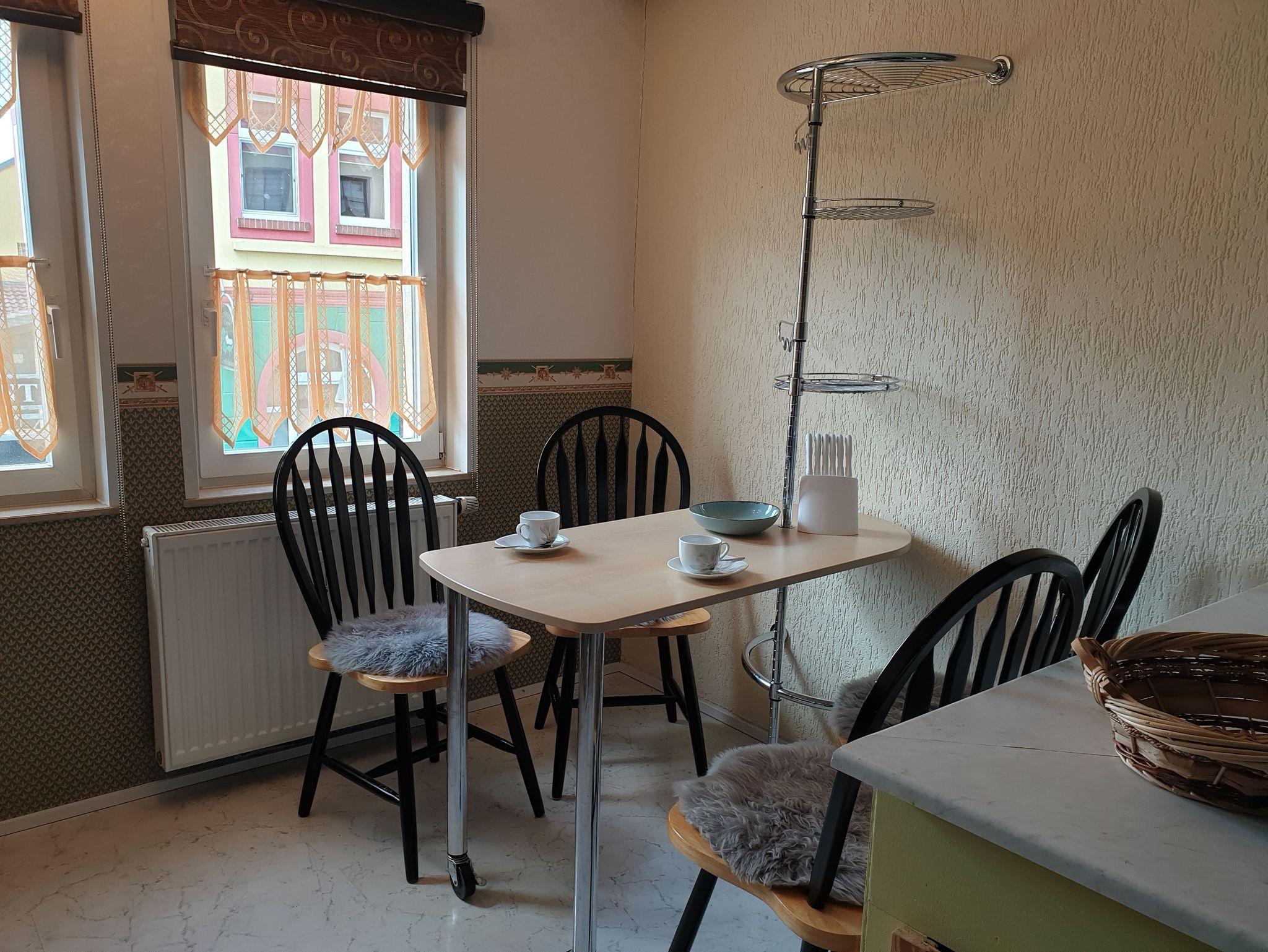 Im Oberen Bereich befindet sich ebenfalls die Wohnküche, in der sich die Küchenzeile mit Sitzecke befindet und eine Wohnlandschaft mit TV zum verweilen. Die Küche ist umfangreich ausgestattet und ermöglicht somit die Unabhängigkeit einer gastronomischen Versorgung. Dennoch haben sie in 100m Entfernung die Möglichkeit zum frühstücken in einer Bäckerei.