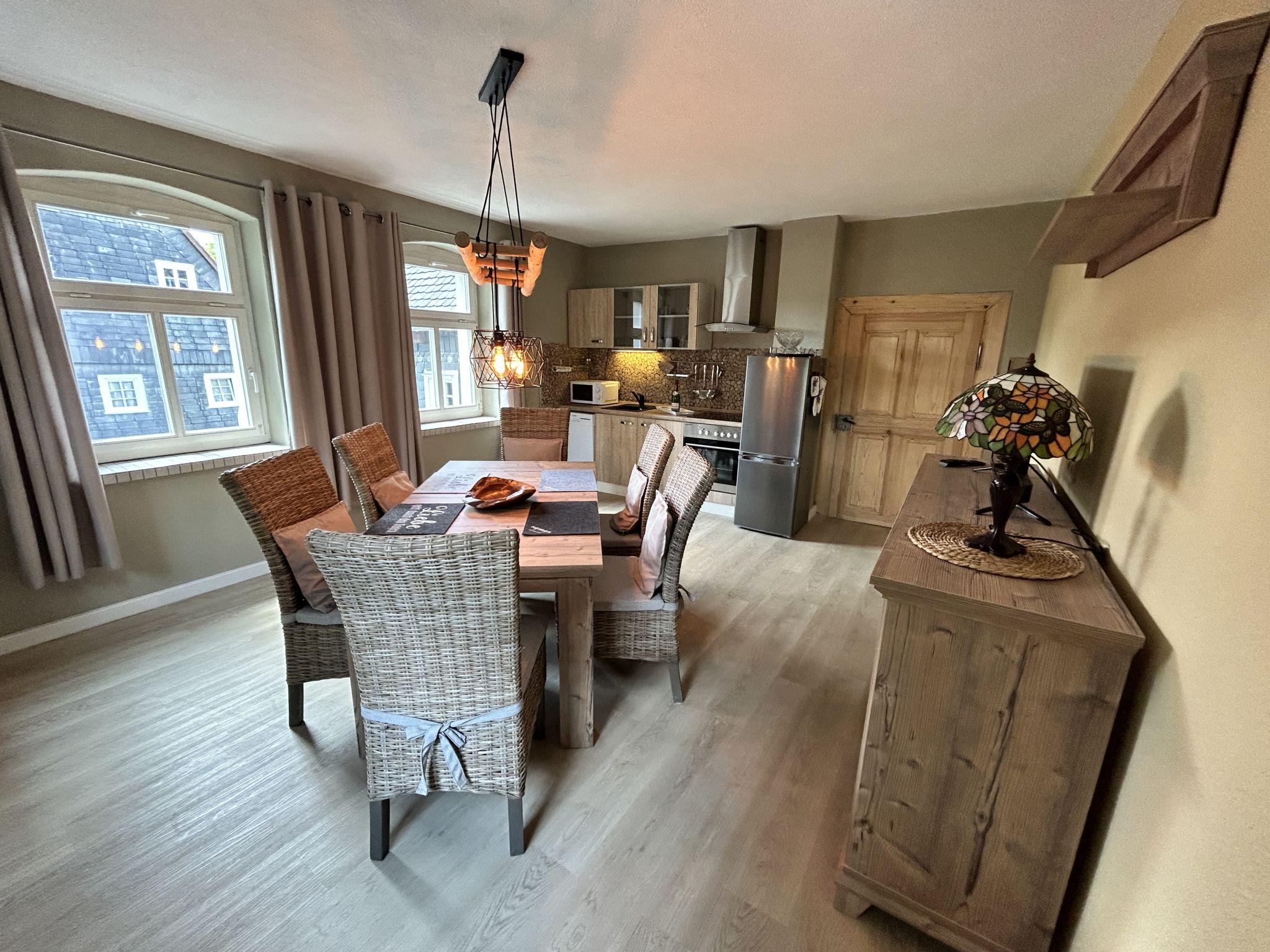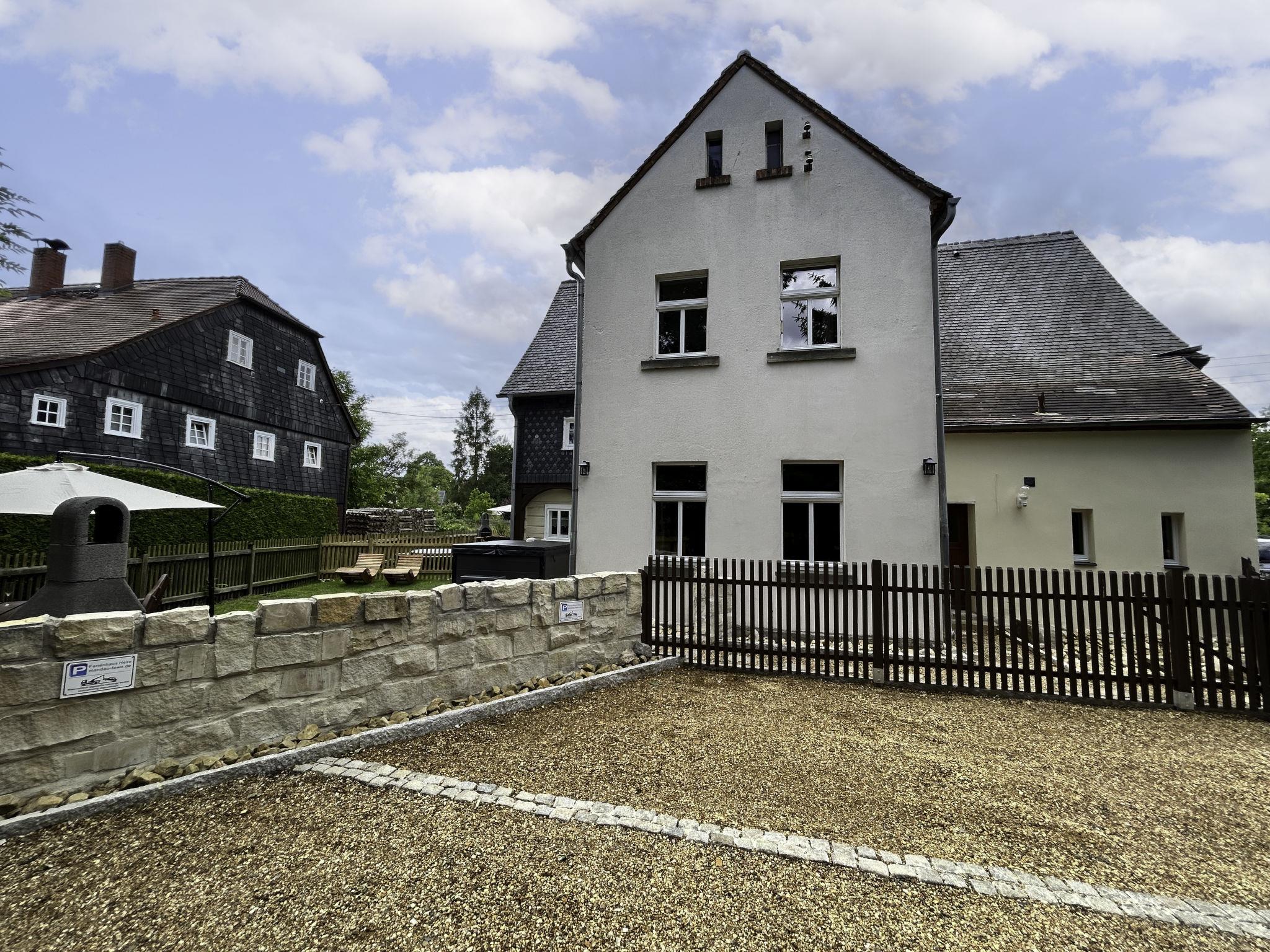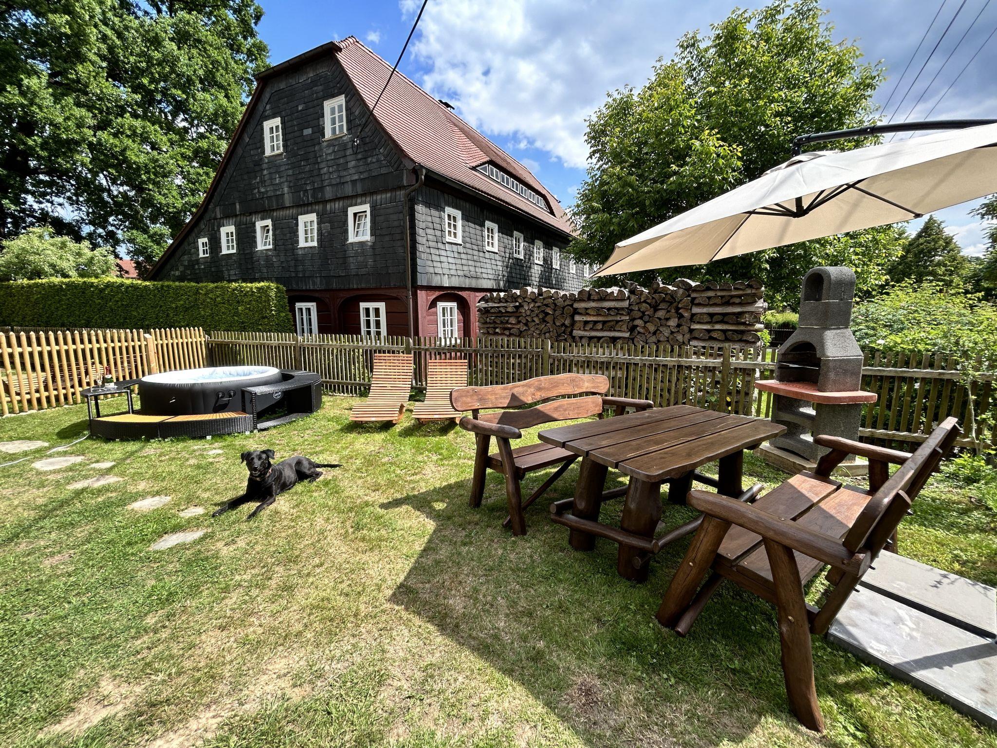 Historical 2-family house, 2 storeys, built in 1790, renovated in 2022. 500 m from the centre of Großschönau, 12 km from the centre of Zittau, 30 km from the centre of Löbau, 20 m from the river. For shared use: natural state property (fenced). Private: hot tub. Bread roll service. Shop 500 m, supermarket 200 m, restaurant 400 m, bakery 300 m, bus stop "Großschönau Weinhaus" 700 m, railway station "Großschönau Bahnhof" 1.5 km, outdoor swimming pool 1.5 km, bathing lake "Olbersdorfer See" 13 km. Walking paths from the house 5 m, ski lift 4 km, ski school 4 km, cross country ski track 4 km. Well-known ski regions can easily be reached: Waltersdorf 4 km. Well-known lakes can easily be reached: Olbersdorfer See 13 km. Please note: Additional accommodations can be booked.