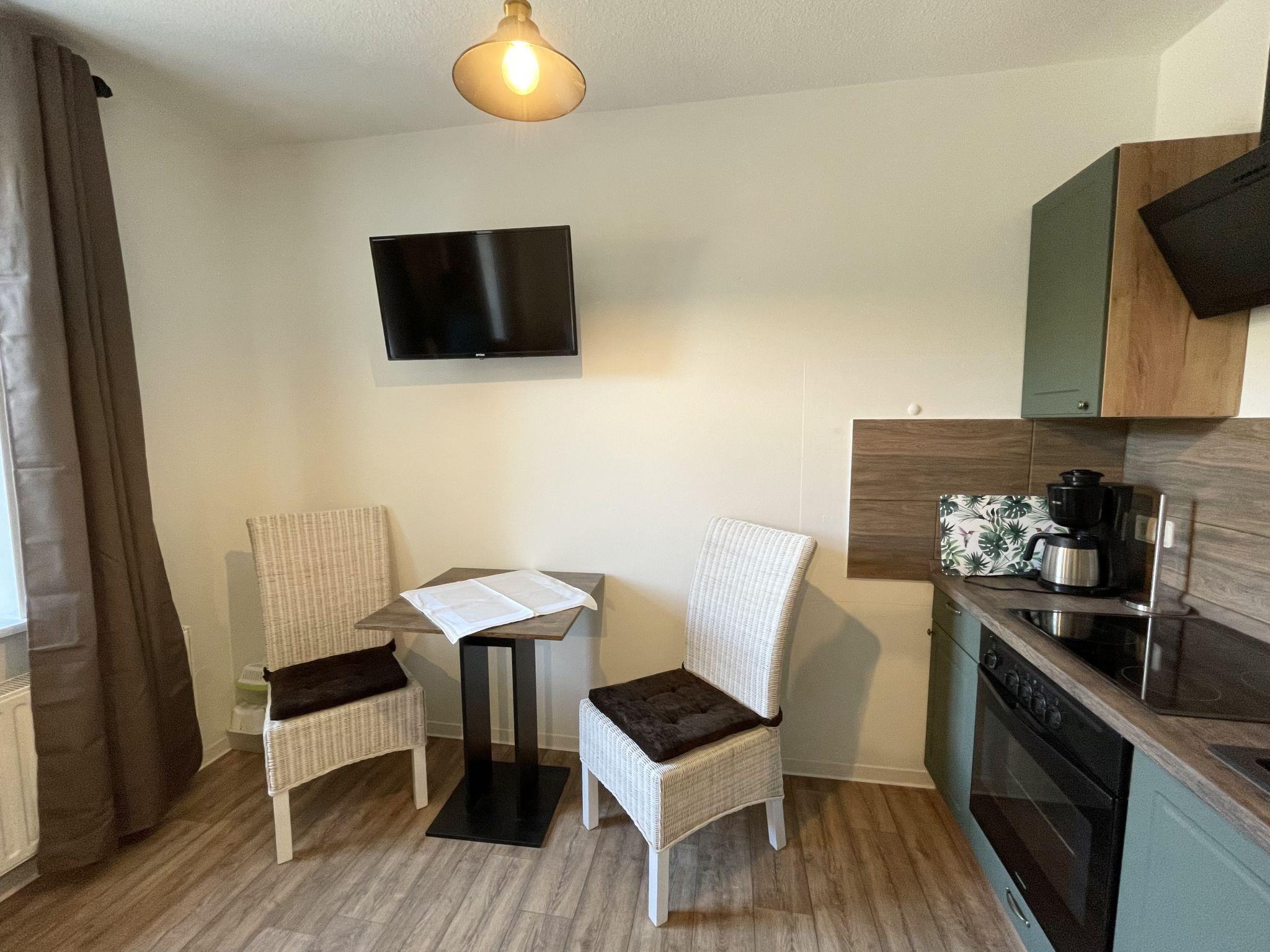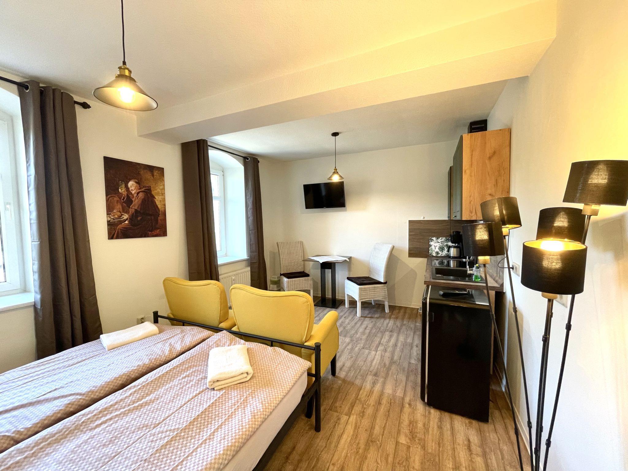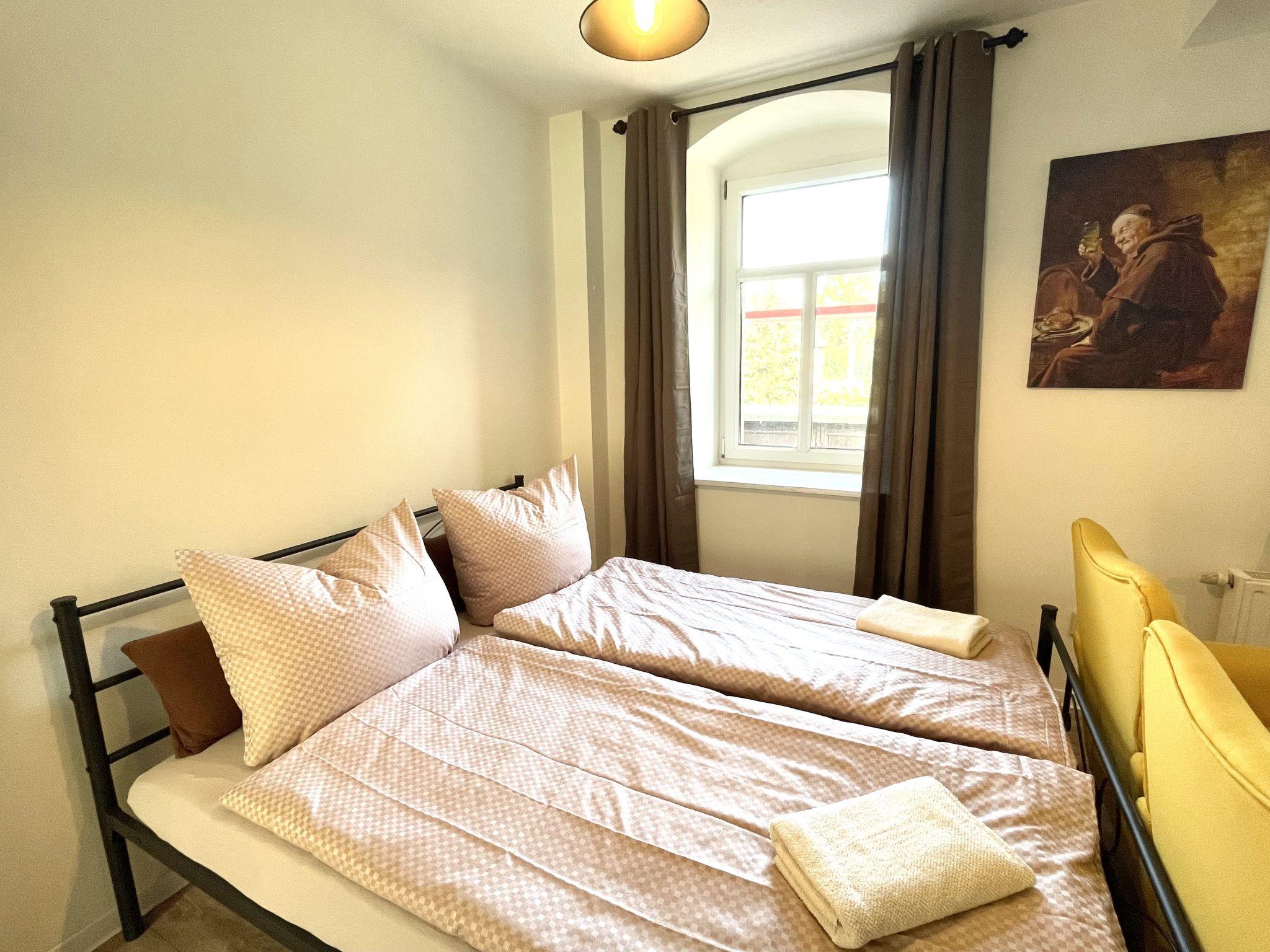 "Krabat", 1-room apartment 22 m2, on the ground floor. Beautiful and tasteful furnishings: living/sleeping room with 1 double bed (160 cm, length 200 cm), dining table and satellite TV (flat screen). Kitchenette (oven, 4 ceramic glass hob hotplates, electric coffee machine). Shower/WC. Heating. Beautiful view of the town. Parking (1 car) at the house. Please note: non-smokers only. Maximum 1 pet/ dog allowed. Smoke alarm.