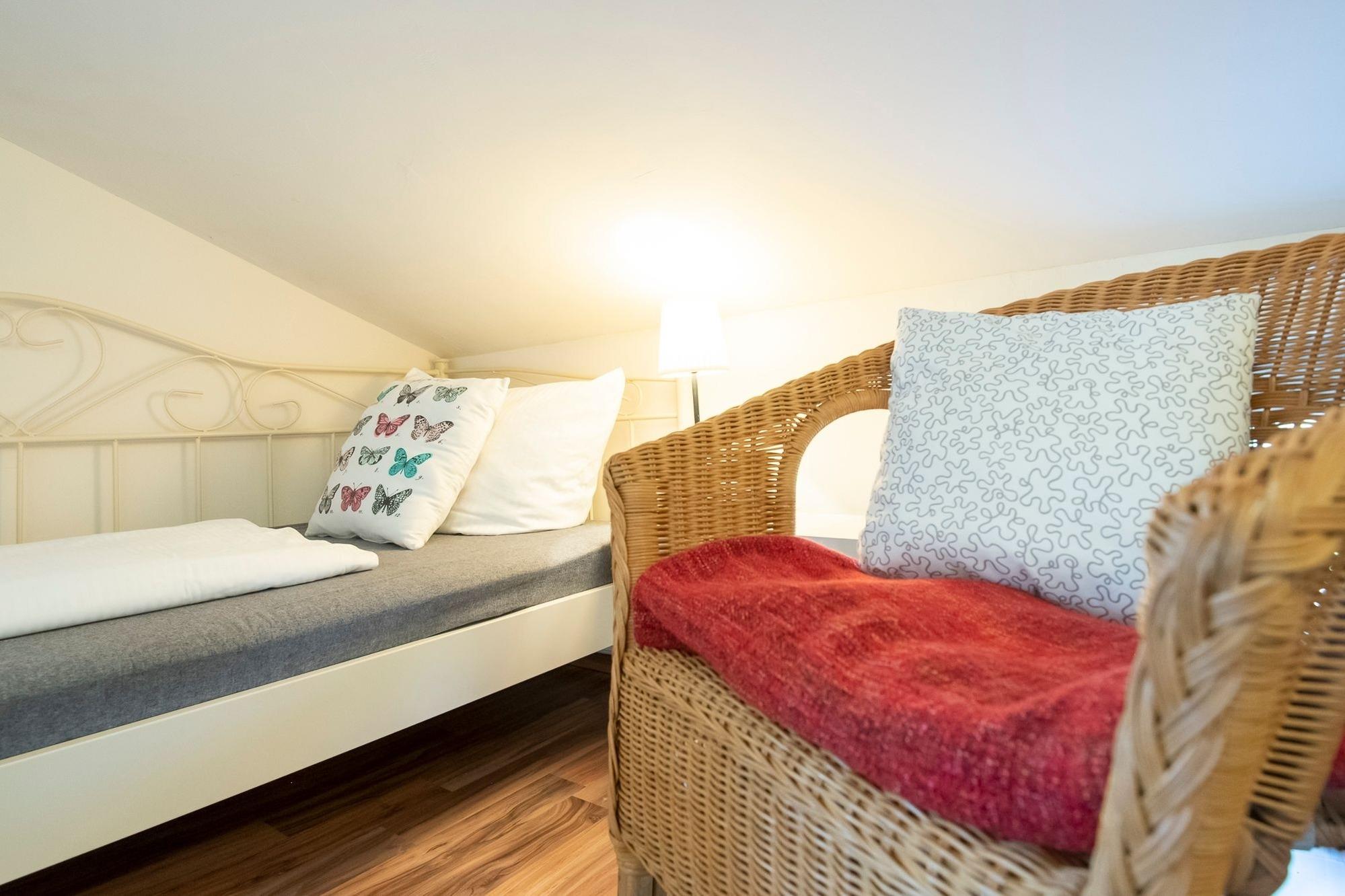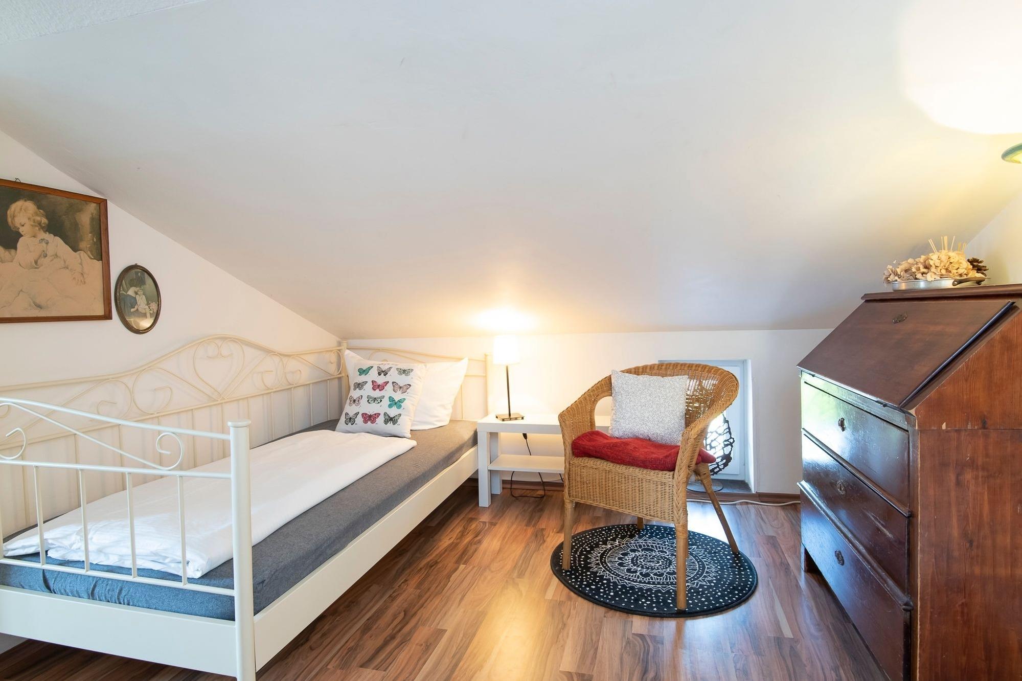 Im Erdgeschoss befinden sich das liebevoll eingerichtete Wohn- und Esszimmer, in dem Sie gesellige Urlaubsstunden verbringen können. Angrenzend liegt die voll ausgestattete Küche, in der Sie alles finden, um sich auch im Urlaub bequem selbst zu verpflegen. Von hier aus gelangen Sie direkt zur überdachten Terrasse, auf der Sie von morgens bis abends den Sonnenschein genießen können. Für Abwechslung auf dem Speiseplan sorgt der gemauerte Steingrill, auf dem Sie Ihr Grillgut zubereiten können. Der abgeschlossene Garten liegt hinter dem Haus und bietet Erholung und Ruhe. Vom kleinen (unbeheizten) Wintergarten aus haben Sie einen herrlich weiten Blick über die Felder bis zur Gruber Kirche, die nachts eindrucksvoll beleuchtet wird. Im Obergeschoss können Sie sich im ersten großen Schlafzimmer mit Doppelbett (2x 90x200 cm) und Kleiderschrank nach einem ereignisreichen Urlaubstag zum Träumen zurückziehen. Ein weiteres kleines Schlafzimmer lädt mit einem Schlafsofa (160x200 cm) ebenfalls zu erholsamen Nächten ein. Vor dem Schlafen können Sie sich hier noch durch das Fernsehprogramm zappen. Auf der Treppen-Empore befindet sich ein Einzelbett (90x200 cm).