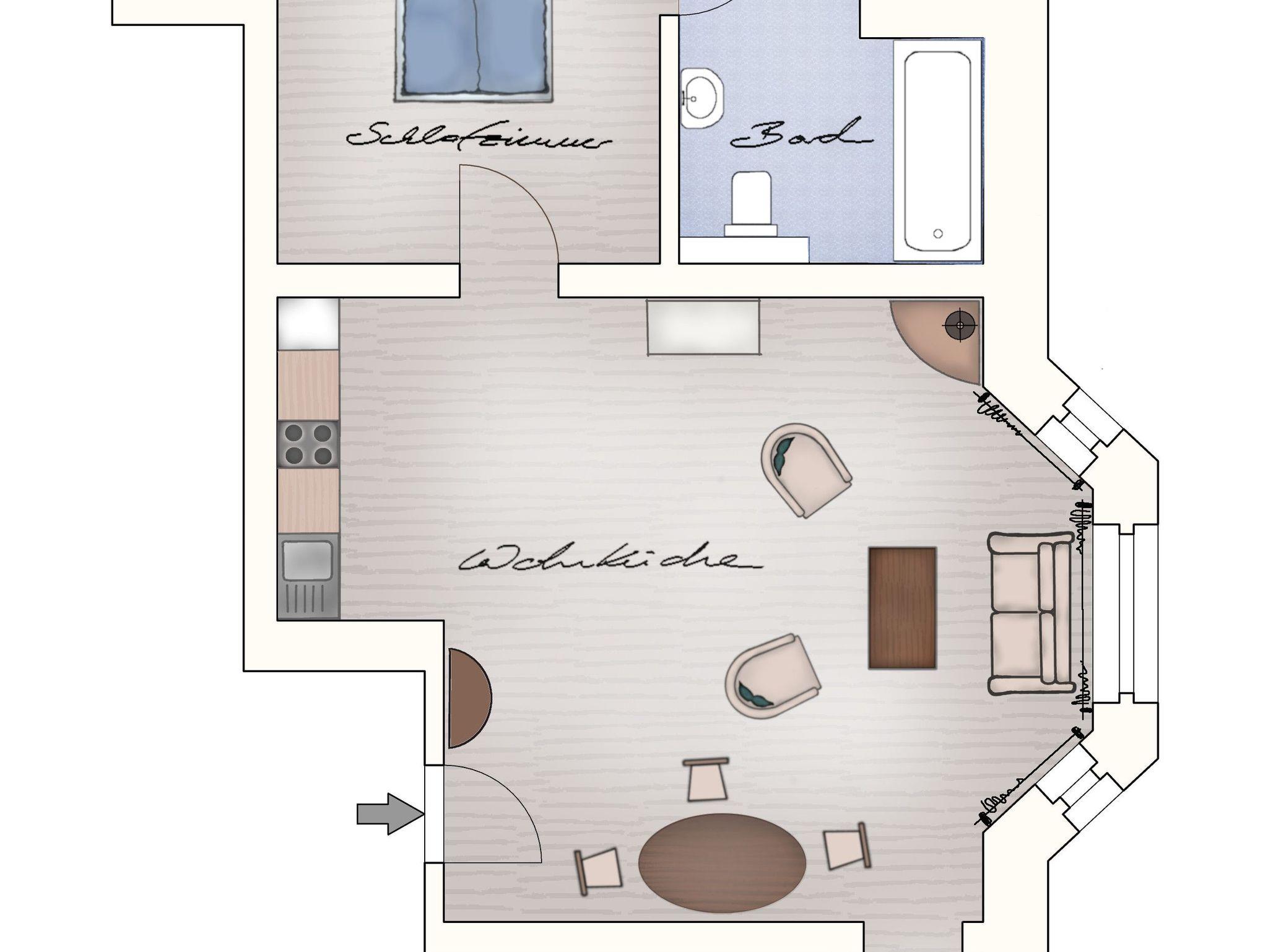 Die Ferienwohnung Nr. 1 befindet sich im Parterre / Souterrain des schönen Gutshauses. Die Wohnung für bis zu zwei Personen und in einer Größe von 50 m² ist mit Liebe zum Detail eingerichtet und besteht aus zwei Zimmern: Ein großes Wohnzimmer mit offener Küche (hochwertige Siemens-Geräte), ein großzügiges Schlafzimmer mit einem Doppelbett, einem großen Badezimmer mit Badewanne und einem kleinen Abstellraum.