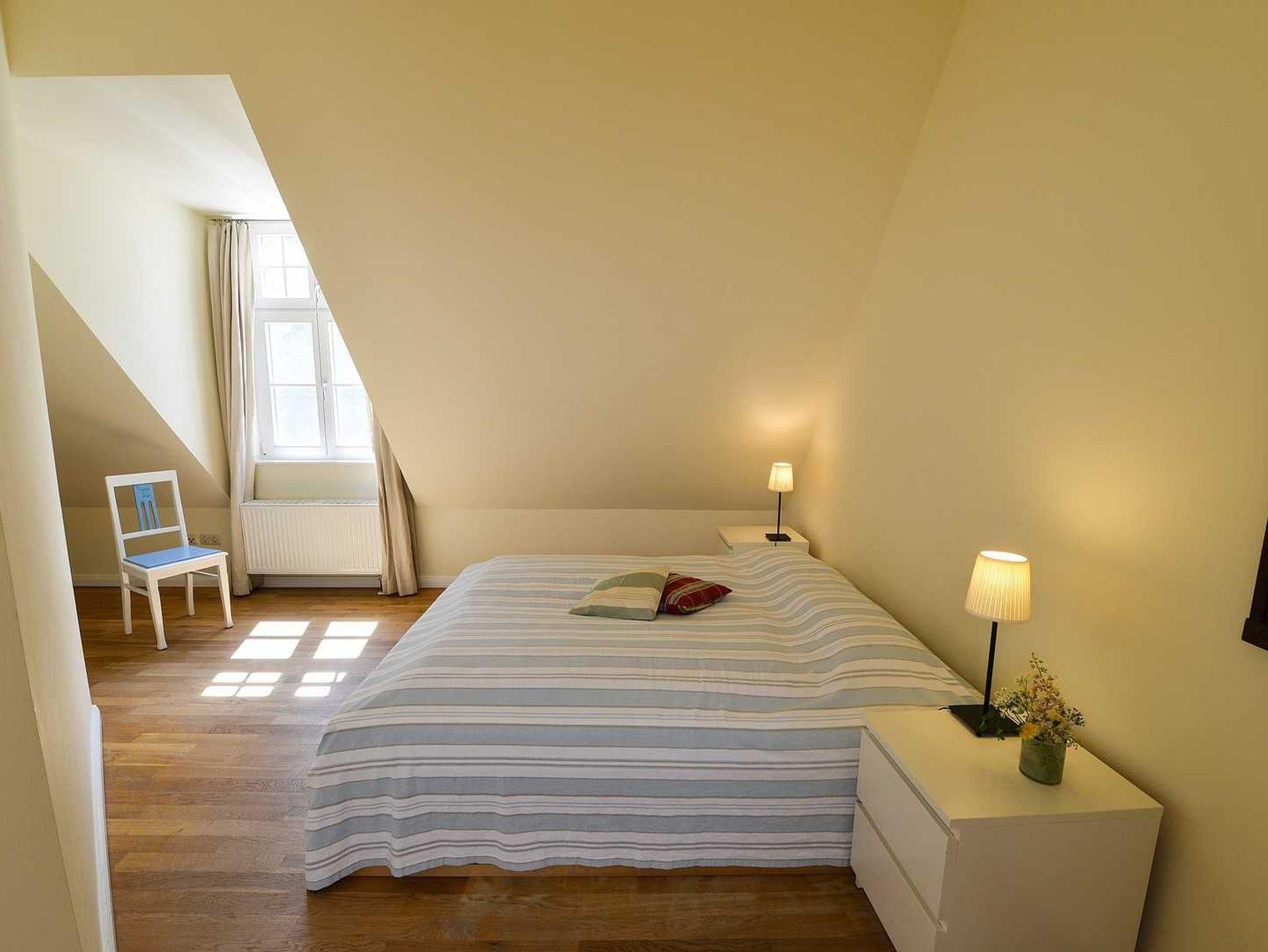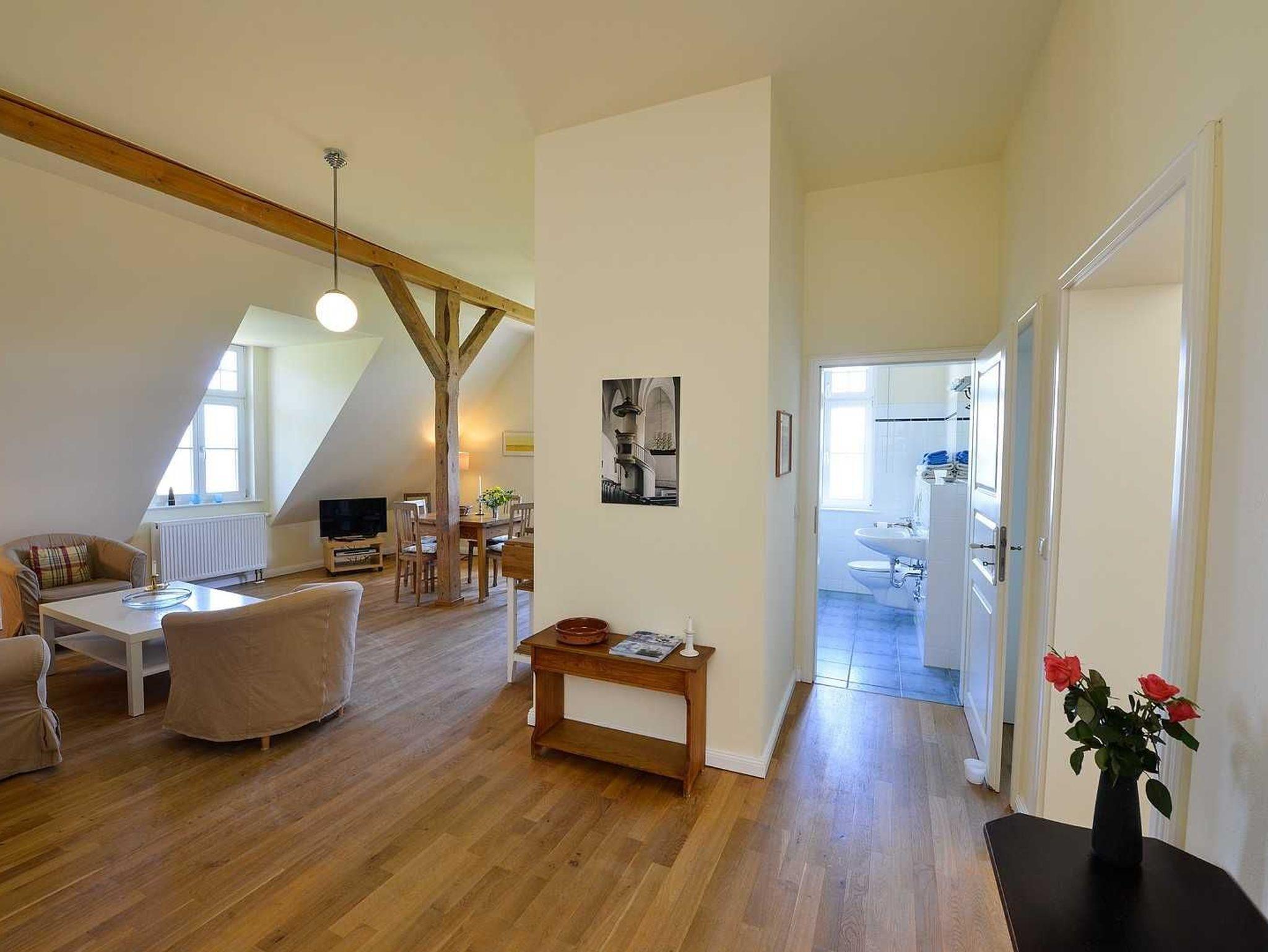 Die Ferienwohnung Nr. 5 befindet sich im zweiten Obergeschoss des Gutshauses. Die Wohnung für bis zu vier Personen und in einer Größe von 69 m² ist stilvoll eingerichtet und besteht aus drei Zimmern: Ein großes Wohnzimmer mit offener Küche (hochwertige Siemens-Geräte) und schönem Blick auf den Garten und das Wasser, ein Schlafzimmer mit zwei Einzelbetten und ein Schlafzimmer mit einem Doppelbett und ein Badezimmer mit separater Badewanne und Dusche. Die Böden der Ferienwohnung bestehen aus Eichen-Parkett.