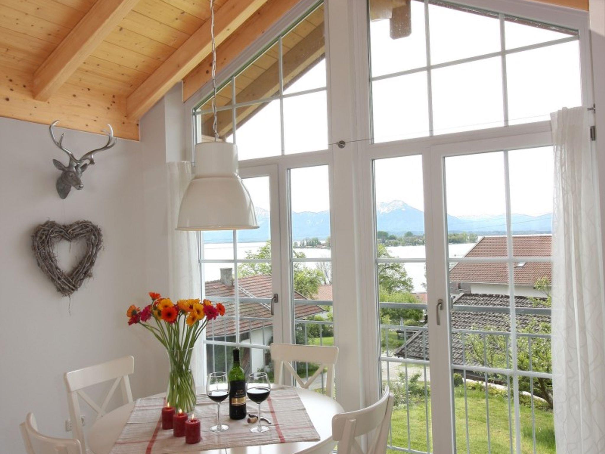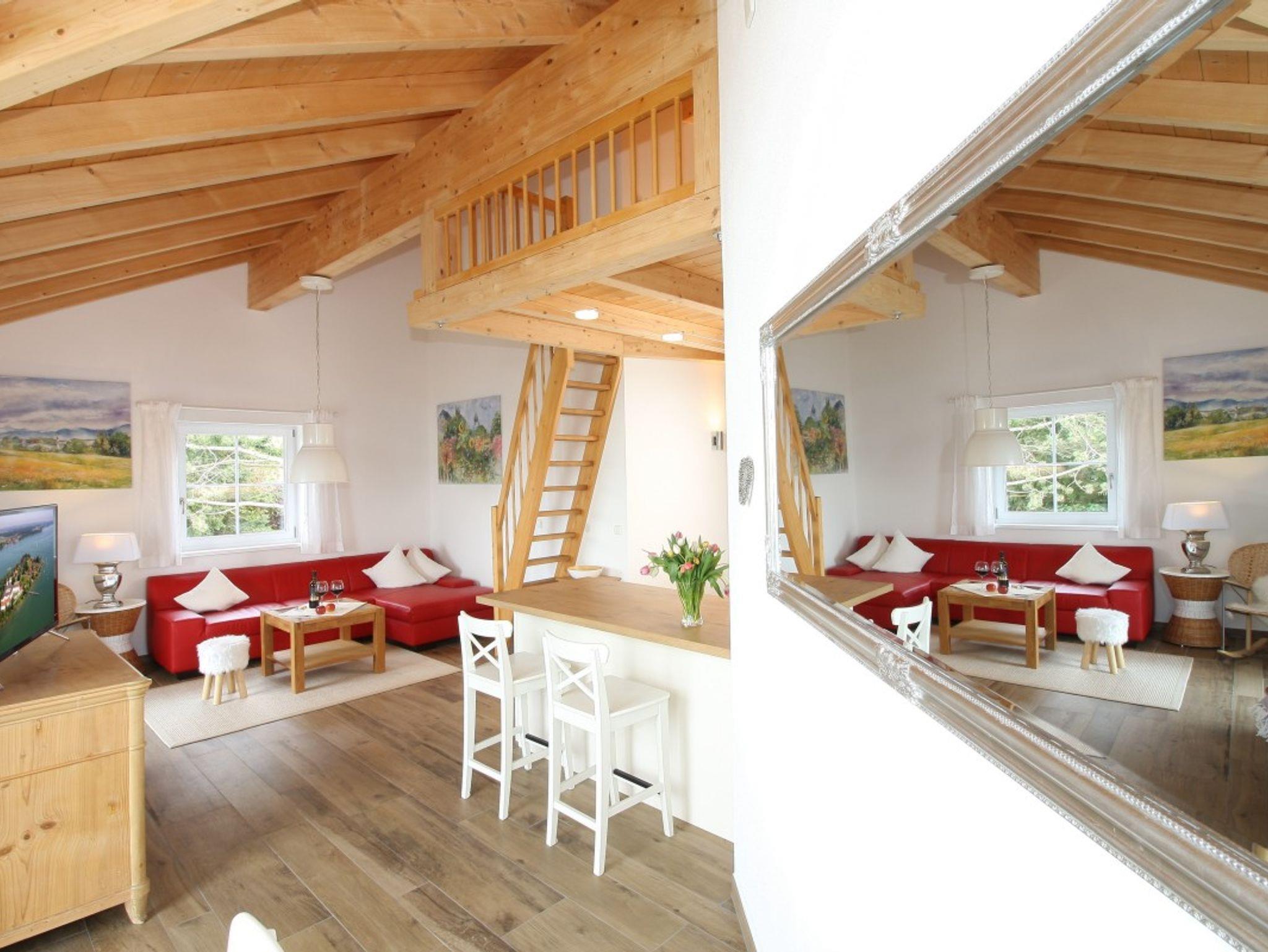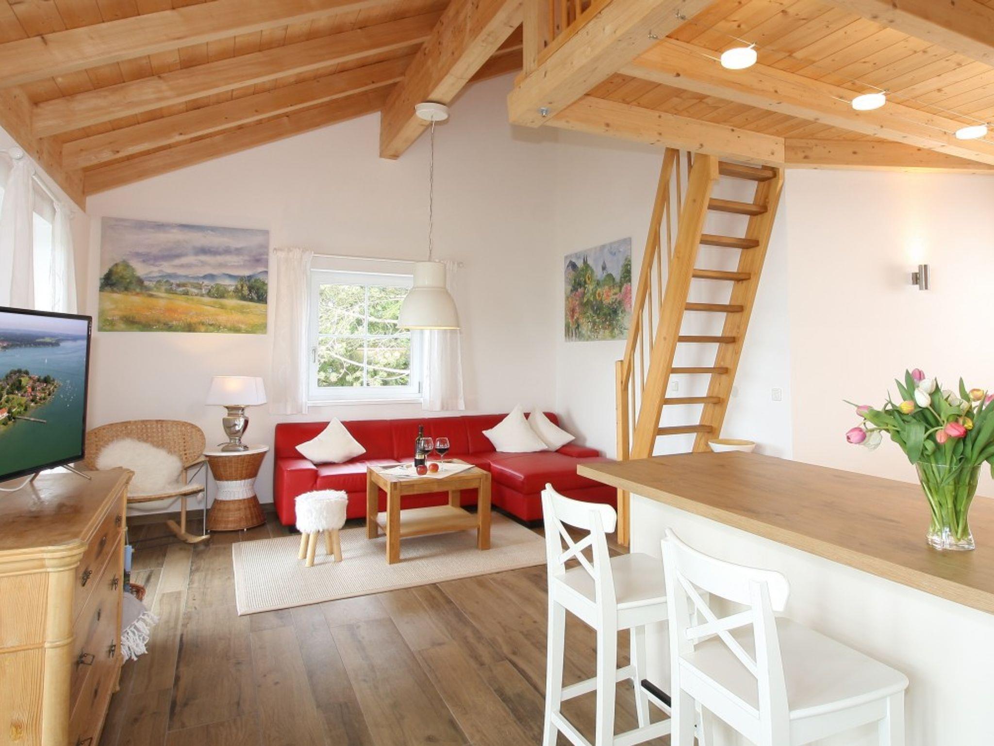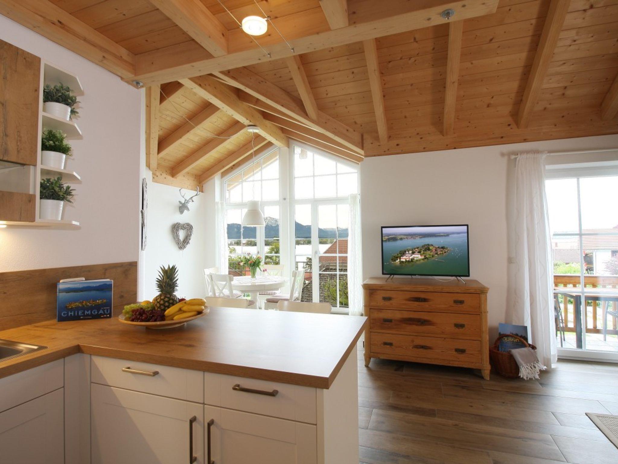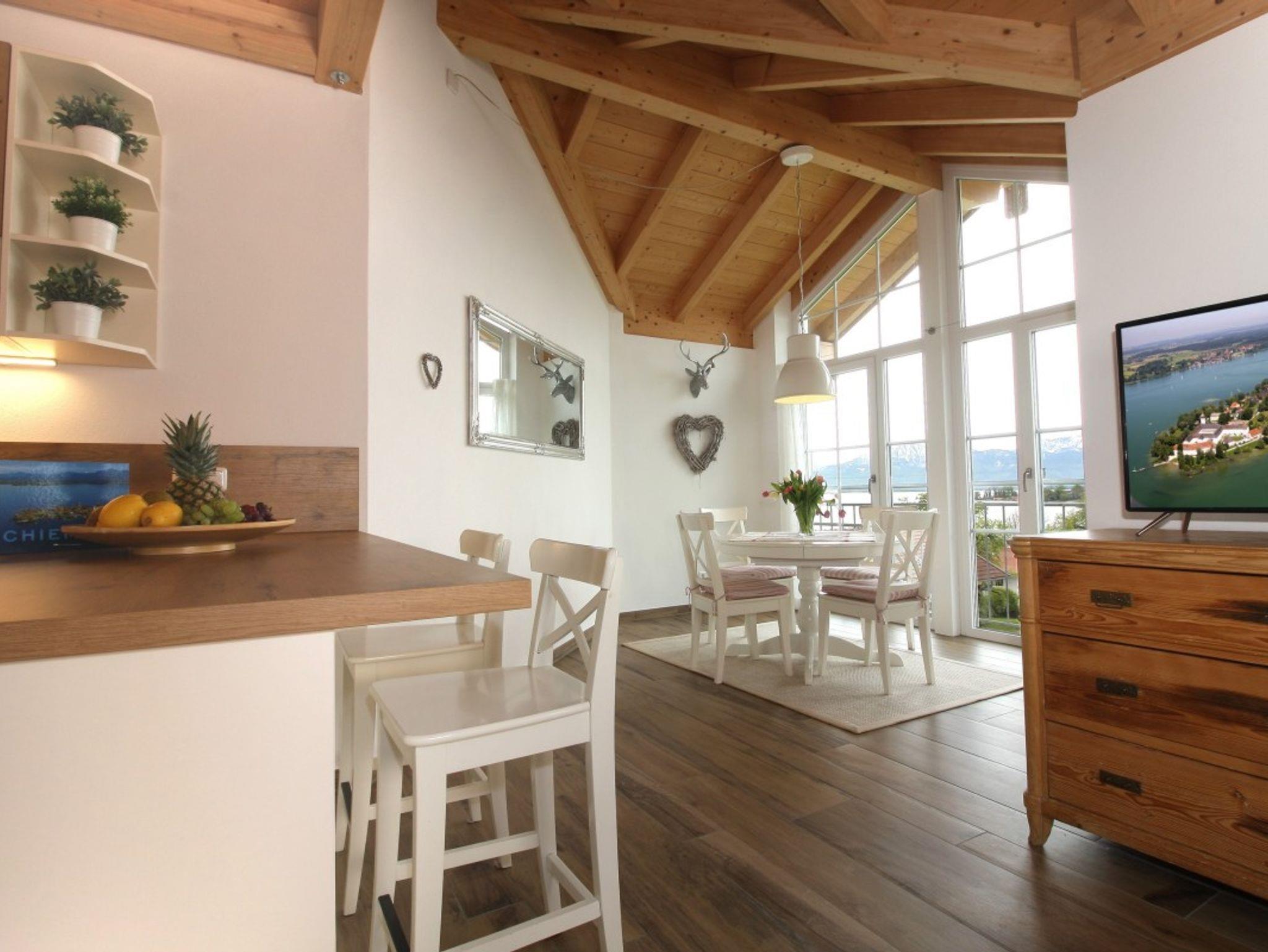 Die Wohnung ist 75 qm groß und mit jeglichem Komfort ausgestattet. Ein großzügiger Wohnraum; gemütlichem Sofa; schönem Essplatz und HD Fernseher; einer offenen Küche die mit Spülmaschine, Iduktion-Backofen, Kühlgefrierschrank, Kaffeemaschine, Wasserkocher, Toaster, Kaffeepad Maschine ausgestattet ist. Über eine Treppe geht es hinauf zur Galerie mit einem zusätzlichen Bett (1,40m breit). Vom Balkon aus bietet die Wohnung einen atemberaubenden Panoramablick auf den See, Inseln und die Berge. Das Schlafzimmer ist modern und pfiffig eingerichtet und hat ebenso einen Fernseher. Im Bad ist für Sie ein Föhn und ein Radio vorhanden. Waschmaschine/Trockner sind im separaten Raum für alle Gäste des Hauses Chiemsee Blick zugänglich.