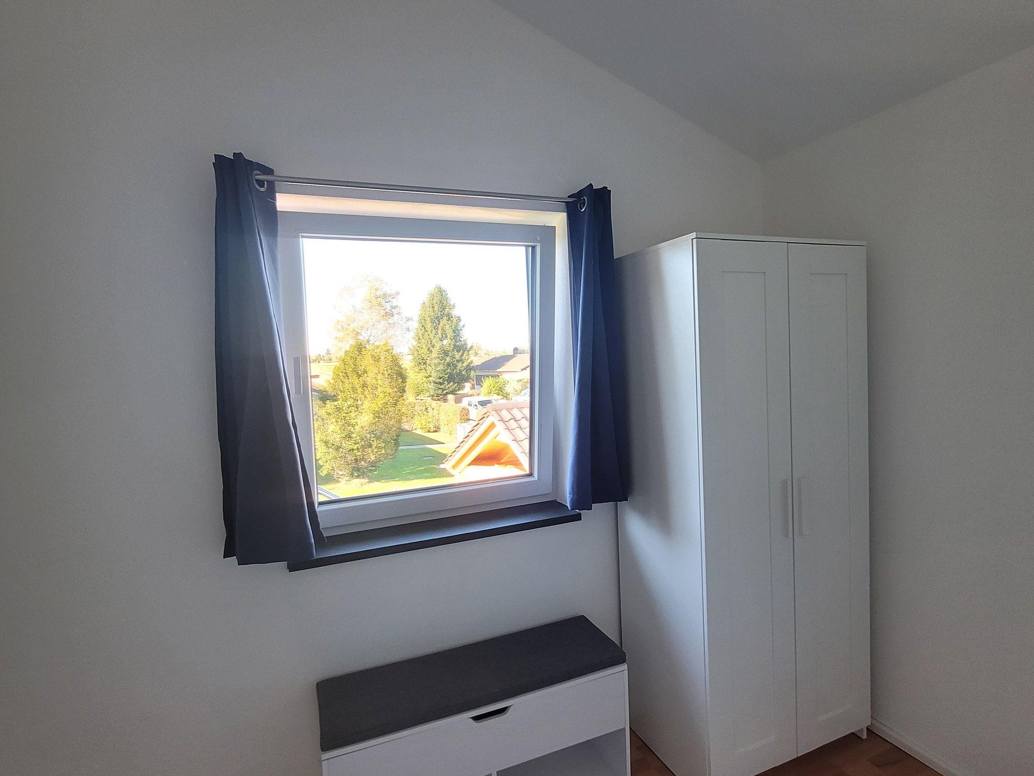 Das Schlafzimmer hält Bettwäsche und einen ausreichend großen Kleiderschrank bereit.