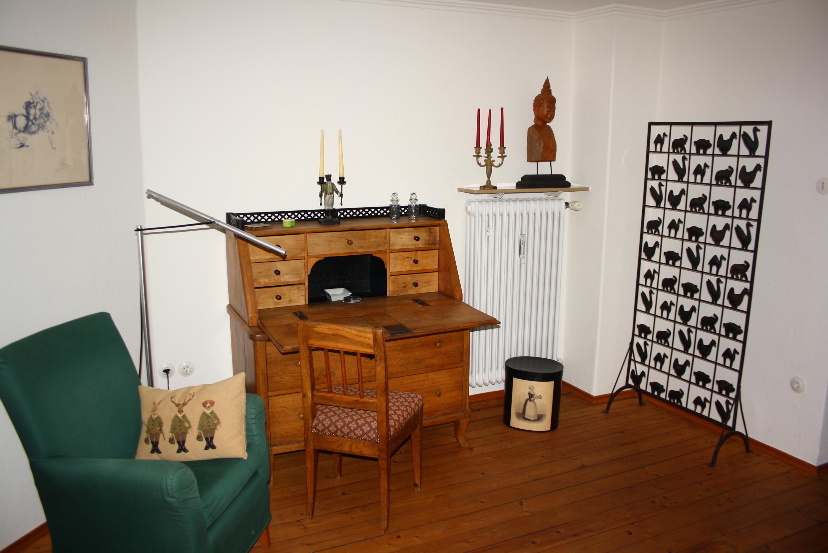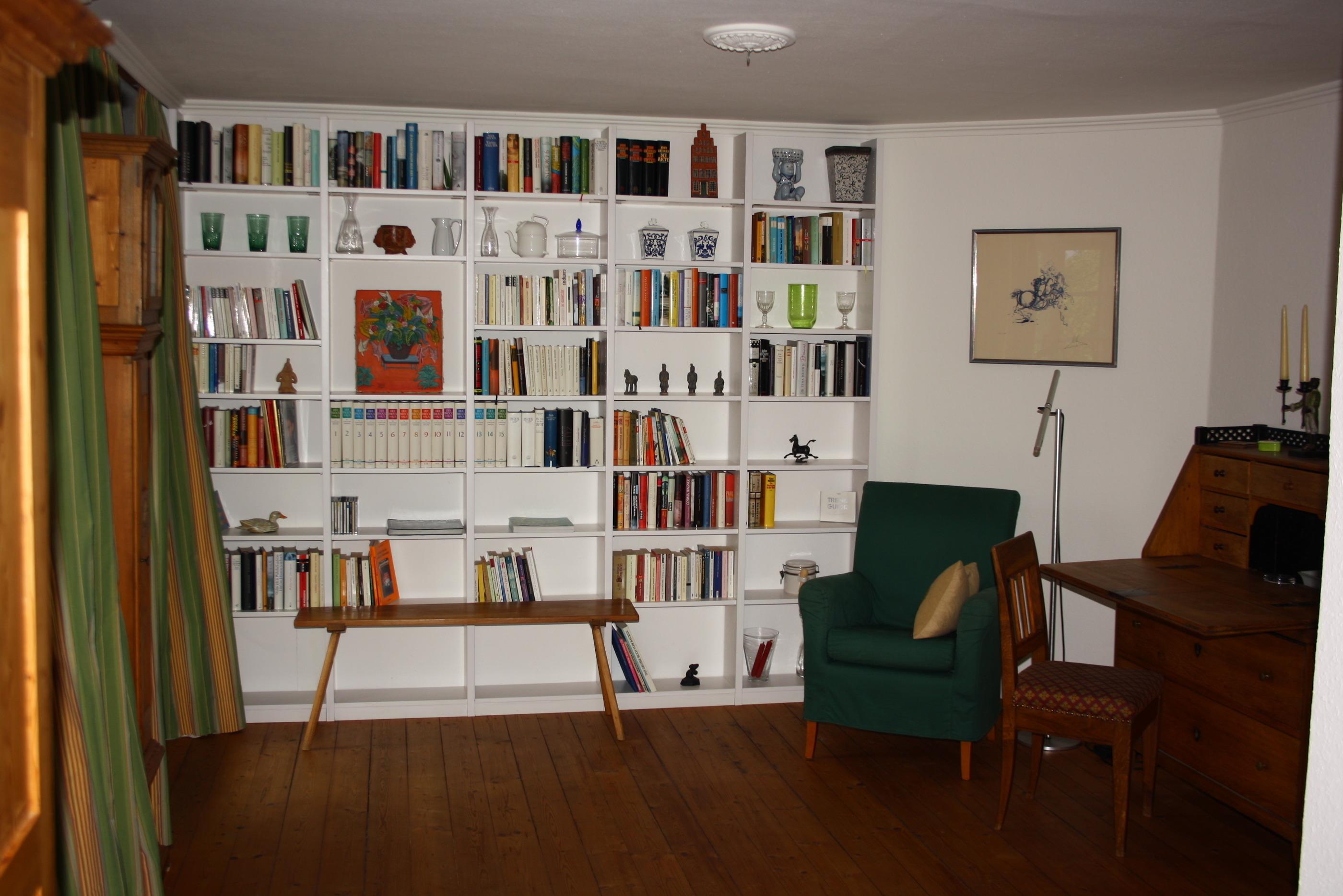 Die Wohnung ist z. T. mit Antiquitäten ausgestattet. Sie finden im Wohnzimmer eine umfangreiche Bibliothek vor.
