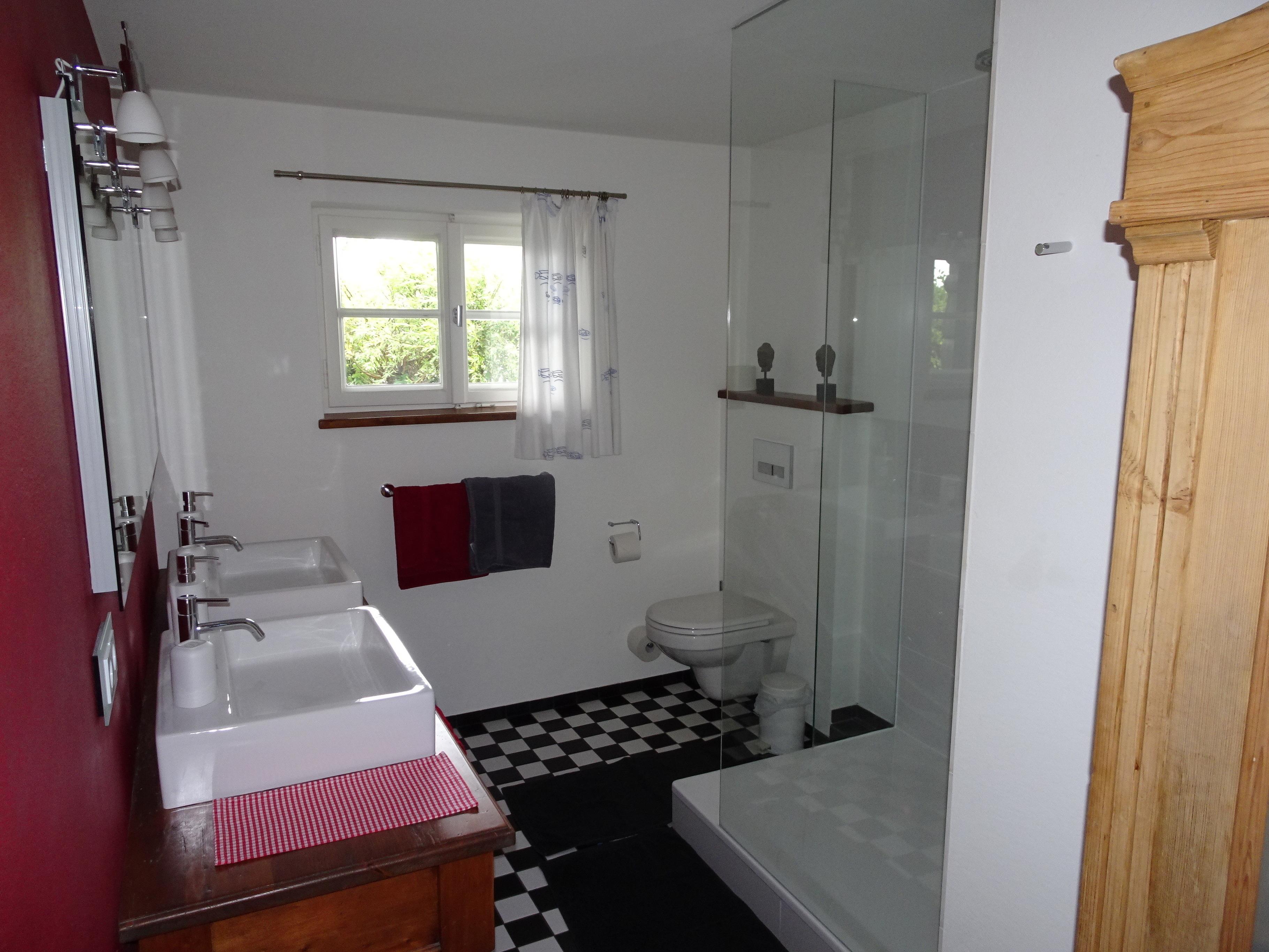 Das Badezimmer verfügt über zwei Waschbecken, ein WC, Dusche mit Regendusche.