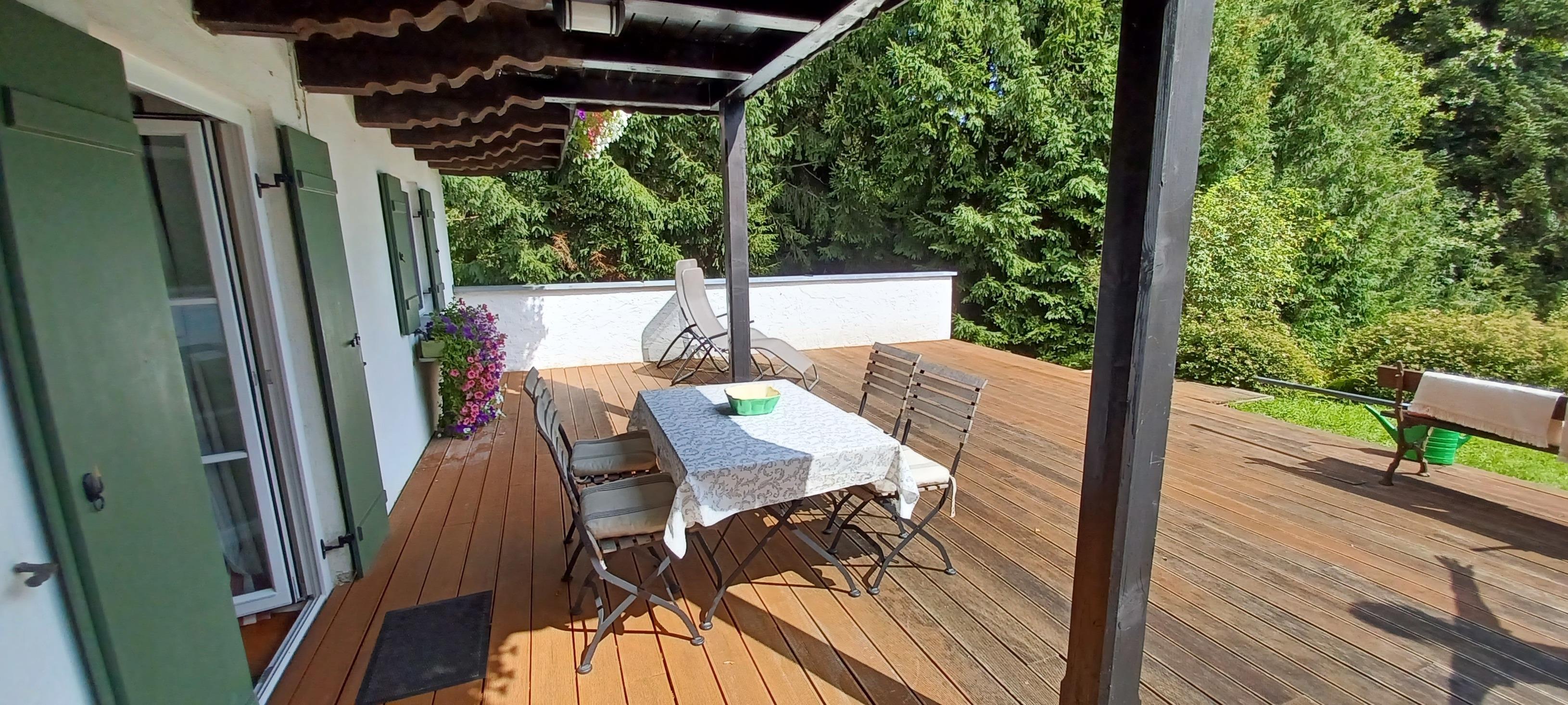 Absolut ruhig gelegen mit einer großzügigen Terrasse und einem großen Garten, in dem Sie unter alten Apfelbäumen in einem Liegestuhl die Seele baumeln lassen können oder auch ein Buch lesen.