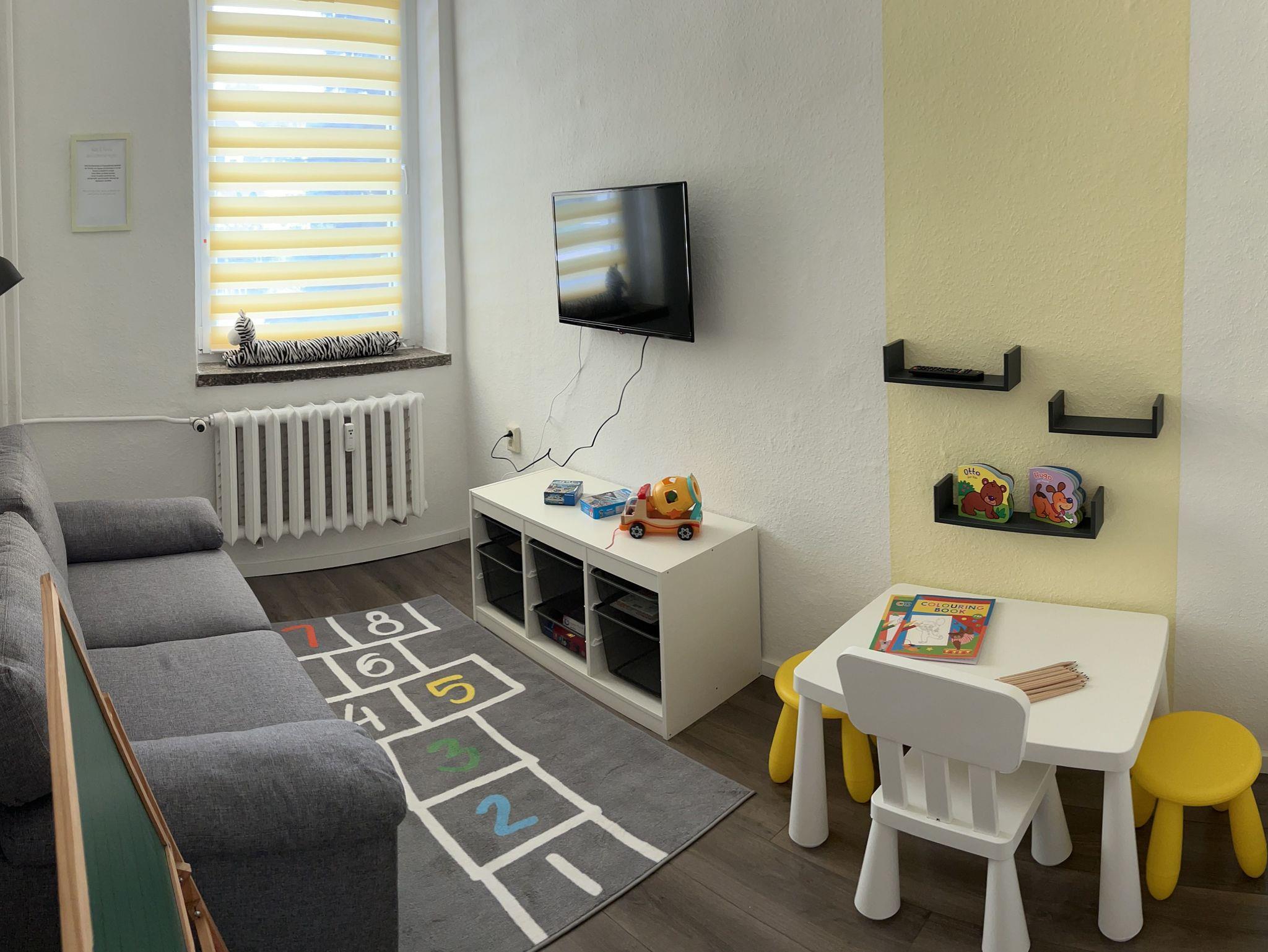 Diese geräumige Ferienwohnung bietet auf 114m² Platz für bis zu 7 Personen. Drei moderne Schlafzimmer sind ausgestattet mit 2 Doppelbetten, einem Einzelbett und einem Etagenbett. Für die kleinsten Gäste kann gegen einen geringen Aufpreis ein Hochstuhl und ein Babybett bereitgestellt werden. Für die größeren Kids gibt es ein separates Spielzimmer inkl. TV. Die moderne Küche verfügt über einen kleinen Essbereich. Treffpunkt für gemeinsame Mahlzeiten und gesellige Stunden könnte das liebevoll eingerichtete Wohnzimmer mit seinem zusätzlichem größeren Essbereich sein. Das Badezimmer ist mit Dusche und Badewanne, sowie einem großen Doppelwaschtisch ausgestattet. Bei Bedarf können im Keller eine Waschmaschine und ein Trockner genutzt werden. Ein abschließbarer Raum für Fahrräder ist dort ebenfalls verfügbar.