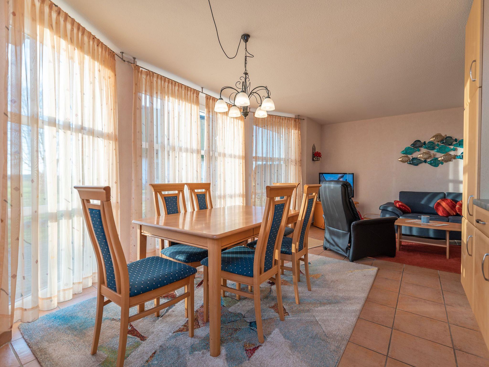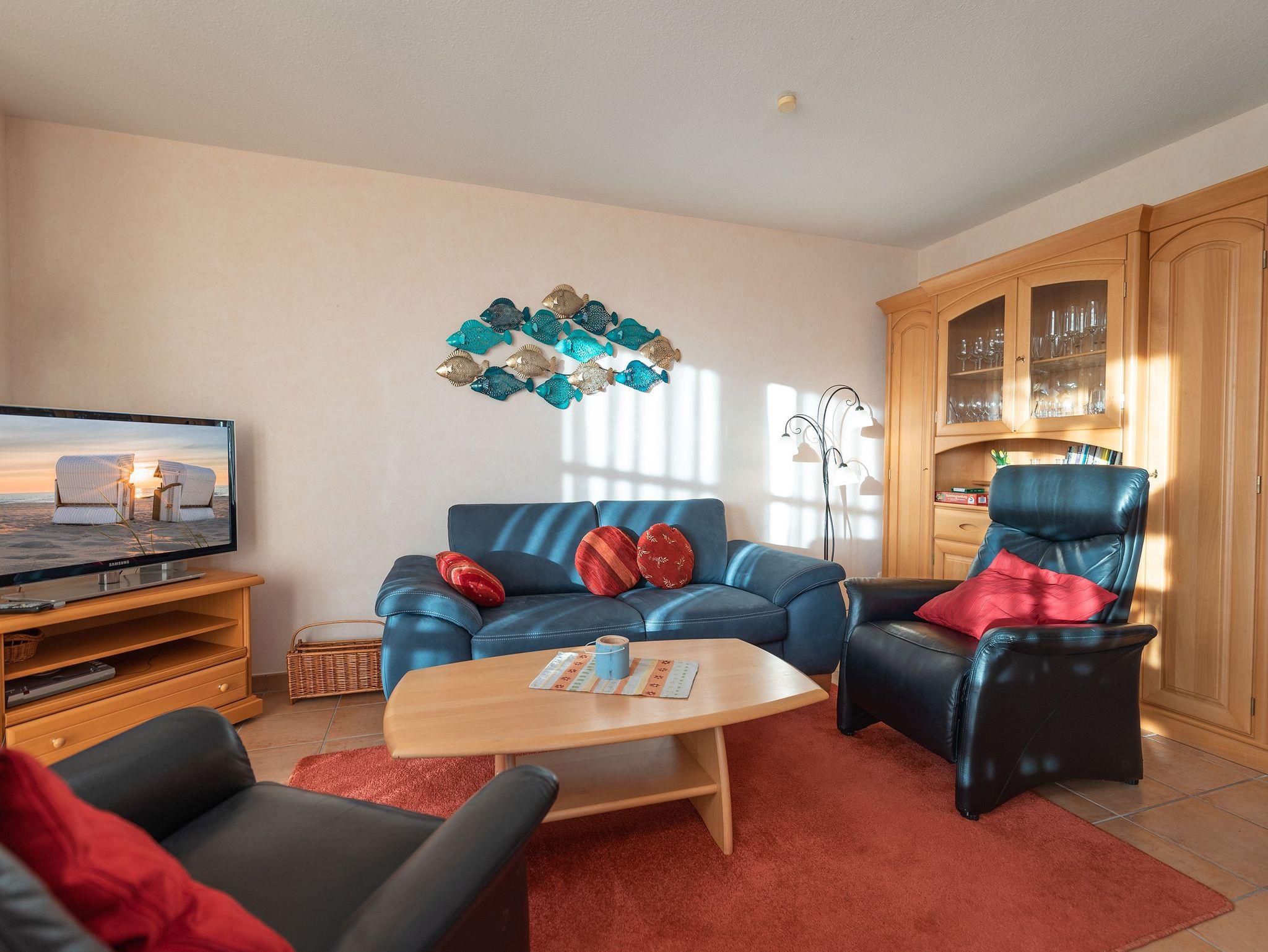 • Wohnbereich: Gemütlich eingerichtet mit einer Couch, zwei Sesseln, einem Flachbild-TV und einem Essplatz für vier Personen.