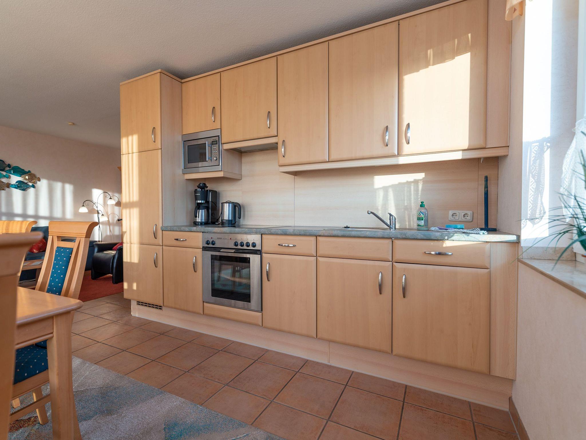 • Küche: Voll ausgestattete Küchenzeile, die keine kulinarischen Wünsche offenlässt und direkten Zugang zur großzügigen Terrasse bietet.
