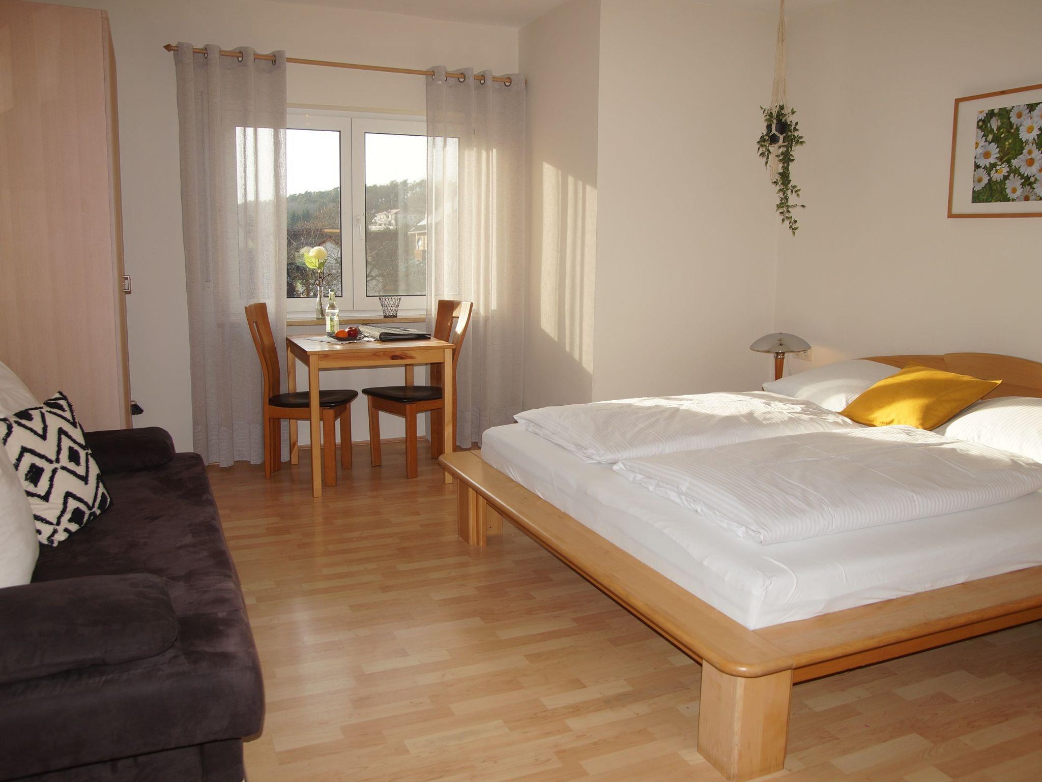 1. Etage, 24qm, Einzimmerappartement mit Doppelbett, Essplatz, Schlafcouch und Küche.