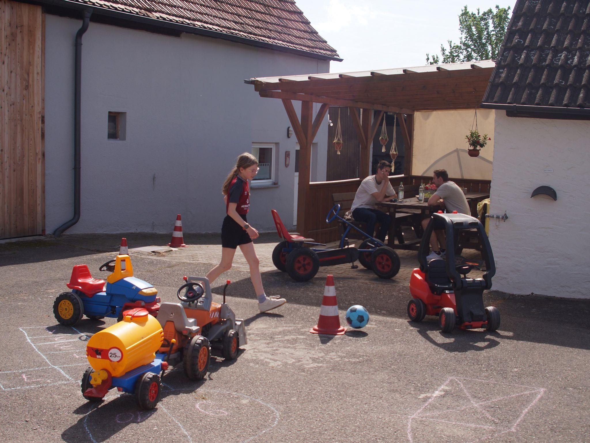 abgeschlossenen Hof und auf dem Spielplatz nach Lust und Laune toben. Verschiedene Tret-Fahrzeuge und viele Spielsachen stehen dazu bereit.