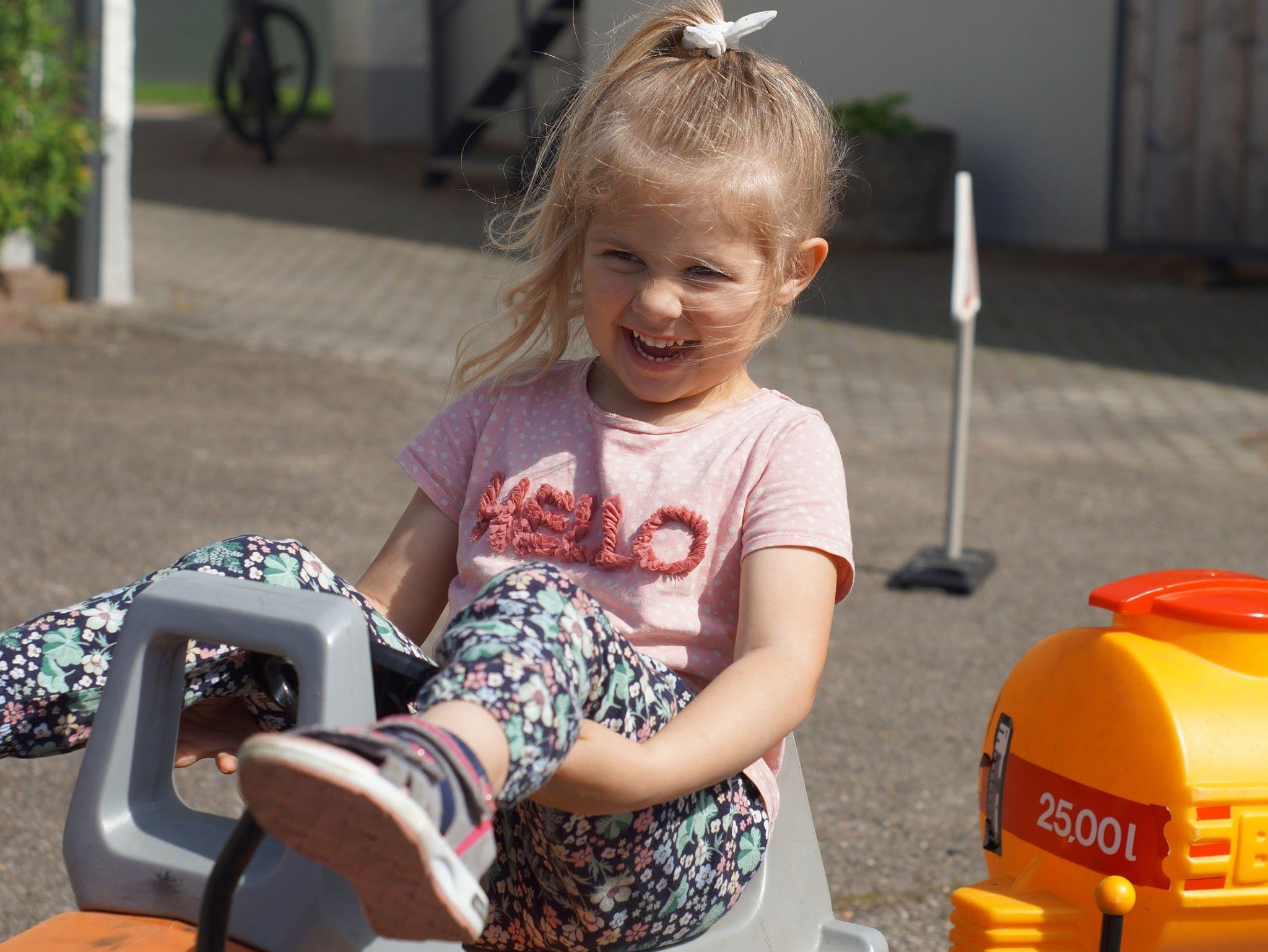 abgeschlossenen Hof und auf dem Spielplatz nach Lust und Laune toben. Verschiedene Tret-Fahrzeuge und viele Spielsachen stehen dazu bereit.