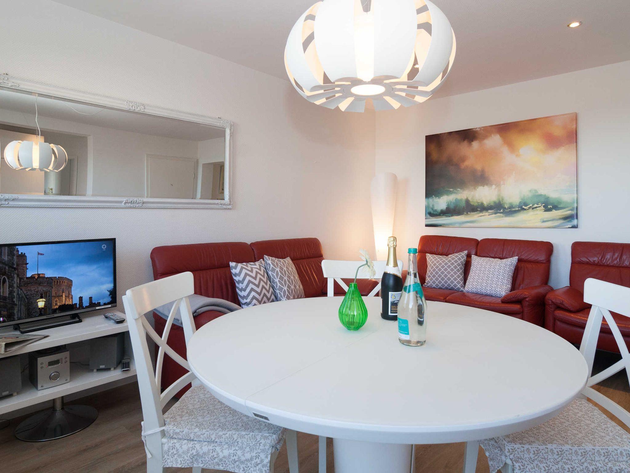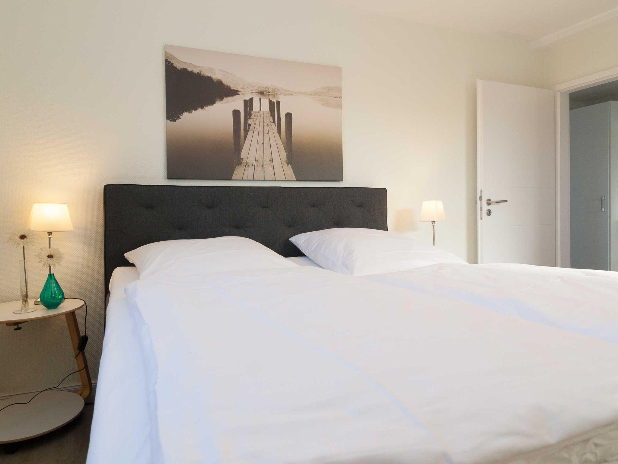 Das Appartement liegt im Erdgeschoß mit Blick zum Strand und Meer und besteht aus drei Räumen und zwei Terrassen. Es ist sehr hell und in modernem Stil eingerichtet. Vom großen Wohnraum mit Ledersofalandschaft, Essecke, TVSAT und Radio führt eine kleine Treppe zur Terrasse mit Strandkorb und Holzgartenmöbeln, von hier aus sehen Sie Strand und Meer. Im Wohnraum befindet sich die Küchenzeile mit Geschirrspüler, Ceranherd und Backofen, Mikrowelle, Kühlschrank mit Gefrierfach, Kaffeemaschine, Wasserkocher und Toaster. Ein Doppel-Schlafzimmer mit Schrank und TVSAT-Anlage liegt ebenfalls in Richtung Strand.