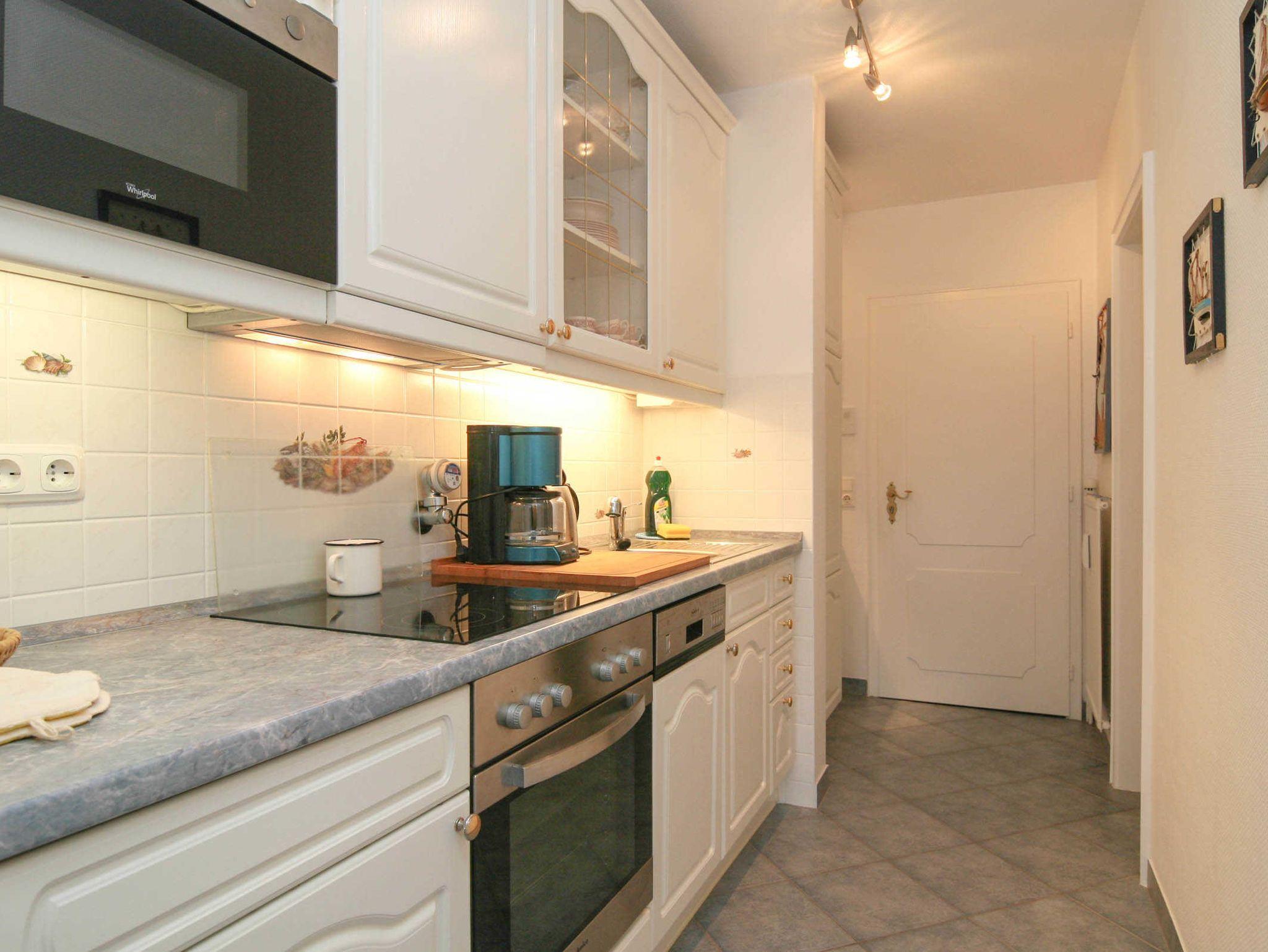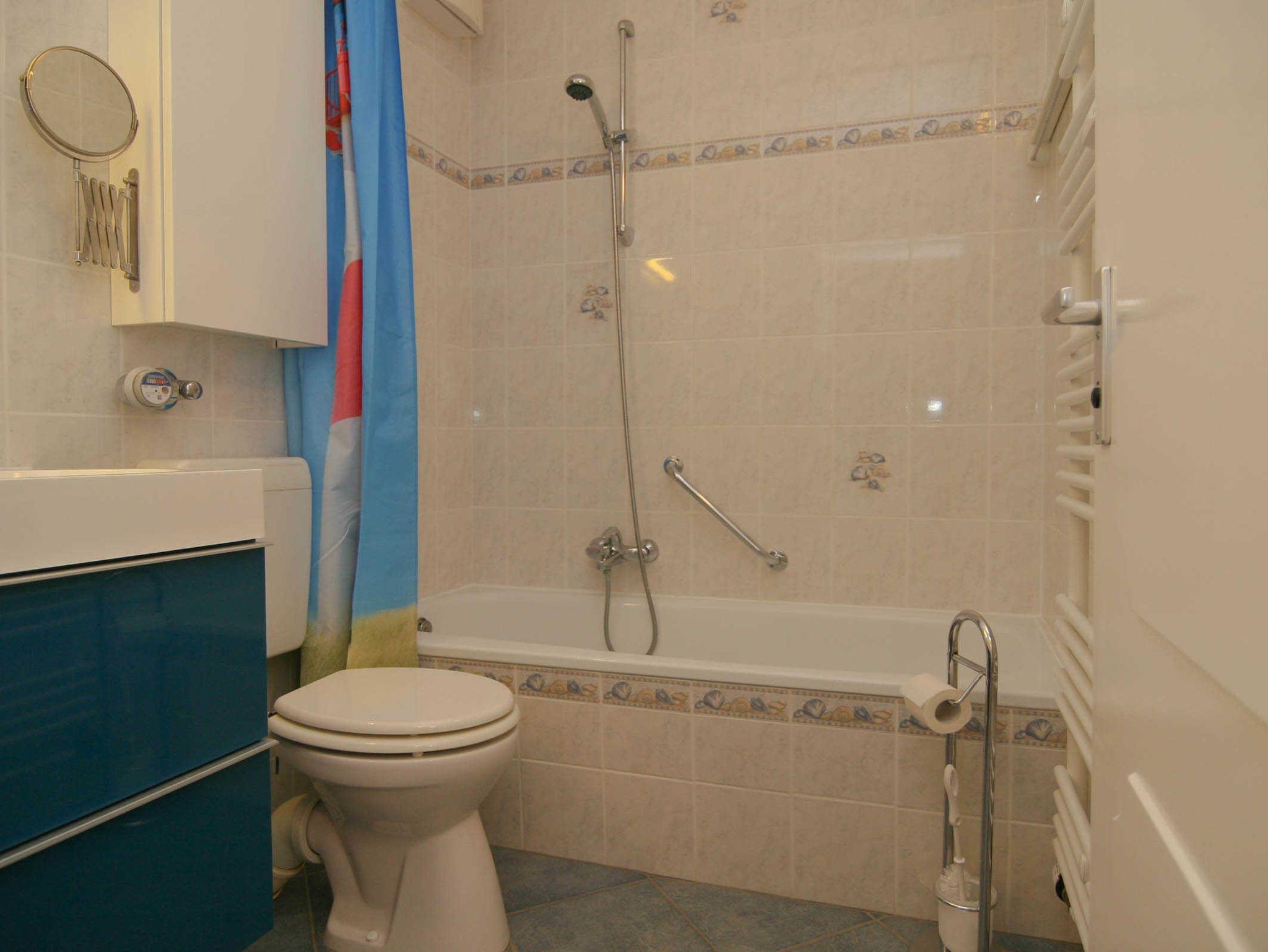 Zur Wohnung gehört ein Duschbad mit Badewanne und eine sep. kleine Küche, die mit allem ausgestattet ist, was man im Urlaub braucht.