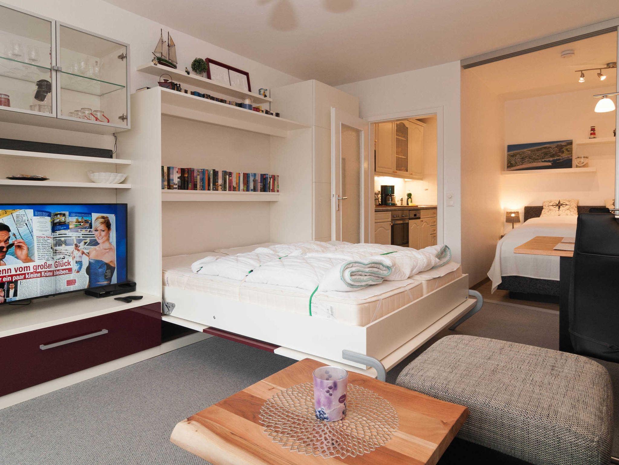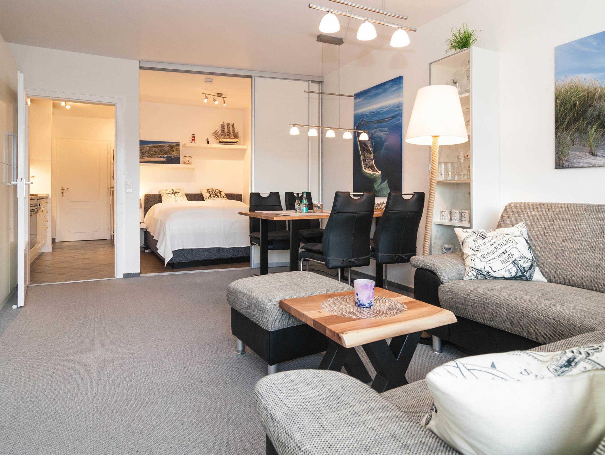 Diese Ferienwohnung Meerzeit im Haus Delphin ist für 3 Personen ausgestattet. Sie verfügt im Wohnbereich über 1 Schrankbett was sich leicht ausklappen lässt. Das angrenzende Schlafzimmer befindet sich direkt neben dem Wohnbereich und wird durch eine Schiebevorrichtung abgetrennt. Vom Wohnzimmer / Esszimmer aus haben Sie einen schönen Blick auf die Dünenlandschaft.