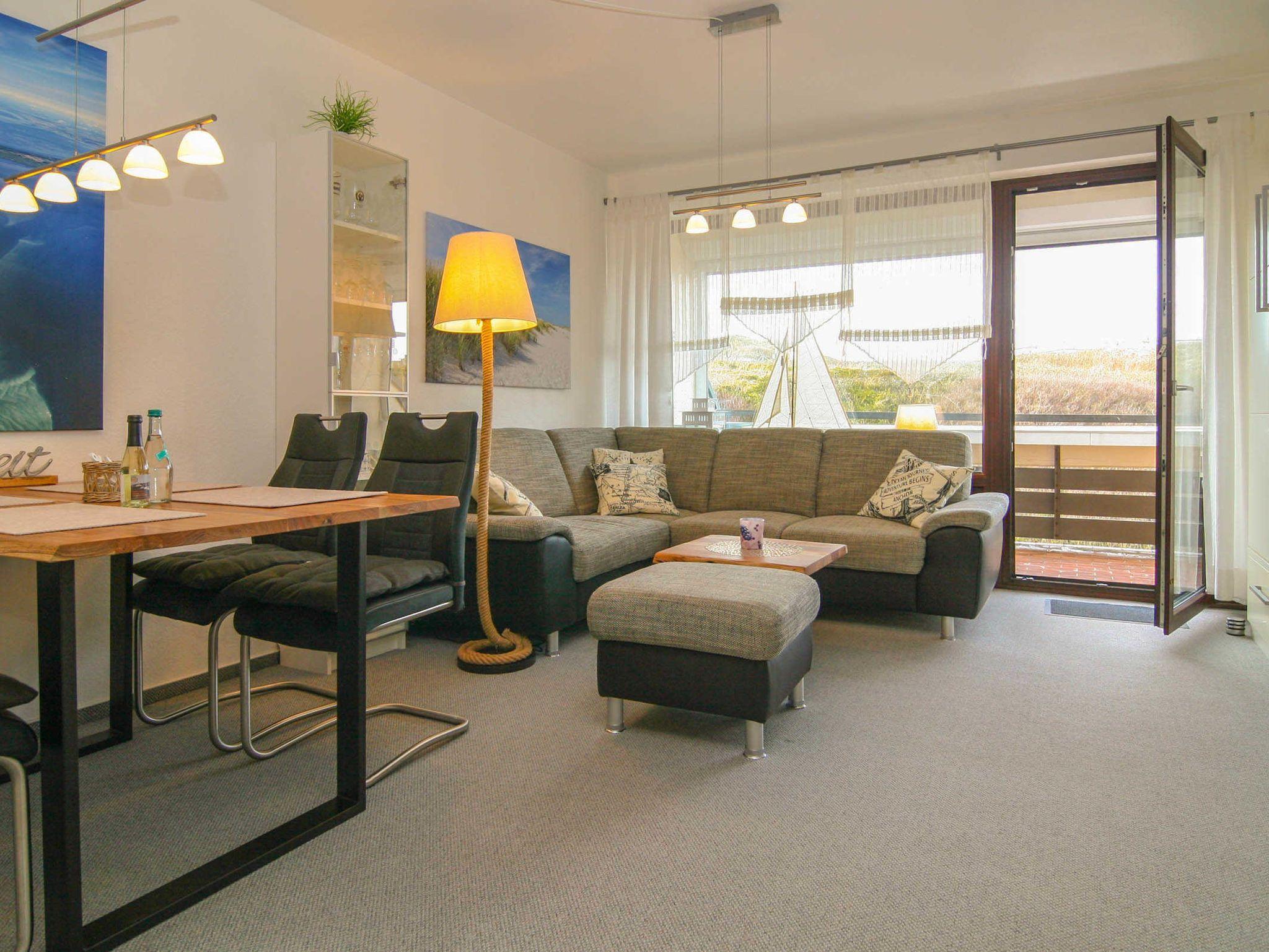 Diese Ferienwohnung Meerzeit im Haus Delphin ist für 3 Personen ausgestattet. Sie verfügt im Wohnbereich über 1 Schrankbett was sich leicht ausklappen lässt. Das angrenzende Schlafzimmer befindet sich direkt neben dem Wohnbereich und wird durch eine Schiebevorrichtung abgetrennt. Vom Wohnzimmer / Esszimmer aus haben Sie einen schönen Blick auf die Dünenlandschaft. Zur Wohnung gehört ein Duschbad mit Badewanne und eine sep. kleine Küche, die mit allem ausgestattet ist, was man im Urlaub braucht.