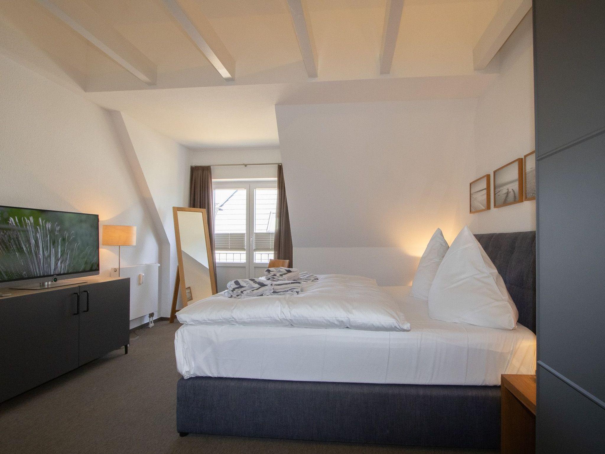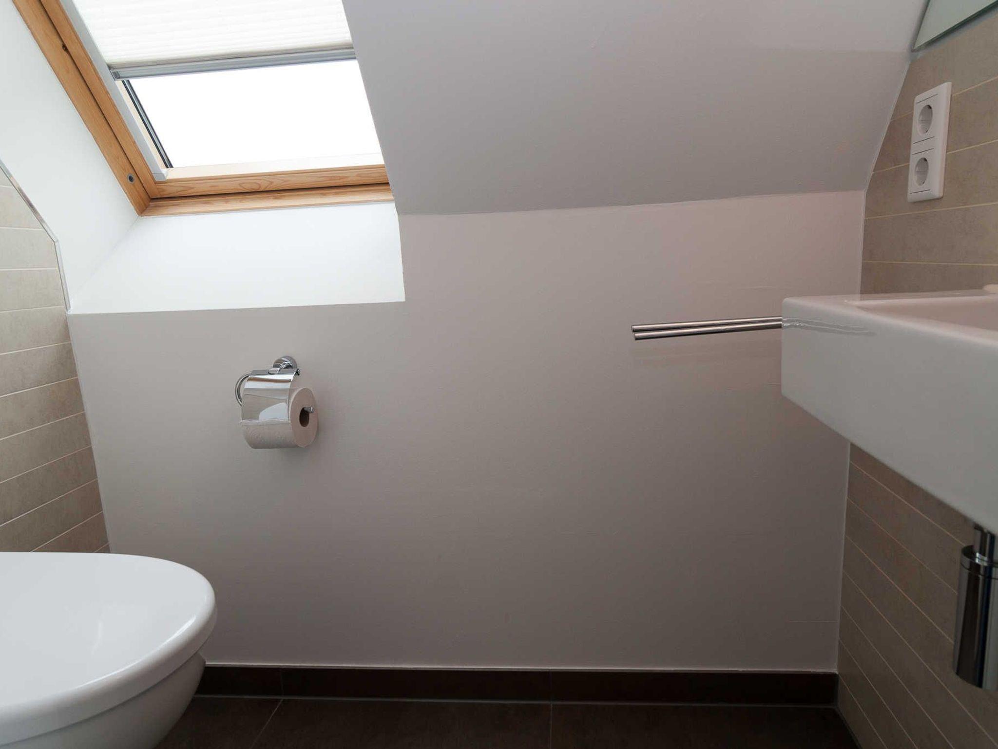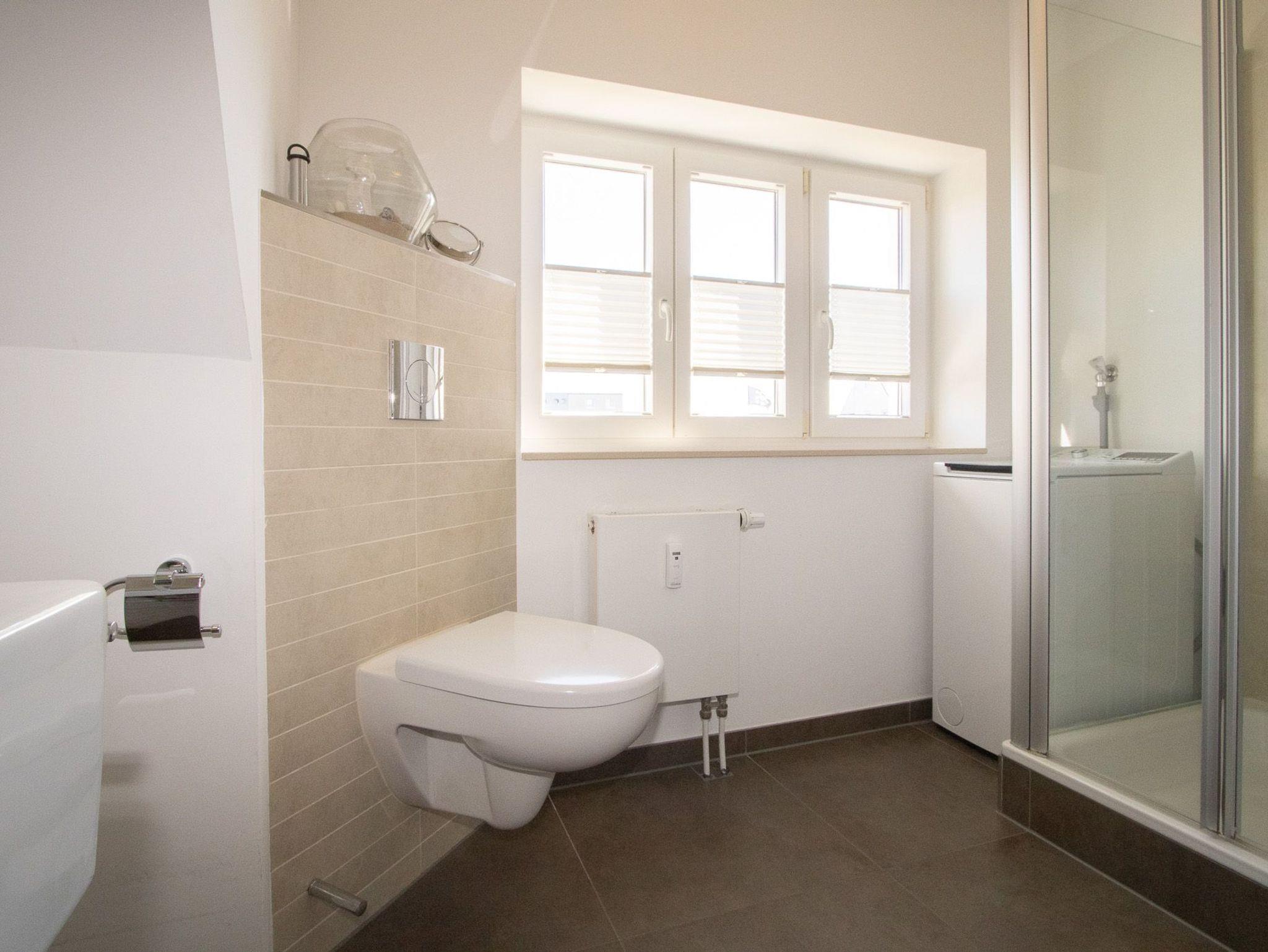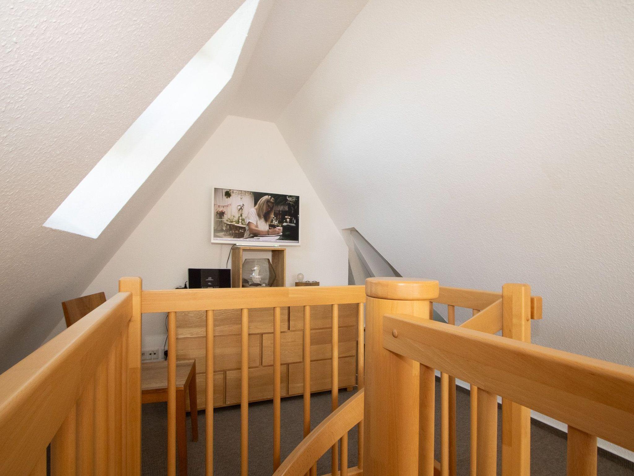 Auf dieser Ebene befindet sich auch das geräumige Schlafzimmer mit Doppelbett und angrenzendem, hochwertigem Duschbad sowie eine sep. Gäste-WC. Vom Flur der Wohnung erreichen Sie über eine Treppe ein weiteres Schlafzimmer mit Doppelbett.