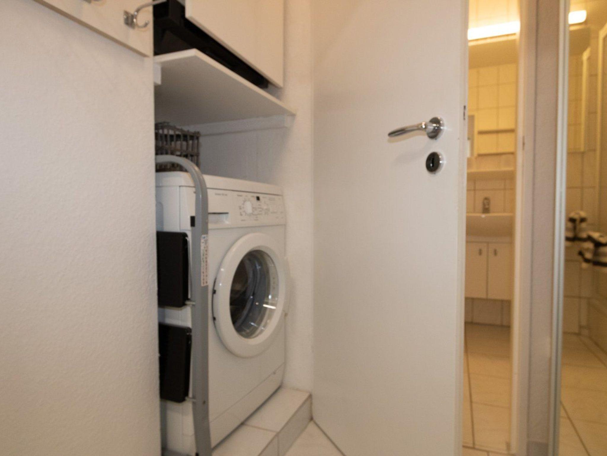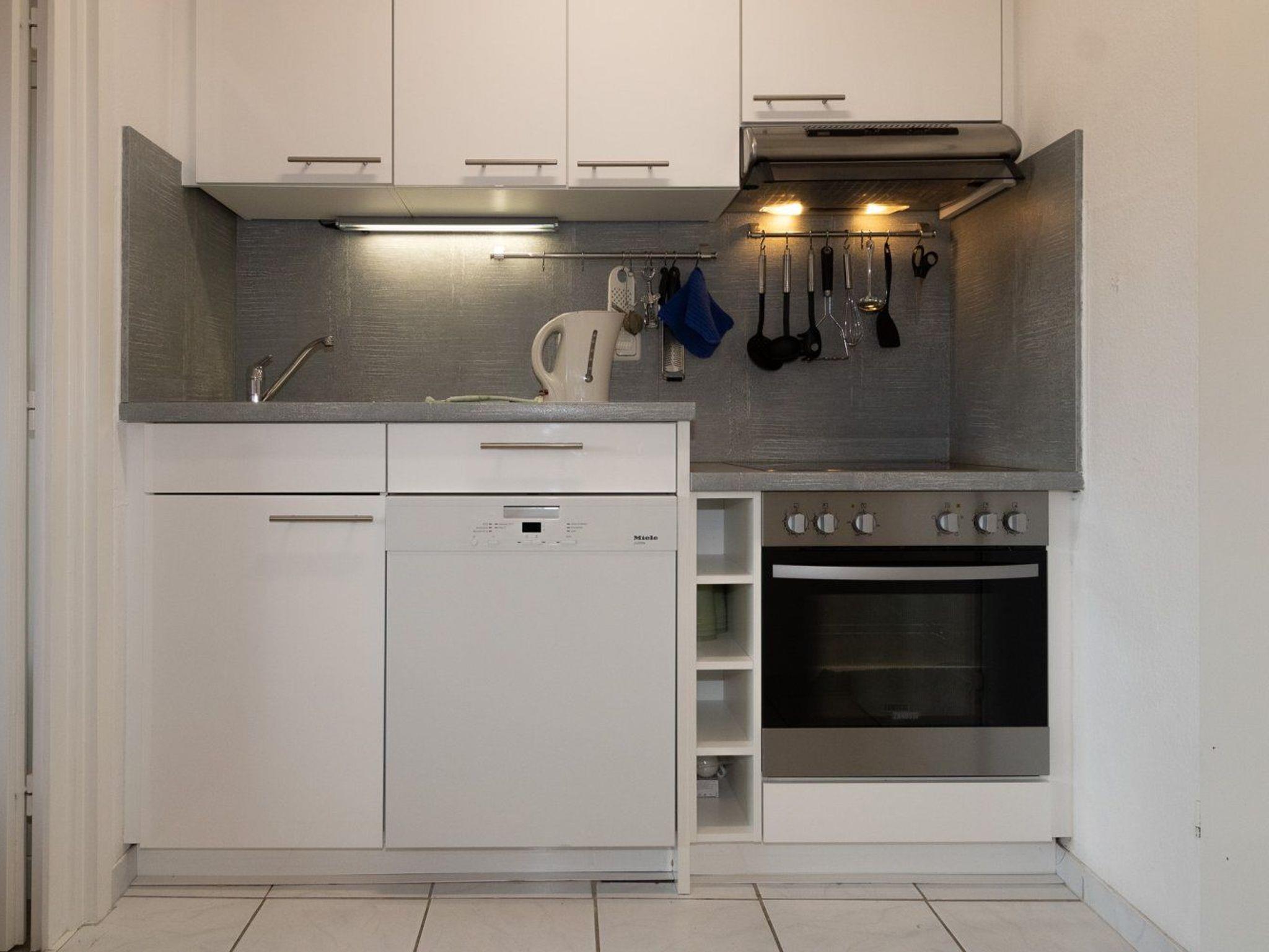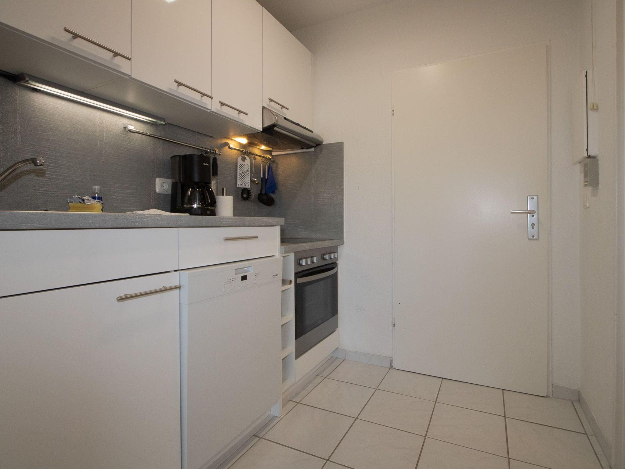 Die Küchenzeile ist komplett ausgestattet und enthält neben Cerankochfeld und Backofen auch einen Geschirrspüler. Im angrenzenden Flur befindet sich auch eine Waschmaschine.
