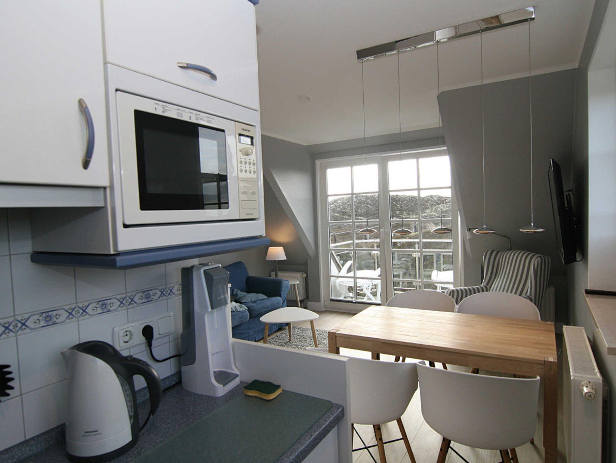 Die Wohnung ist aufgeteilt in einen Wohn-/Essbereich mit Balkon zum Süden und angrenzender Küchenzeile, 1 Schlafzimmer mit Doppelbett, eine Galerie mit 2 getrennt stehenden Betten und 2 Duschbädern. Vom Essbereich schauen Sie in die schöne Natur der Hörnumer Dünen. In der Galerie haben Sie den freien Blick bis zur Nordsee.
