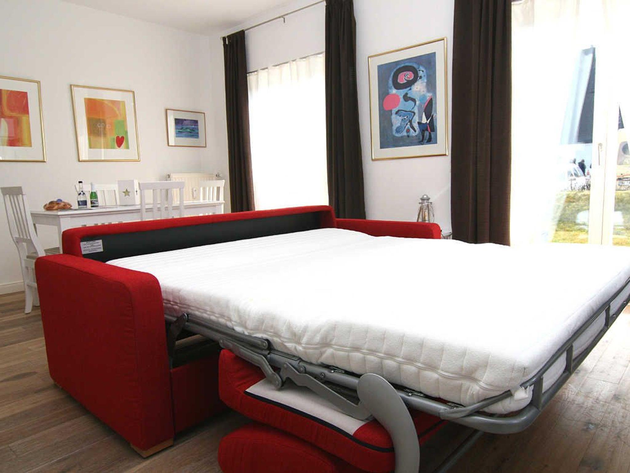 Die hell eingerichtete Ferienwohnung hat einen Wohn-/Schlafraum mit einer Schlafcouch (für 3. und 4.Person) und einen Esstisch sowie einen Fernseher für die gemütlichen Abende. In der offenen Einbauküche mit Geschirrspüler können Sie nach Herzenslust kochen. Das seperate Schlafzimmer befindet sich im hinteren Teil der Ferienwohnung. Nachttische, ein Regalschrank, ein Vitrinenschrank und ein Kleiderschrank bieten ausreichend Stauraum.