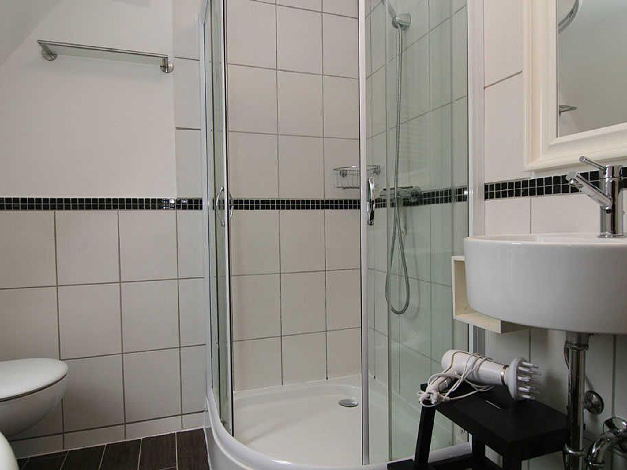 Das Haus verfügt über insgesamt drei Schlafzimmer. Davon sind zwei Schlafzimmer mit Doppelbett (1,80m x 2,00m) ausgestattet und eines mit einem Bett 1,40m x 2,00m für eine einzelne Person. Im Obergeschoss befindet sich auch das Duschbad.