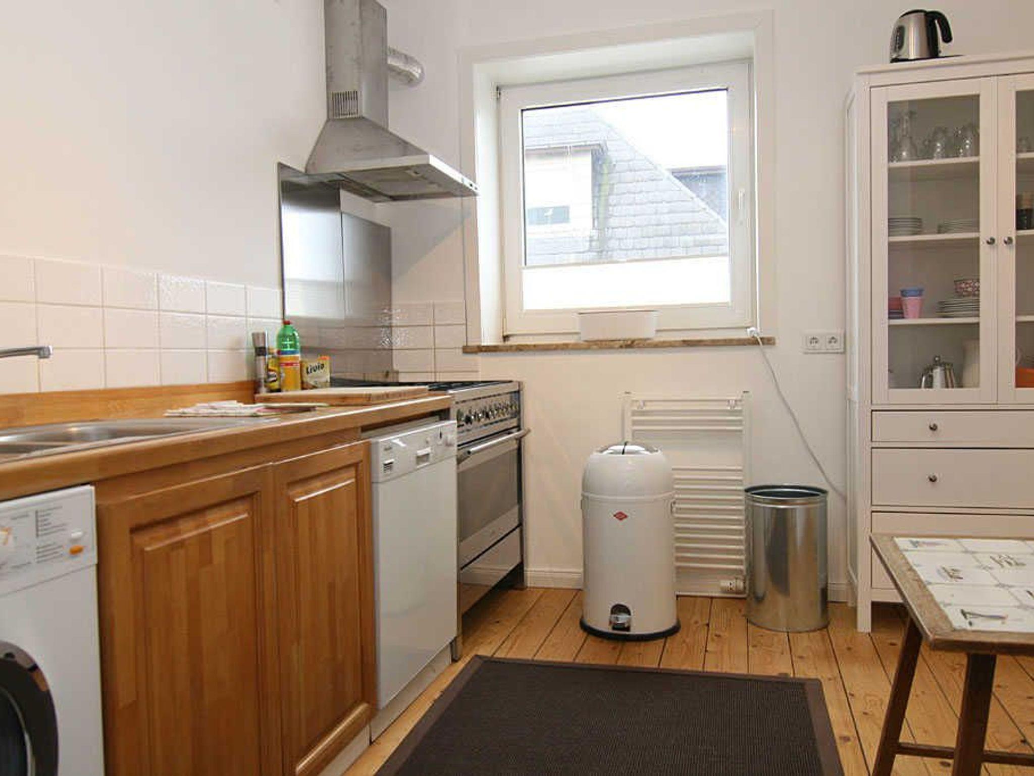 Im Erdgeschoss liegt das Wohnzimmer mit Essecke und gemütlicher Sofaecke. Über den Flatscreen-TV erhalten Sie Ihr Programme mit T-Home. Hier befindet sich auf eines der Schlafzimmer mit Doppelbett und die komplett ausgestettete Küche, die über einen Gasherd verfügt. Hier im Erdgeschoss finden Sie auch ein Gäste-WC.