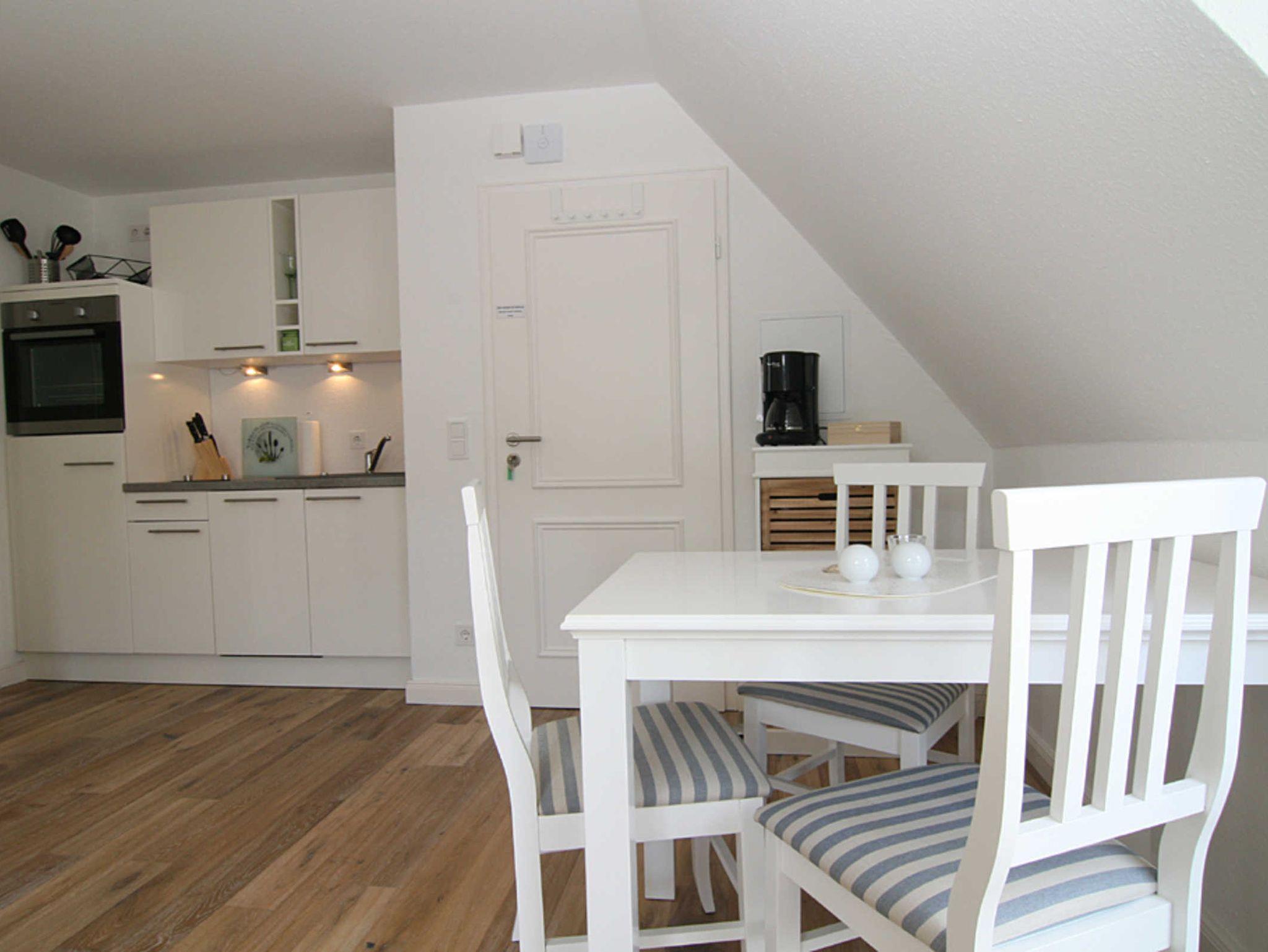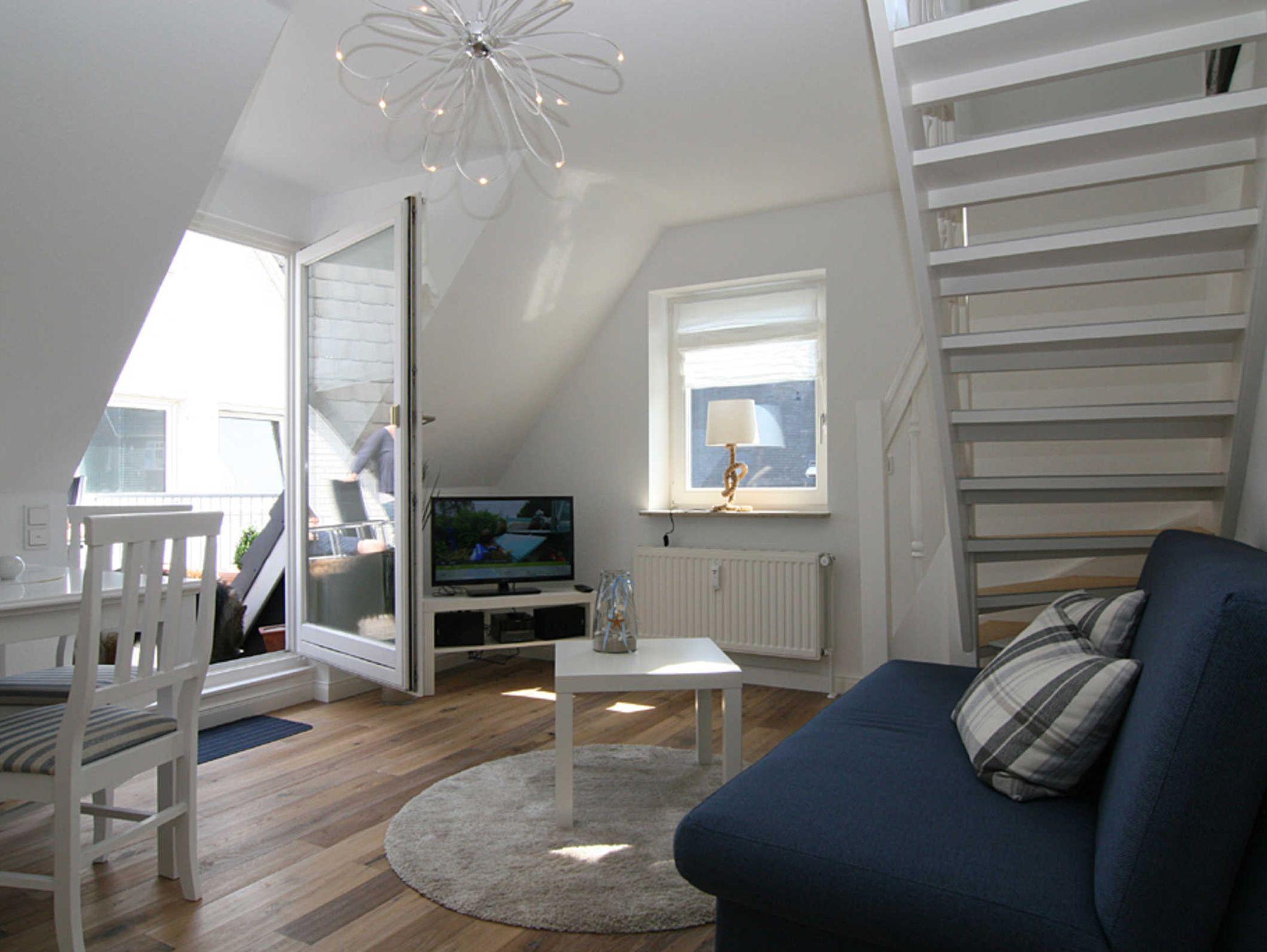 Diese Maisonette-Wohnung in der Mitte von Hörnum ist eine Wohlfühloase für max. 3 Personen. Sie gelangen direkt in den großzügigen Wohnraum, der mit Esstisch und Küchenzeile ausgestattet ist. Im Wohnbereich erwartet Sie ein Fernseher mit integriertem DVD-Player und eine Stereoanlage mit CD, Radio, USB-Eingang und Bluetooth. Auf dieser Ebene befindet sich auch das erste Schlafzimmer mit Doppelbett und das moderne Duschbad. Über die offene Treppe im Wohnraum kommt man in das 2. Schlafzimmer mit Einzelbett, geeignet für Erwachsene sowie auch Kinder.