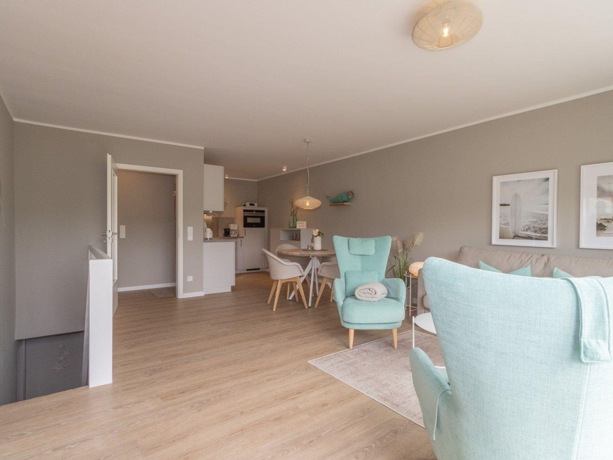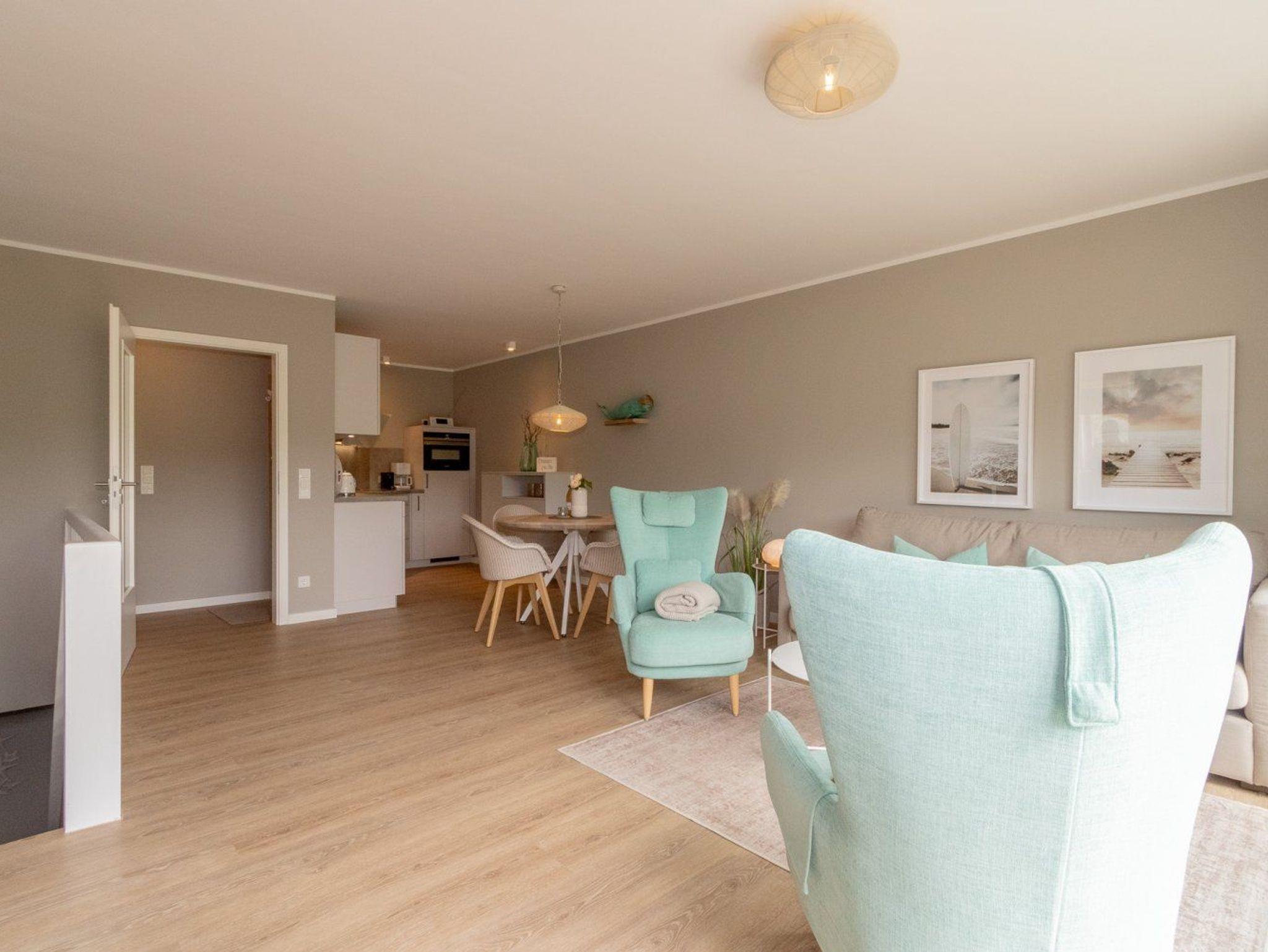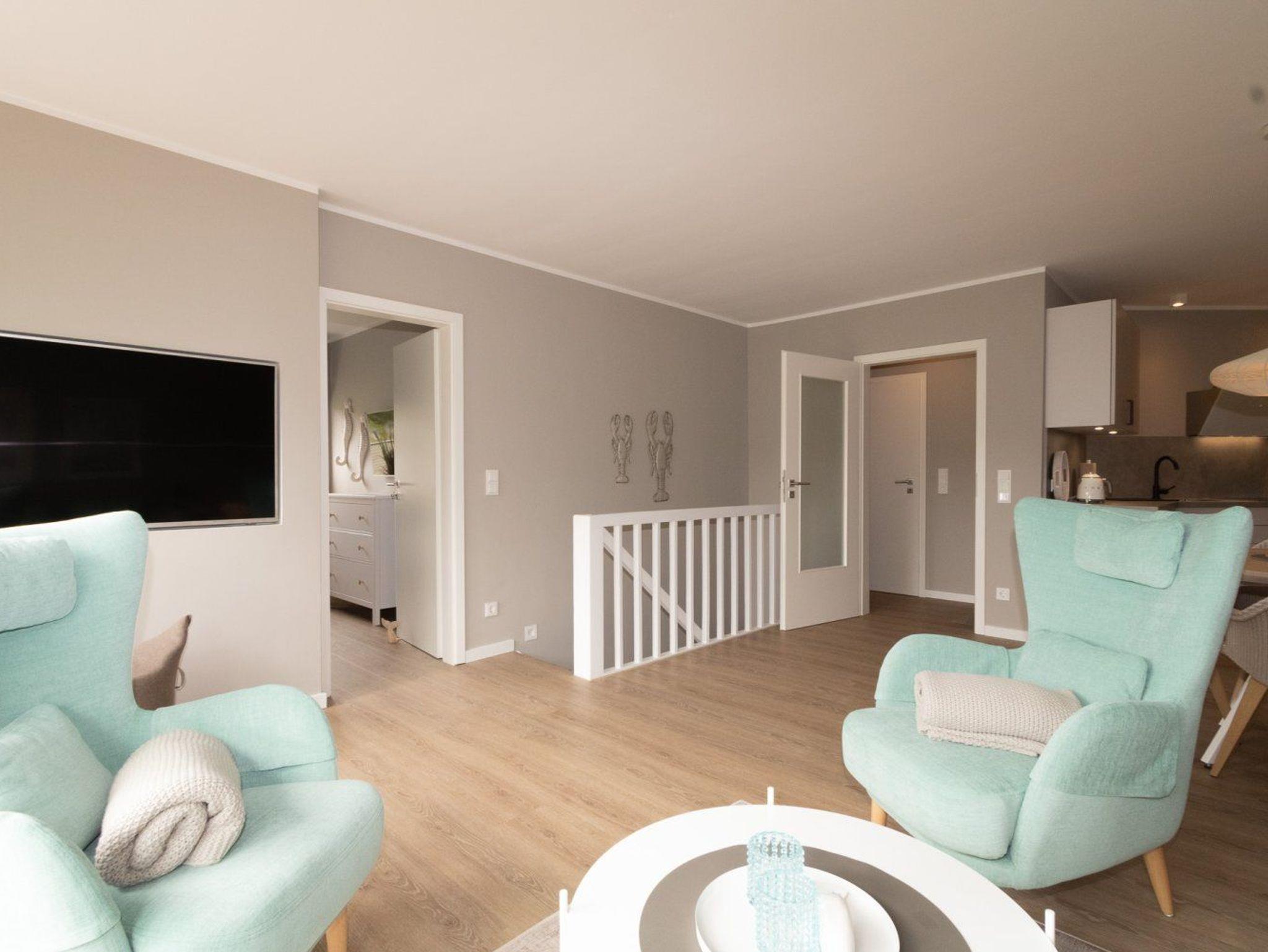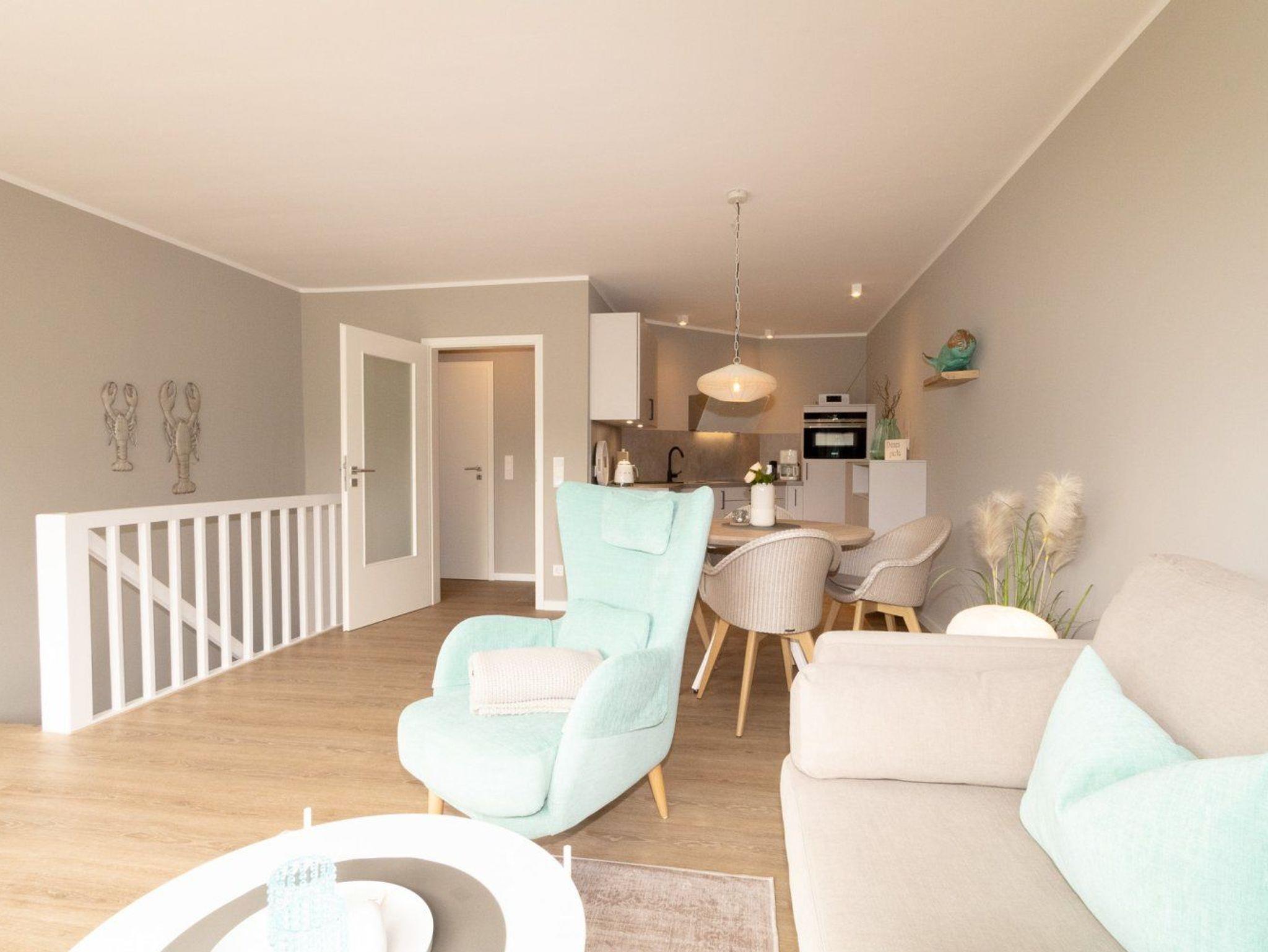 Die Ferienwohnung ist gemütlich eingerichtet und bietet Platz für 4 Personen. Im unteren Bereich der Wohnung finden Sie ein Schlafzimmer und das Duschbad. Angrenzend an den großzügigen Wohnbereich liegt die offene Küche, die modern für den alltäglichen Bedarf eingerichtet ist. Ein besonderes Highlight ist die große Terrasse, die zum Südwesten ausgerichtet ist und die viel Platz für einen sommerlichen Essplatz und einen Strandkorb bietet. Hier kann man die absolute Ruhe mit Blick ins Grüne genießen und die Seele baumeln lassen.