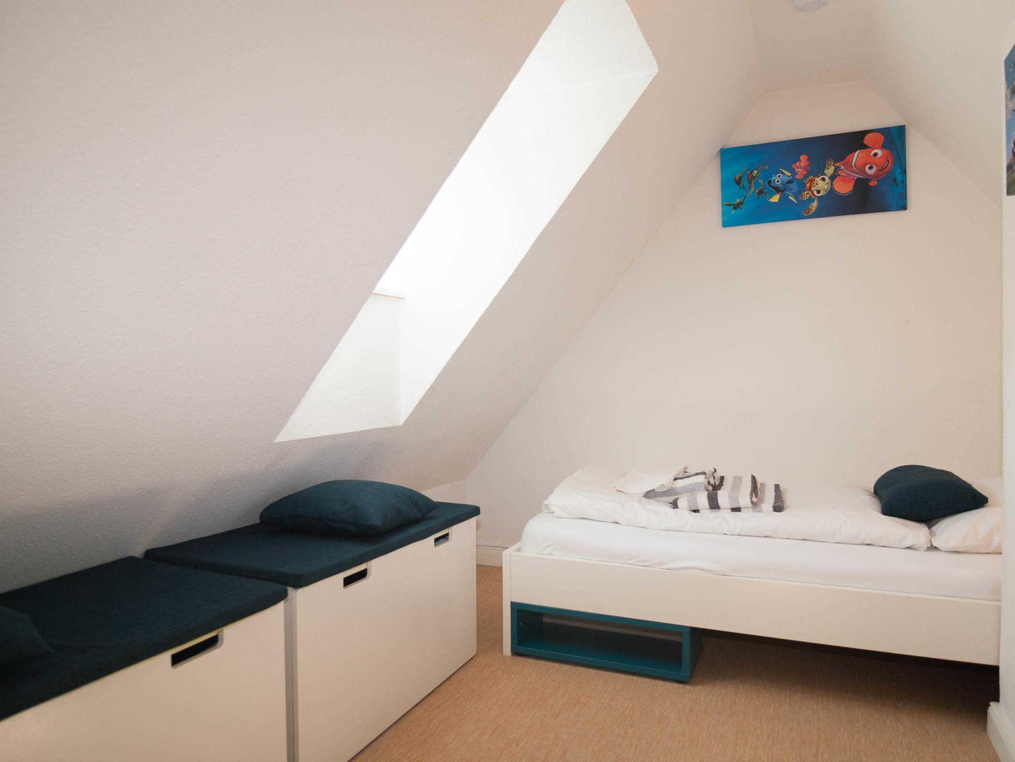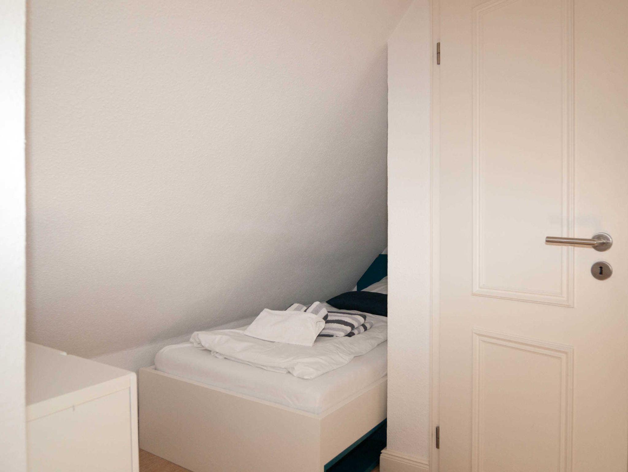 In dieser Ferien-Maisonette im Herzen von Hörnum ist an alles gedacht. Vom Flurbereich gelangen Sie in das Schlafzimmer mit Doppelbett kuschelig unter der Dachschräge.