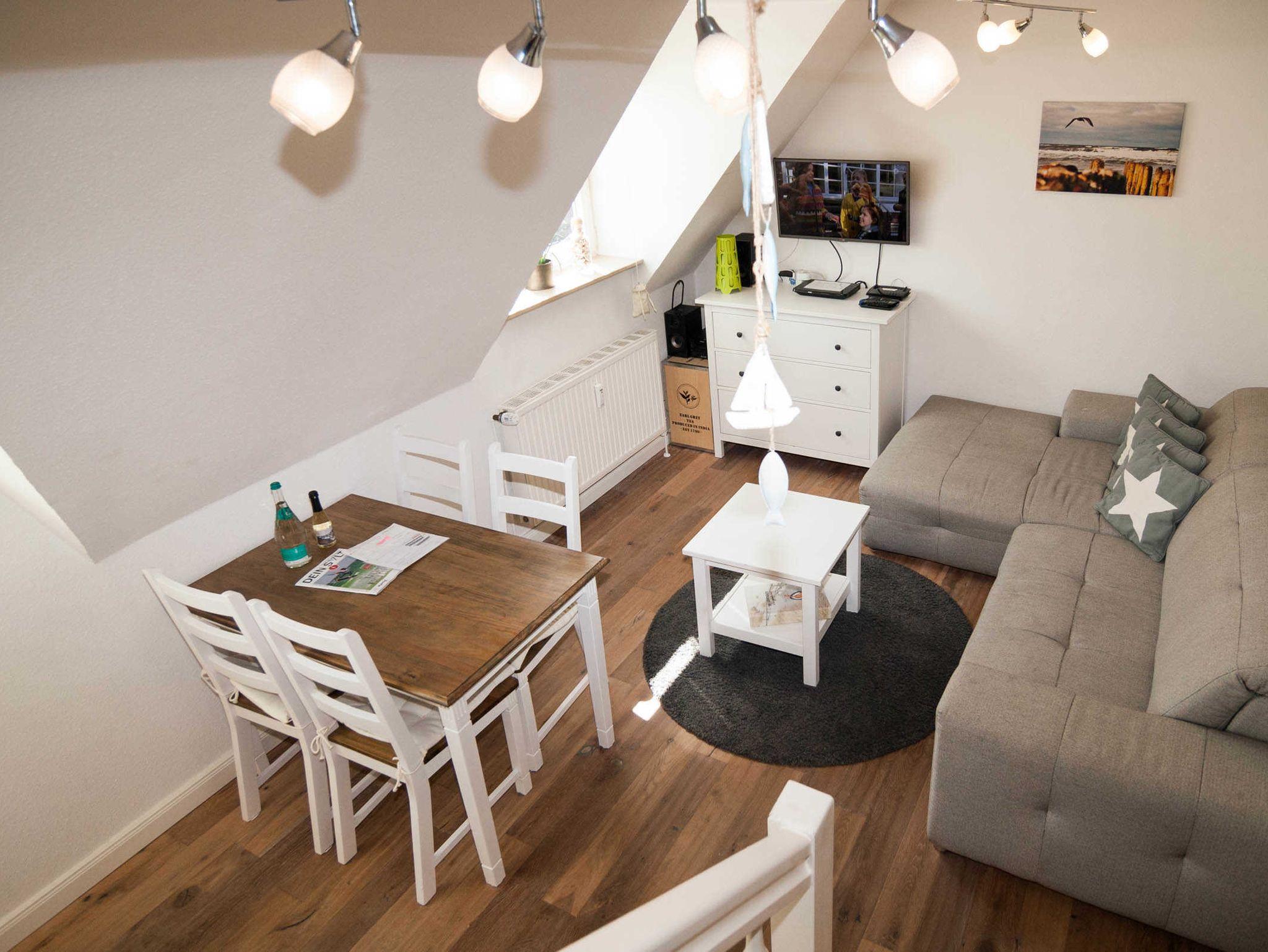 Gegenüber befindet das moderne Duschbad und geradeaus der komfortable Wohnraum mit Esstisch und Küchenzeile. Von dort geht es über die offene Treppe in das 2. Schlafzimmer unter dem Dach, mit Doppelbett, das Erwachsene wie auch Kinder lieben werden.