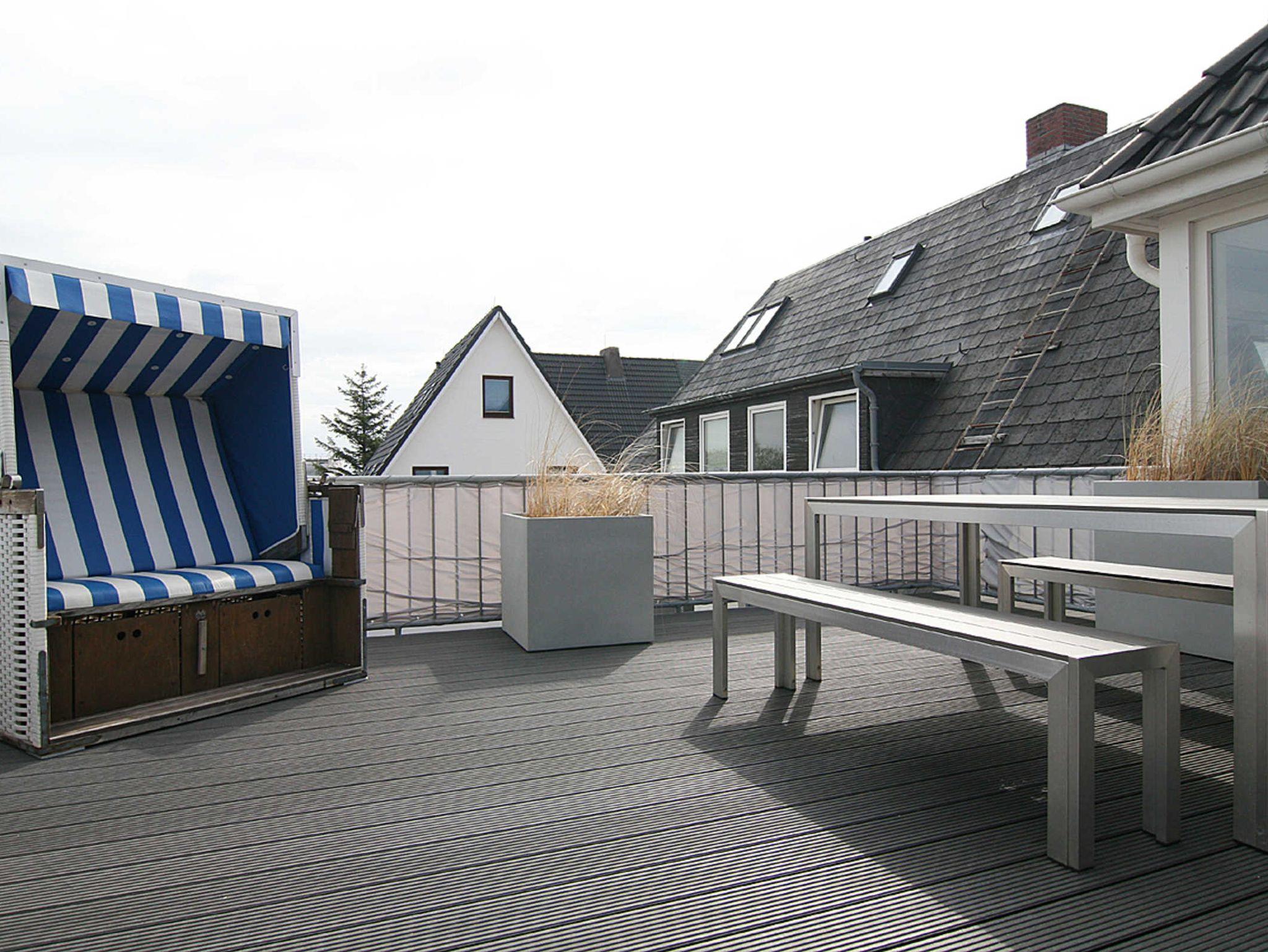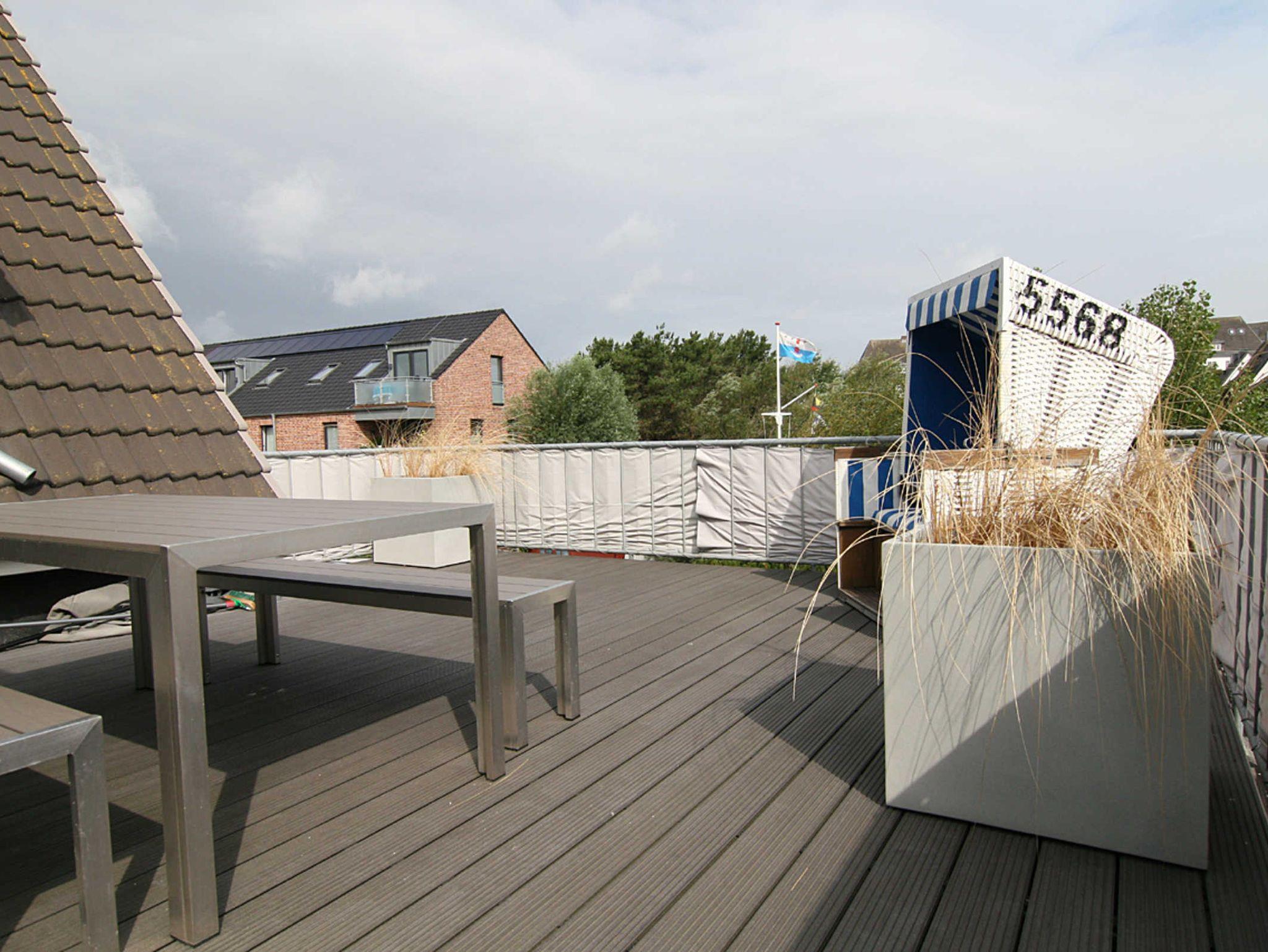 Sie ist sehr geschmackvoll eingerichtet. Zur Ausstattung gehört ein separates Schlafzimmer mit Doppelbett und Küchenzeile, ein sep. Duschbad und eine große Dachterrasse.