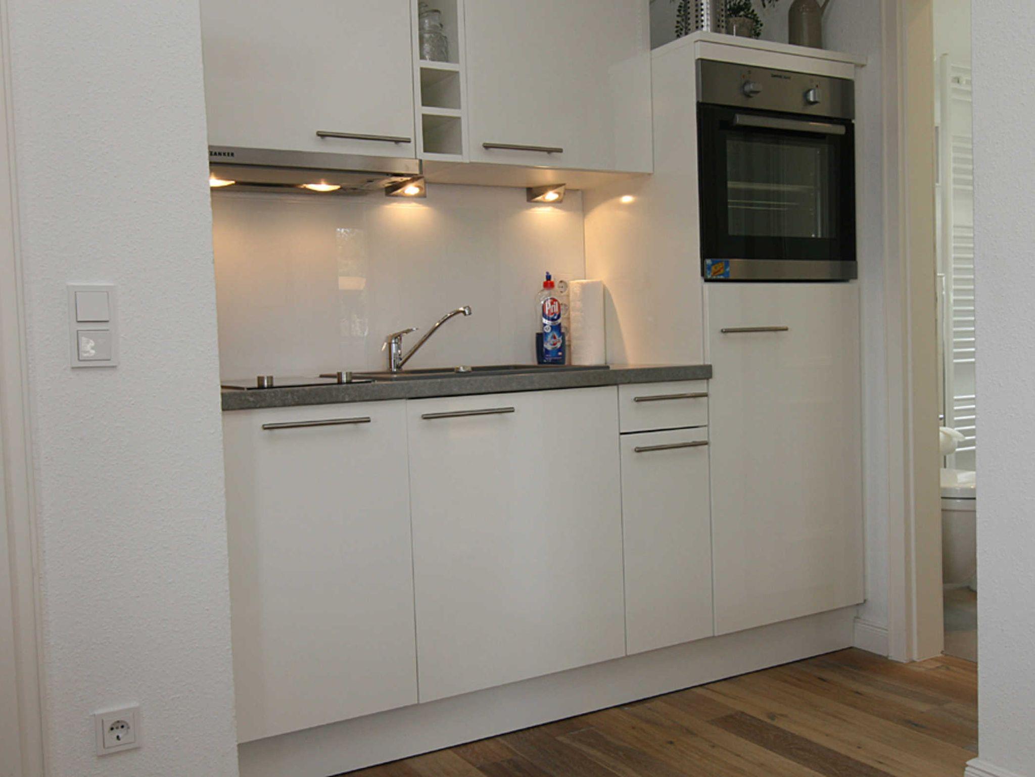Die Küchenzeile ist komplett ausgestattet mit 2-Platten-Cerankochfeld, Geschirrspüler, Wasserkocher, Toaster und was das Herz noch so begehrt.