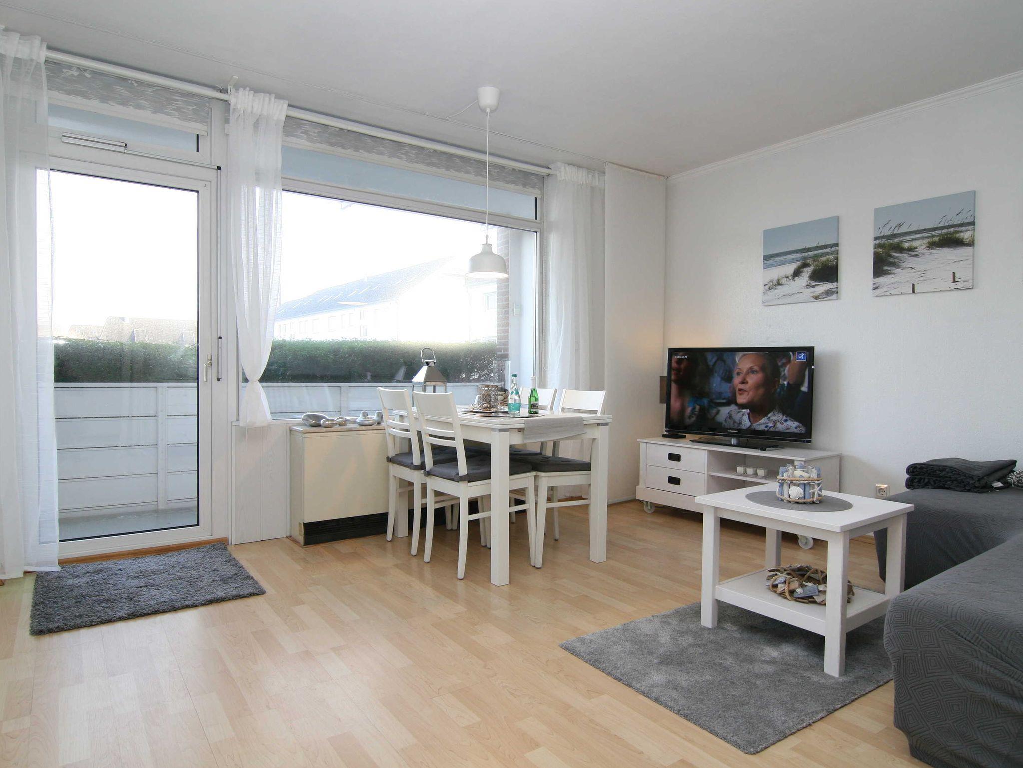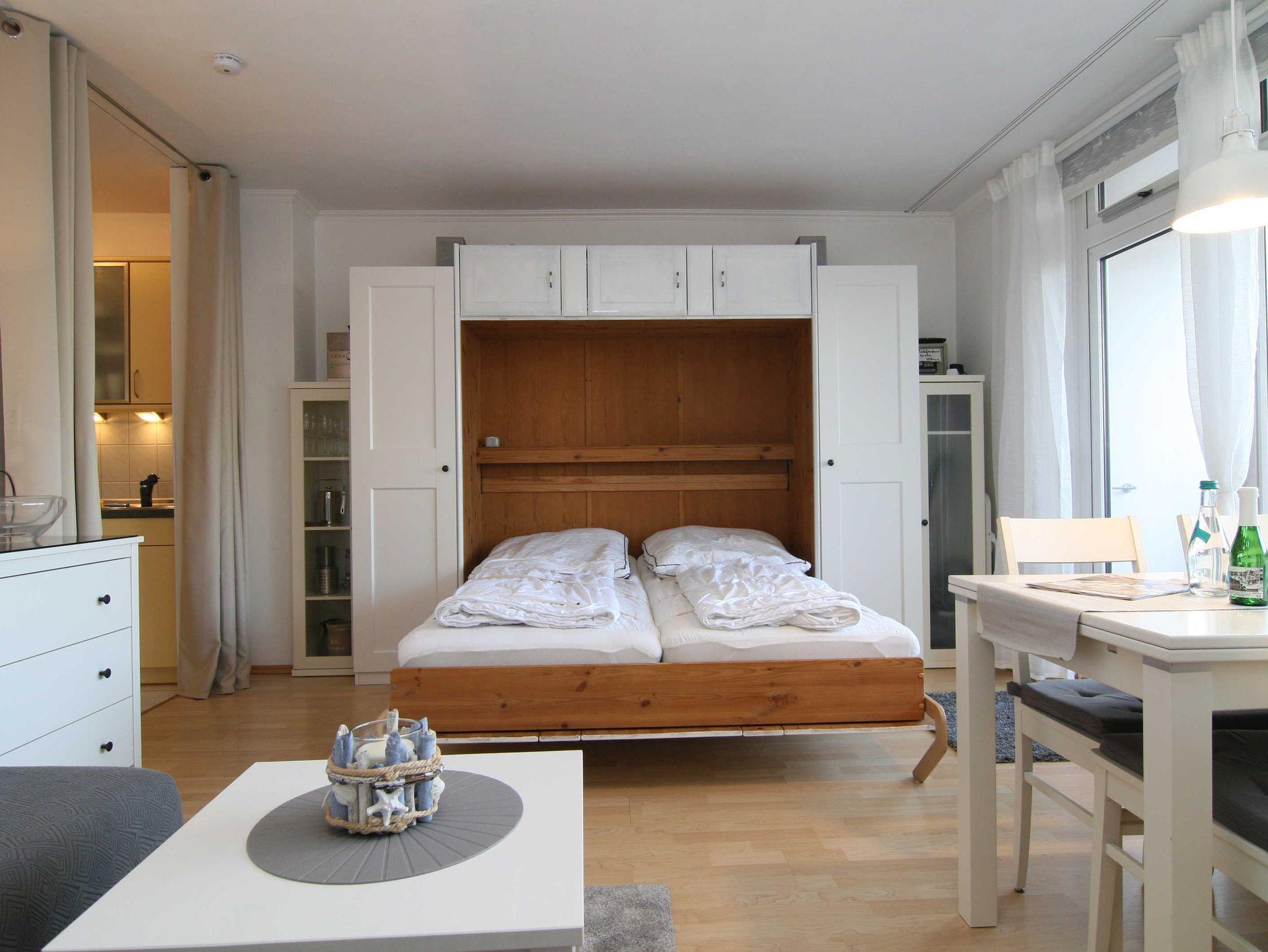 Diese Wohnung verfügt über ein großes, helles Wohnzimmer wo gleichzeitig ein Schrankbett zum Schlafen mit integriert ist. Eine großzügige Sofaecke mit angrenzendem Sitzbereich lässt keine Wünsche für einen schönen Urlaub offen. Von hier aus betreten Sie auch den Balkon, der nach Osten ausgerichtet ist. Den ganzen Morgen können Sie hier die Sonne geniessen. Eine Küchenzeile, mit sehr guter Ausstattung und das Duschbad, runden das Bild von einer modernen Ferienwohnung ab. Suchen Sie etwas Besonderes zu einem moderaten Preis, dann sind Sie hier genau richtig.