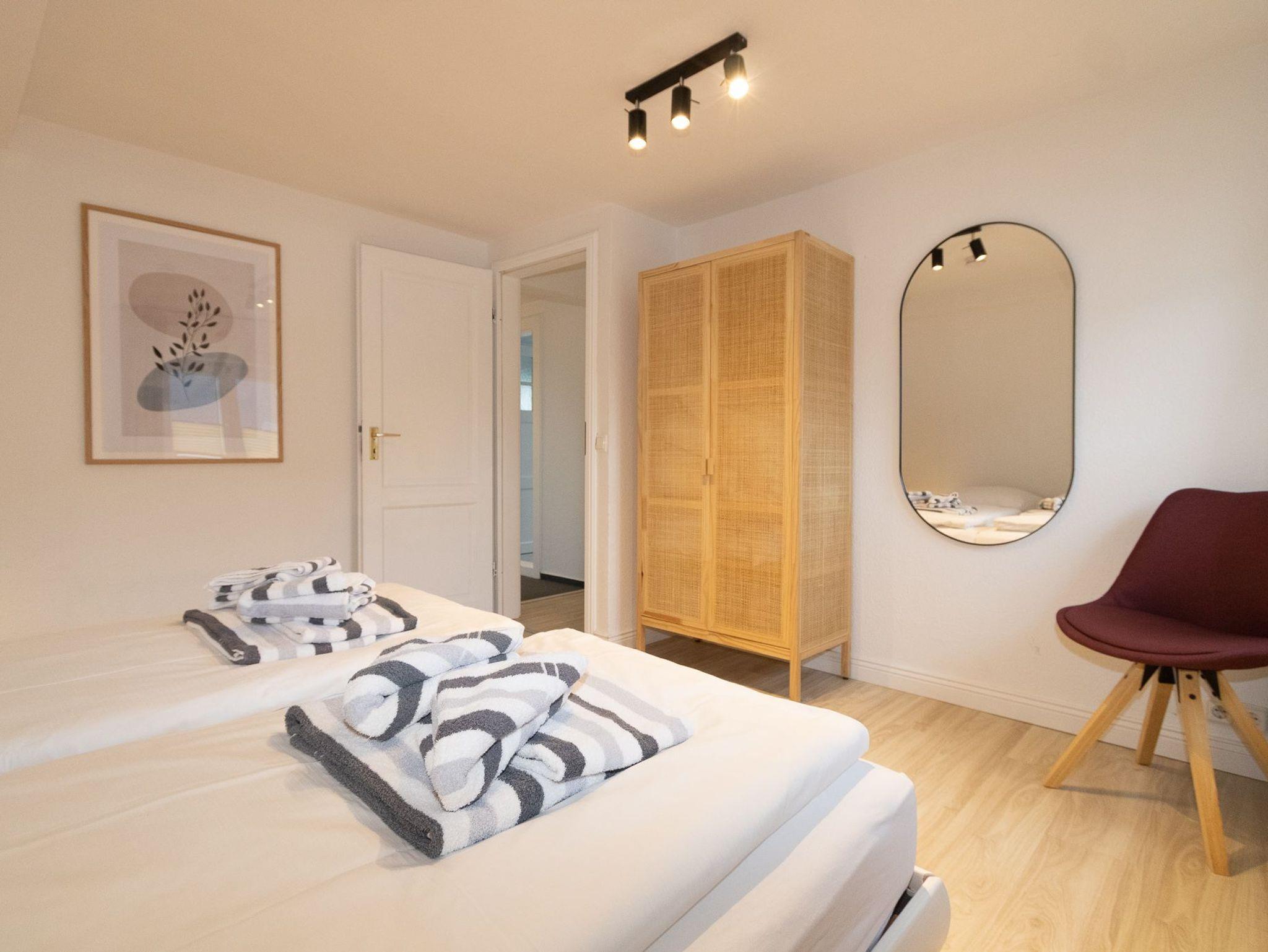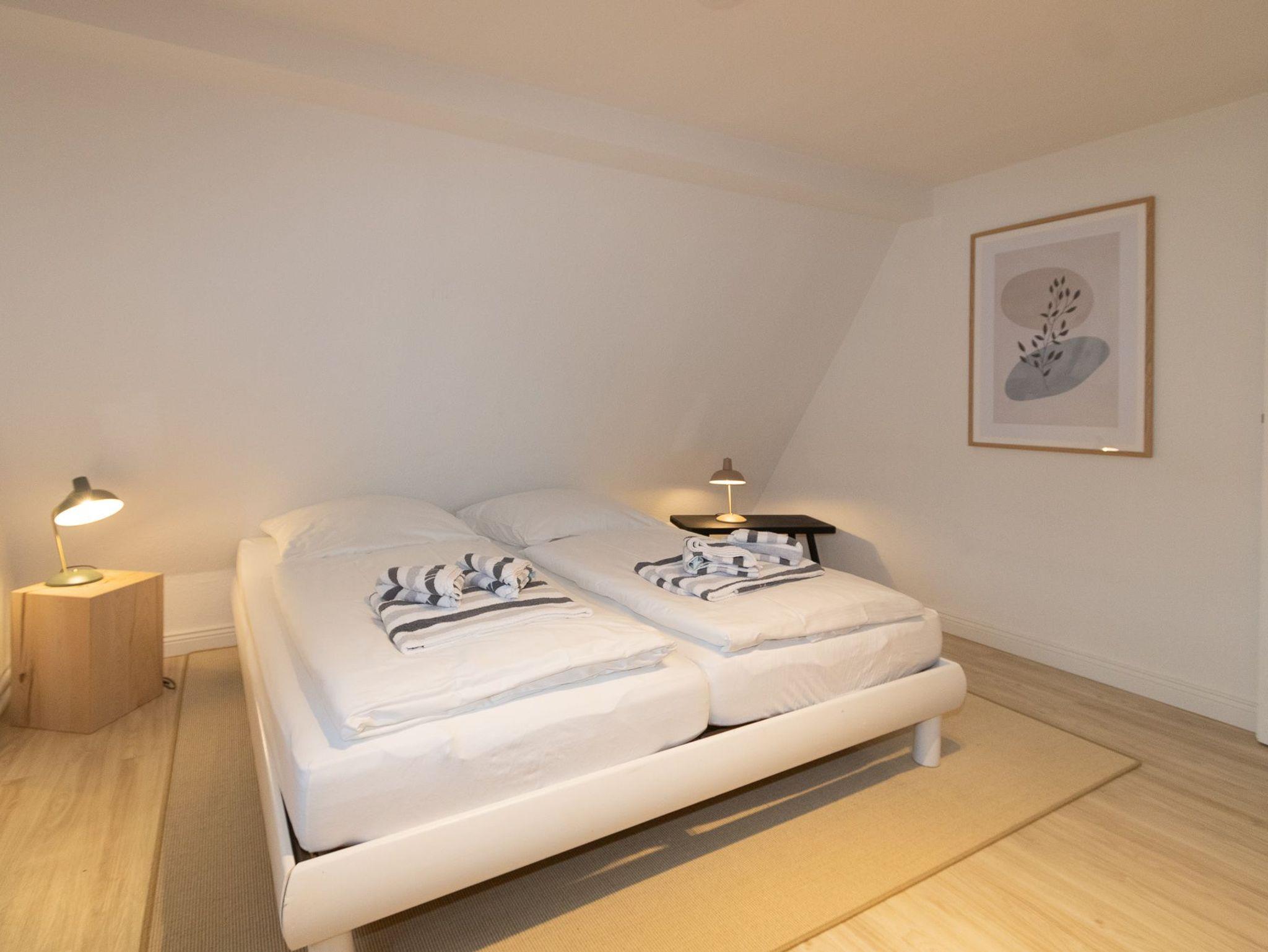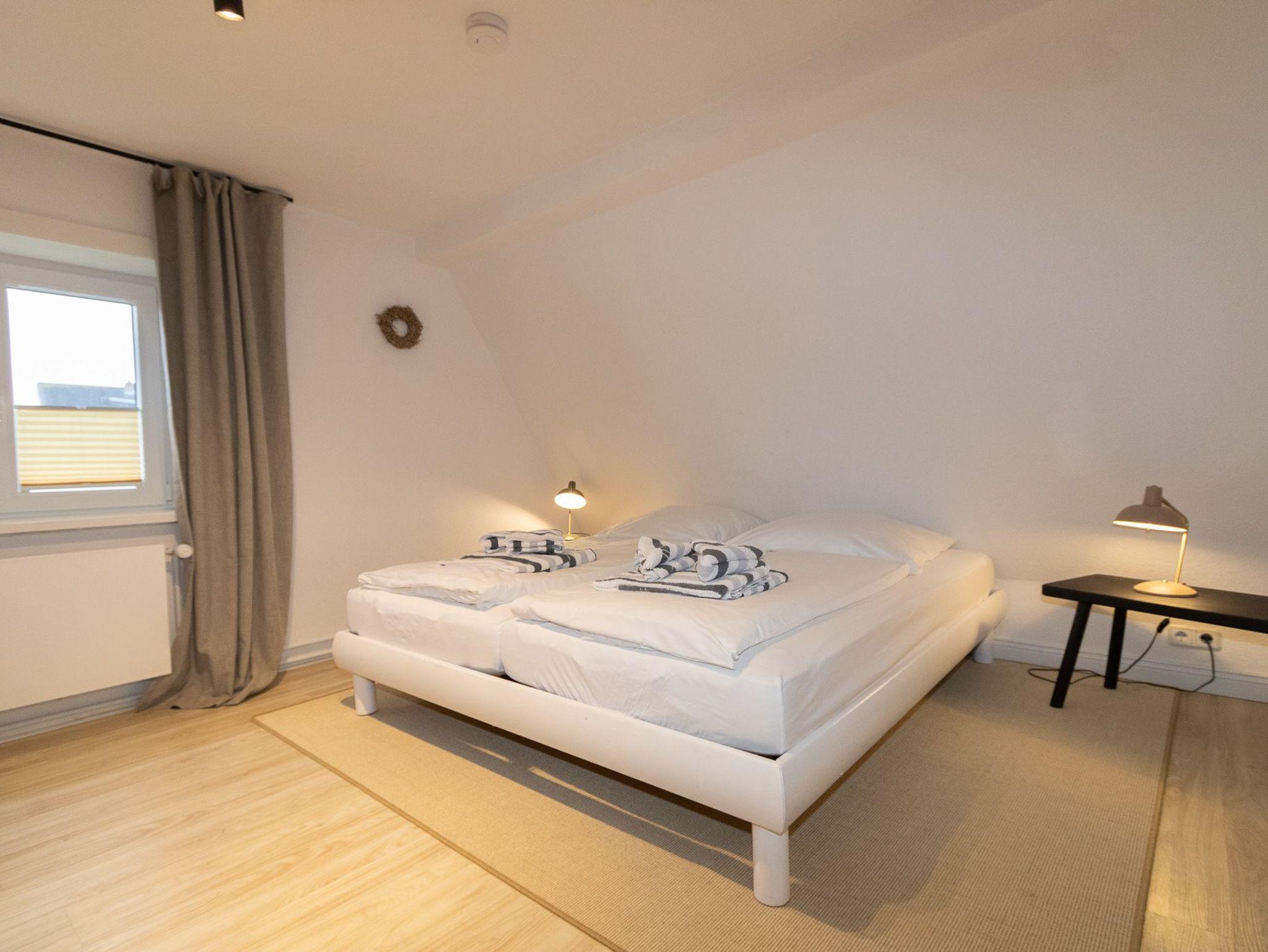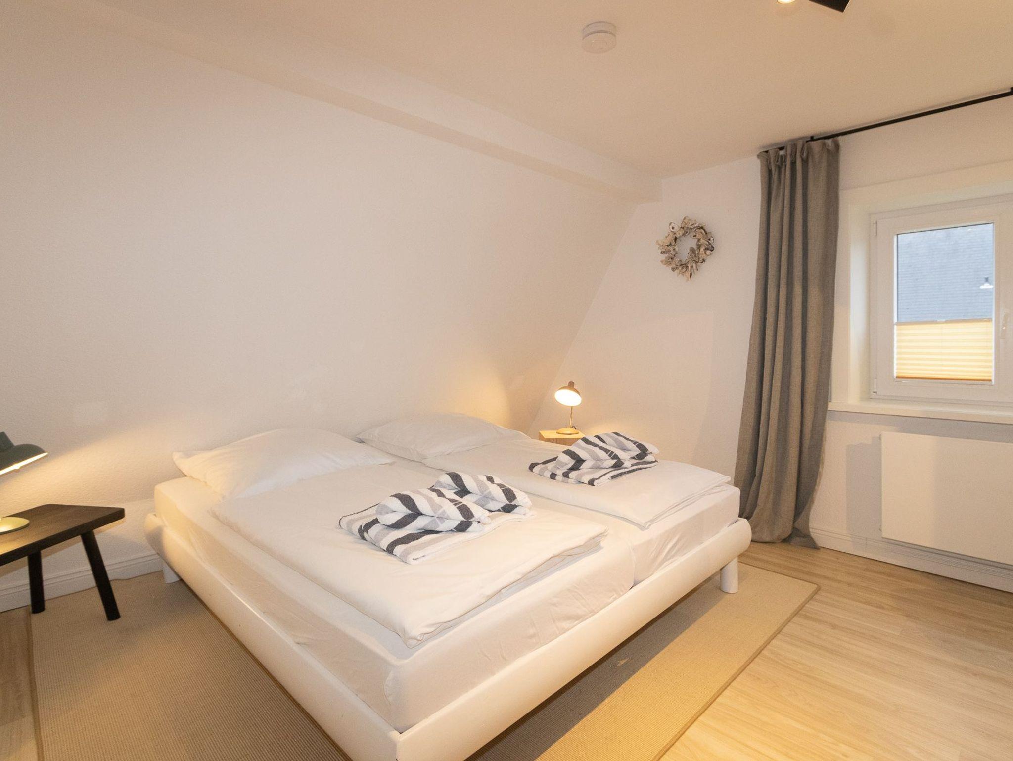 Im 1. OG befinden sich zwei Schlafzimmer mit Doppelbetten, 1 sep.Raum für ein Zustellbett oder Kinderreisebett und ein Wannenbad.